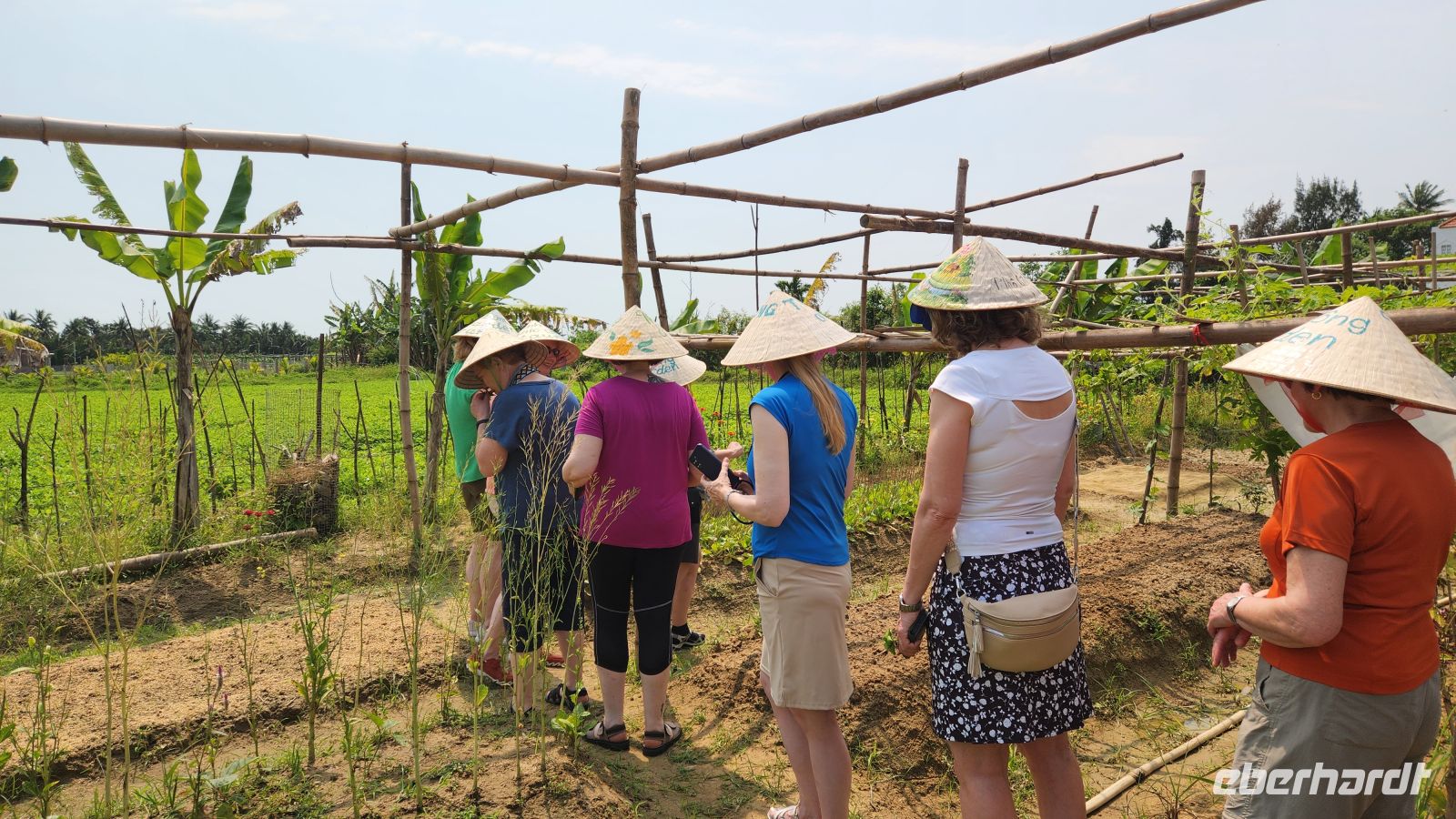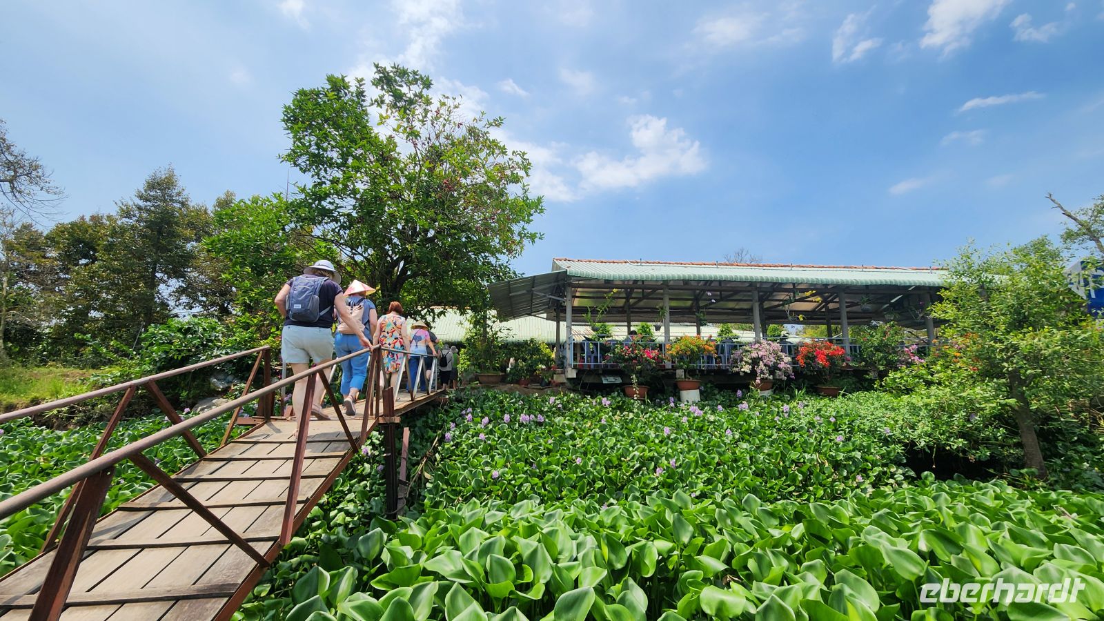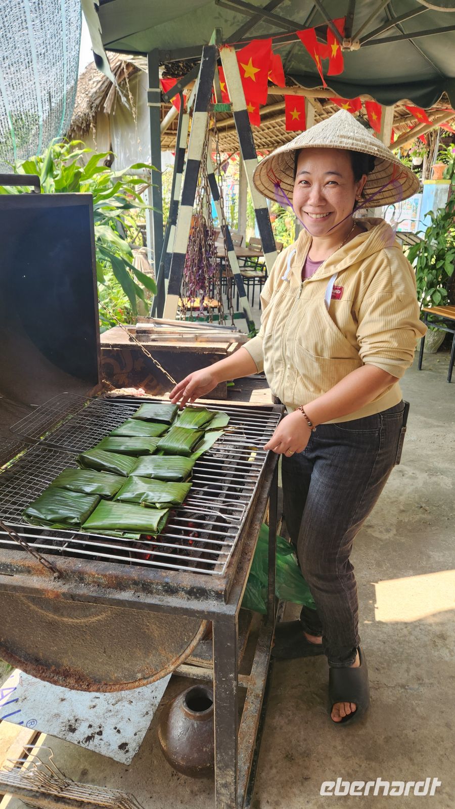 Direkt vom Bootsanleger laufen wir zu einem Restaurant, das an einen Kräuter- und Gemüsegarten grenzt. Dort erklärt man uns viel über die frischen Pflanzen, die wir gleich verwenden werden. Jeder von uns erhält eine Schürze und eine Kochmütze, und unsere Chefköchin – die Großmutter der Familie – leitet uns geduldig an. Auf dem Programm stehen Banh Xeo - vietnamesische Pancakes, sowie Gemüse mit Shrimps und Fleisch. Jeder bekommt einen kleinen Gaskocher und einen eigenen Kochtopf. Alle Zutaten werden genau erklärt, und wir dürfen selbst Hand anlegen. Alles findet in einem überdachten Außenbereich statt, umgeben von Grün und einer ruhigen, friedlichen Atmosphäre.
