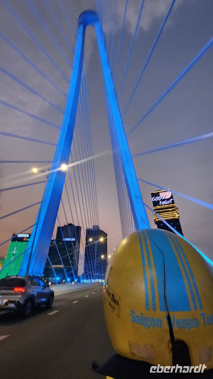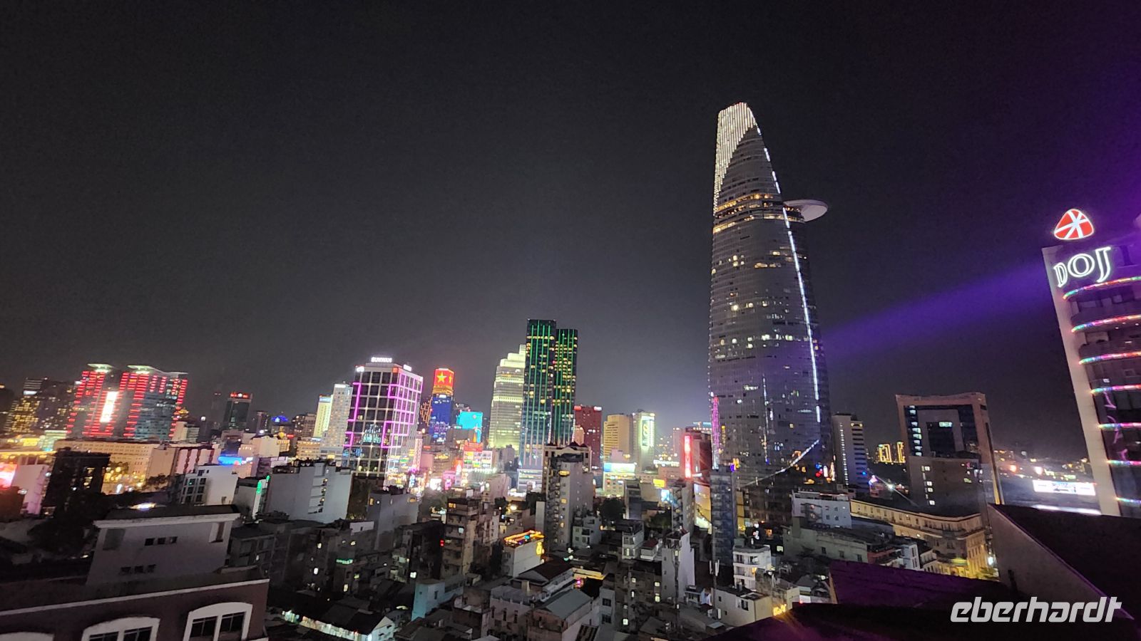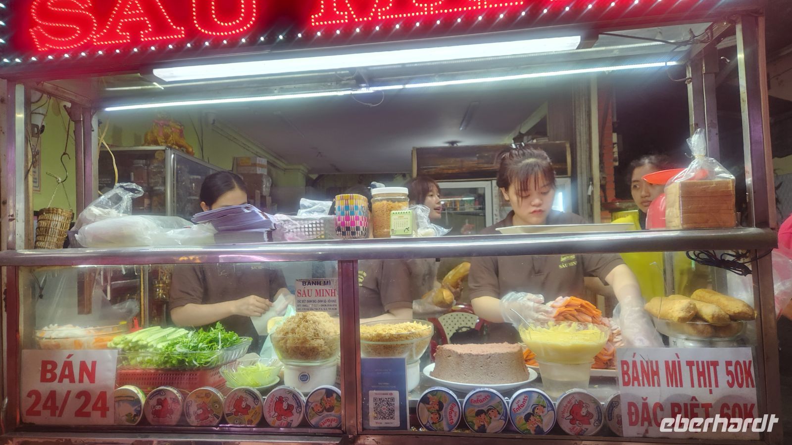 Während der Tour winken wir uns gegenseitig zu und machen Erinnerungsfotos. Zwischendrin legen wir Stopps ein: Zuerst besuchen wir eine Rooftop-Bar und genießen einen atemberaubenden Blick über das nächtliche Saigon. Danach halten wir an einem Streetfood-Stand und probieren Bánh Mì, ein vietnamesisches Baguette-Sandwich, das mit Fleisch, frischem Gemüse und Kräutern gefüllt ist – einfach köstlich. Weiter geht es in ein einfaches, aber sehr gutes Seafood-Restaurant, bevor wir noch ein Schokoladengeschäft besuchen und dort heiße Schokolade genießen.