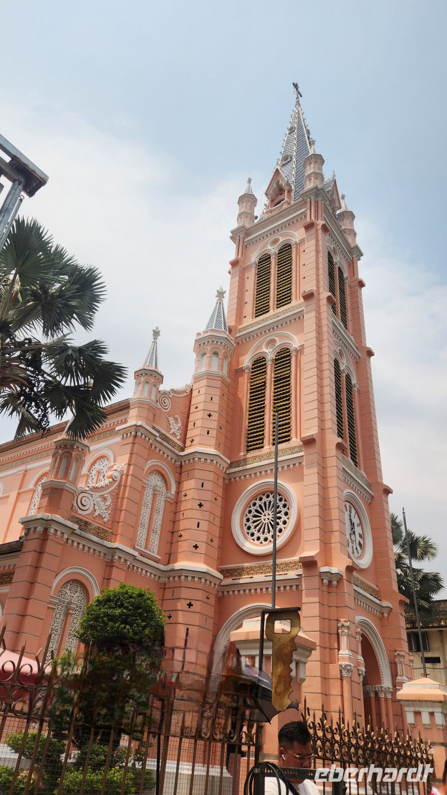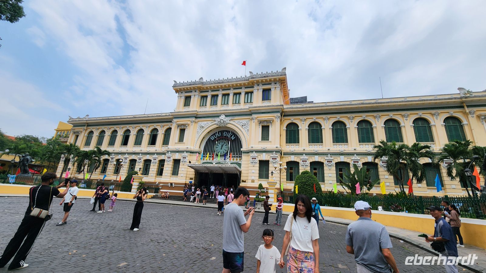 Unser erster Halt ist die „Tan Binh Parish Church“, eine rosafarbene Kirche, die wirklich in einem knalligen Rosa erstrahlt. Weiter geht es zur Notre-Dame-Kathedrale, die gerade eingerüstet ist, und dann zum berühmten Hauptpostamt der Stadt. Dieses imposante Gebäude wurde Ende des 19. Jahrhunderts von einem französischen Architekten entworfen. Im Inneren gibt es wunderschöne hohe Decken, dekorative Wandkarten und historische Telefonanlagen – ein echtes Stück Kolonialgeschichte mitten in der Stadt.