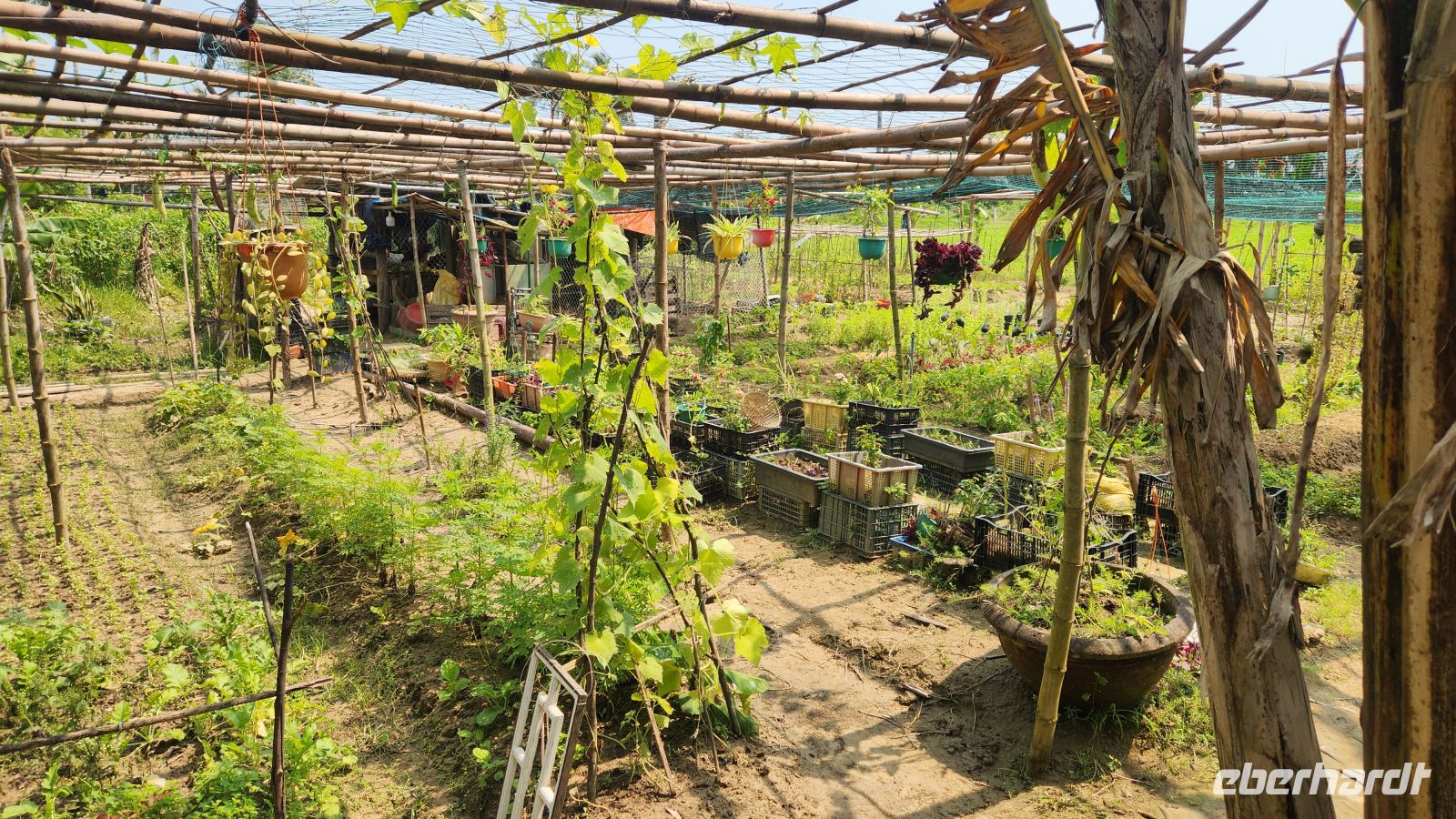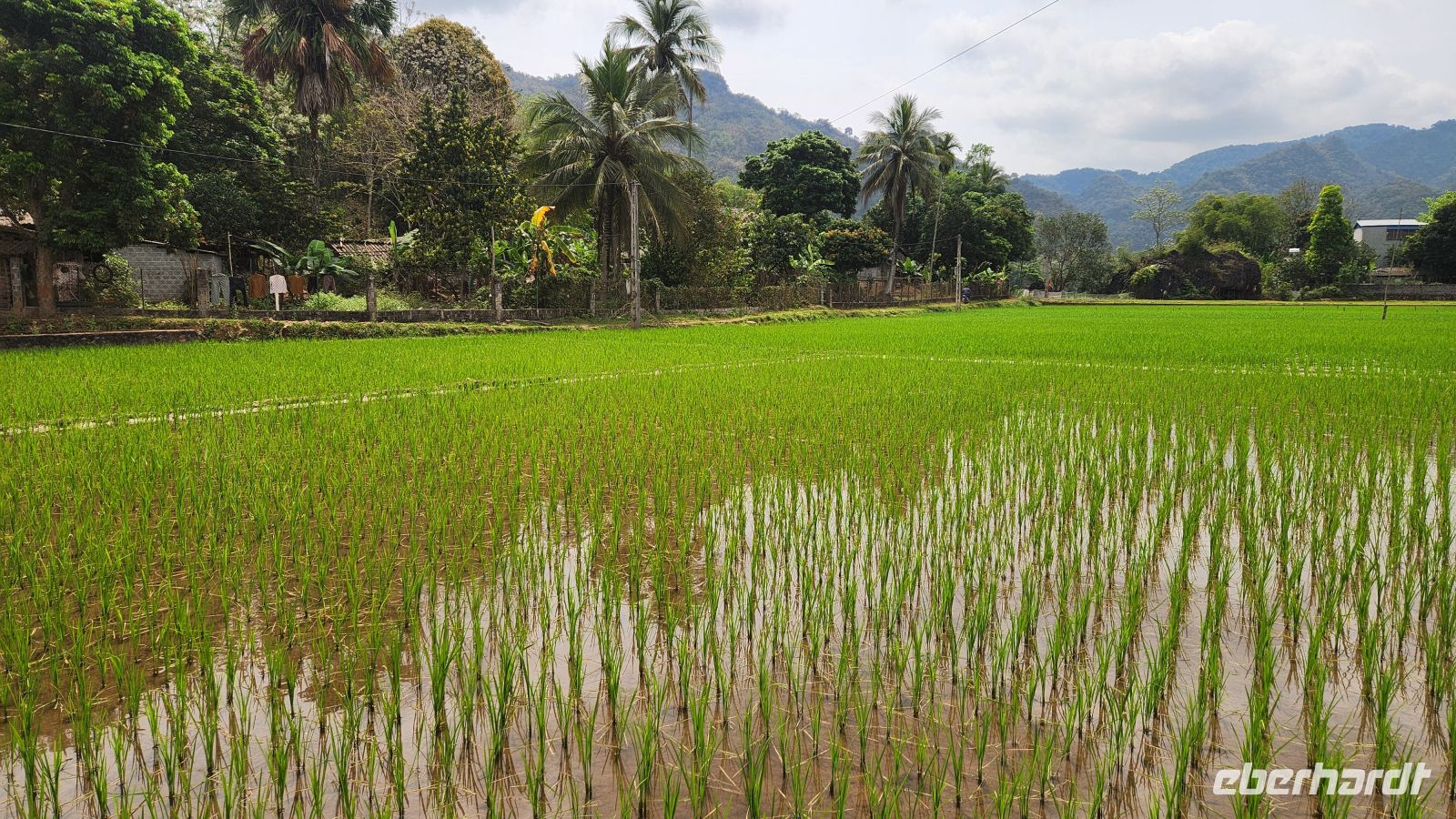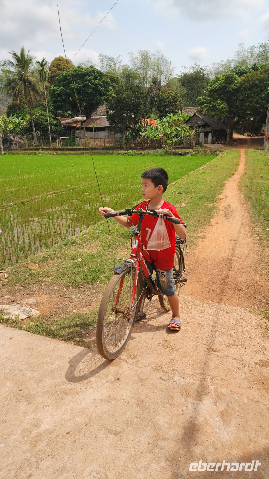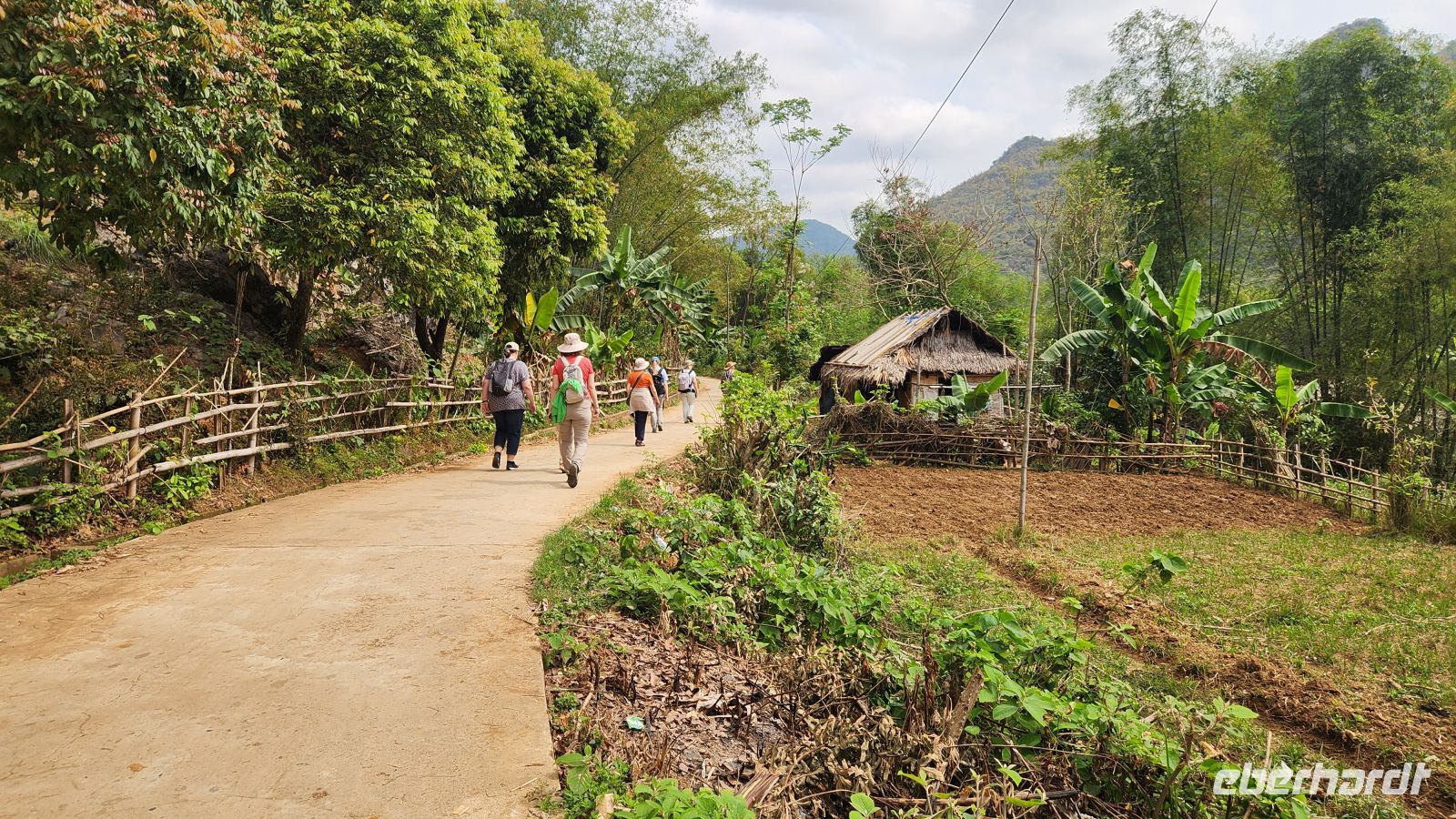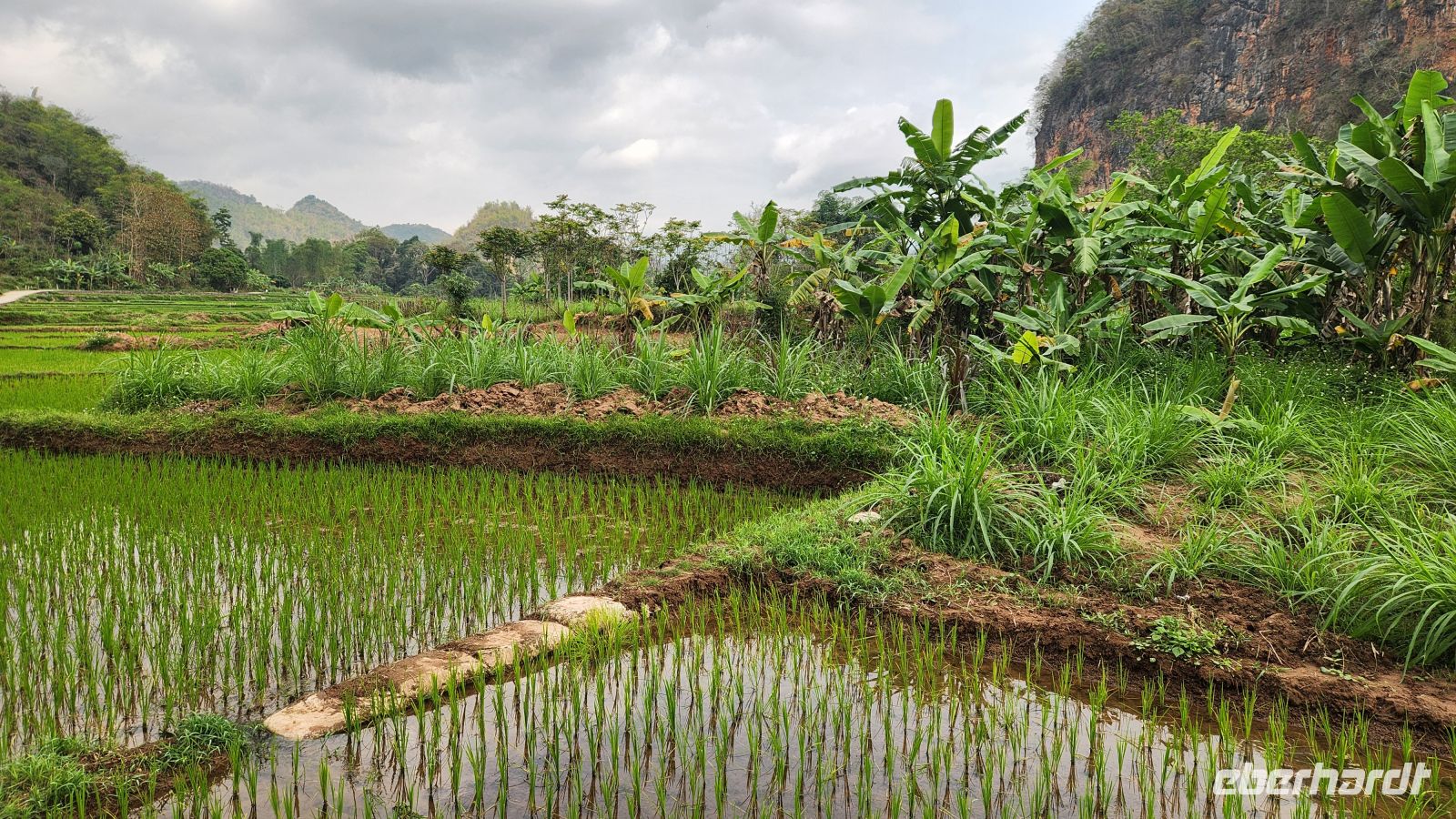 Am Vormittag unternehmen wir eine leichte Wanderung durch die umliegenden Felder. Wir laufen vorbei an saftig grünen Reisfeldern und sehen auch andere Anbauflächen, zum Beispiel mit Erdnüssen. Unterwegs beobachten wir die Bauern bei ihrer Arbeit. Vieles wird hier noch auf ganz traditionelle und einfache Weise erledigt – oft mit reiner Muskelkraft. Uns wird schnell bewusst, wie anstrengend diese Arbeit ist, und wir bewundern die Menschen sehr für ihren täglichen Einsatz.
