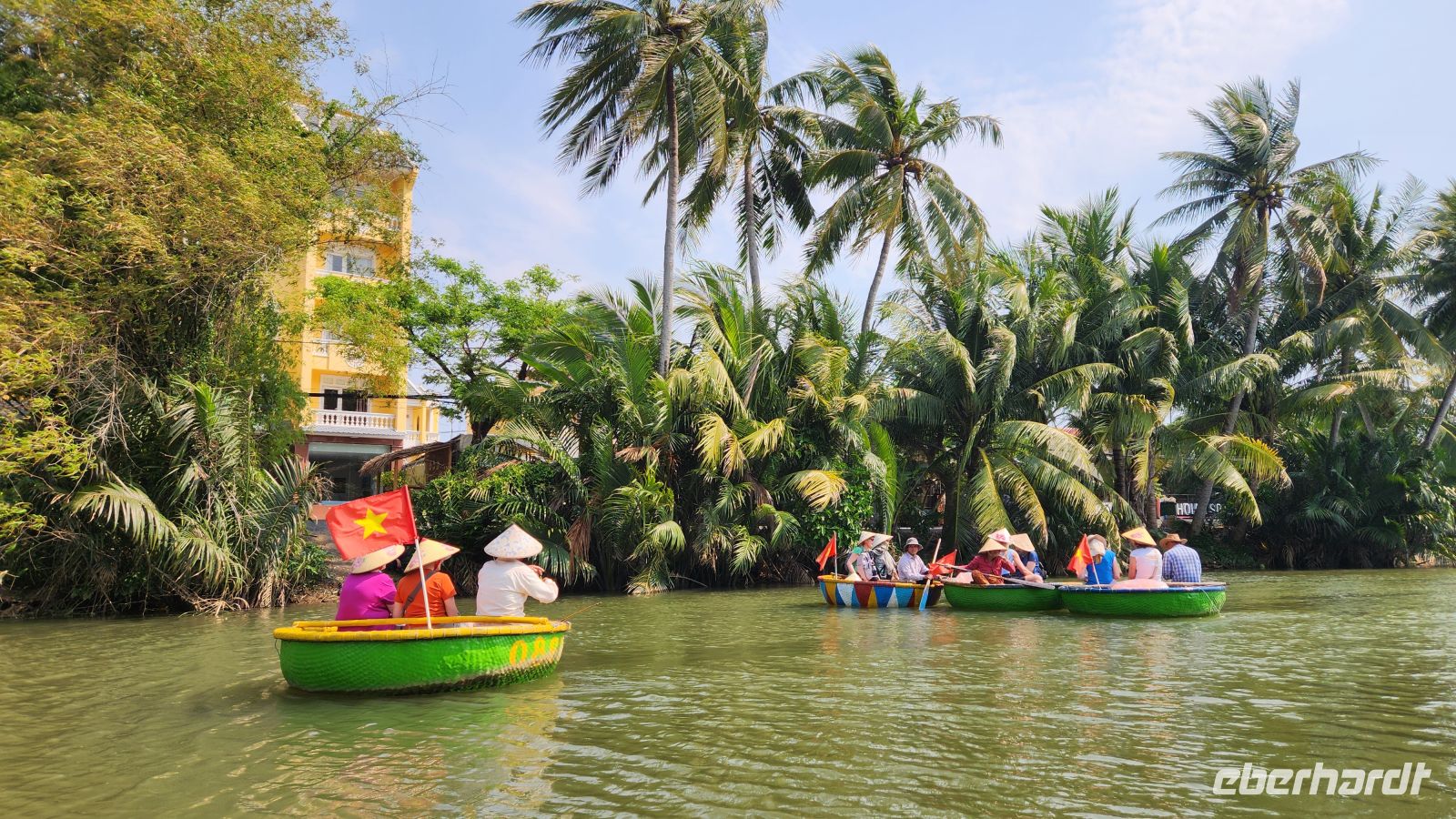 Der Großteil der Gruppe hat sich hingegen für den fakultativen Kochkurs entschieden. Wir fahren ein kleines Stück mit dem Fahrrad durch ein grünes Gartengebiet der Stadt und erreichen einen kleinen Bootssteg. Dort steigen wir in die sogenannten „Kokosnuss-Boote“. Diese runden, stabilen Holzboote haben die Form einer halben Kokosnuss und werden mit Paddeln gesteuert. Sie sind besonders gut geeignet, um ruhig über die Flüsse Hoi Ans zu gleiten und bieten ein ganz eigenes, idyllisches Erlebnis. Während der Fahrt genießen wir die grüne Umgebung und die friedliche Stimmung. Auf dem Rückweg sorgen die Bootsleute mit lauter, fröhlicher Musik für viel Spaß und Gelächter – alle haben großen Spaß zusammen.