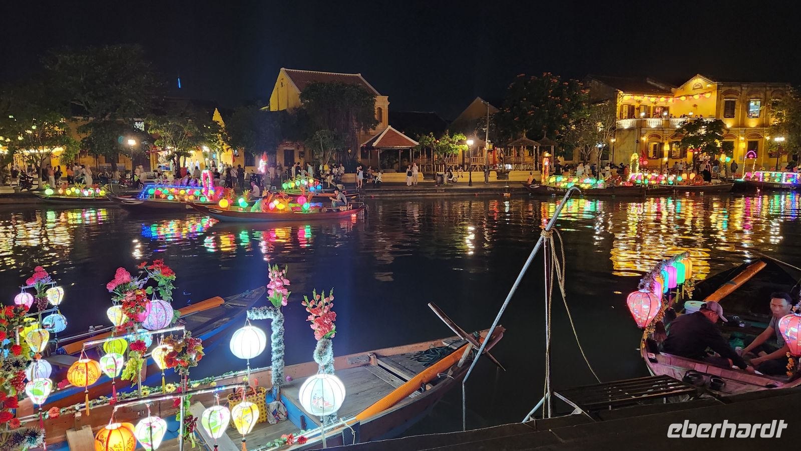 Danach ist es nur ein kurzer Weg zum Fluss. Dort bietet sich uns ein ganz besonderes Bild: Unzählige kleine Boote, geschmückt mit bunten Lampions, gleiten über das Wasser. Auch wir steigen in ein Boot und lassen uns ruhig über den Fluss treiben. Die Lichter spiegeln sich im Wasser – eine wunderschöne, fast magische Atmosphäre.