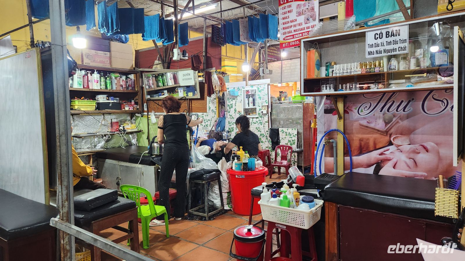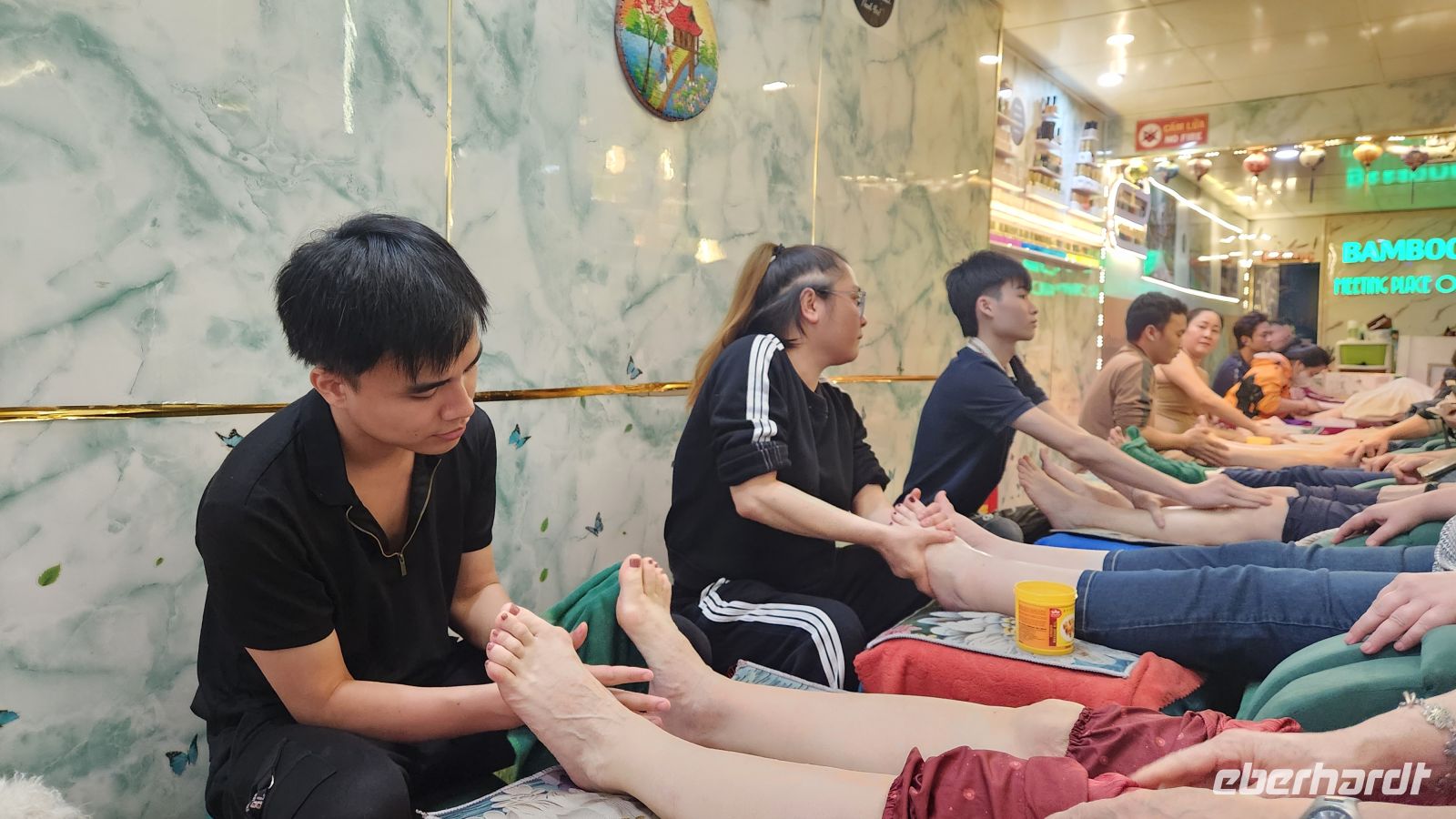 Danach haben wir etwas Freizeit, entscheiden uns aber, zusammen zu bleiben. Gemeinsam ziehen wir weiter und gönnen uns etwas Besonderes: eine Fußmassage. Zehn von uns sitzen nebeneinander in bequemen Sesseln und lassen sich verwöhnen. Es ist ein lustiger Moment, denn innerhalb kürzester Zeit organisiert das Spa zehn Masseure, die alle auf Mopeds ankommen – das sorgt natürlich für große Begeisterung bei uns.