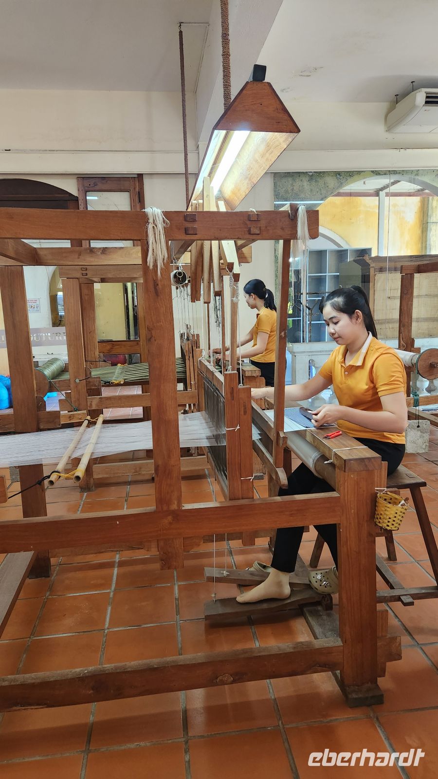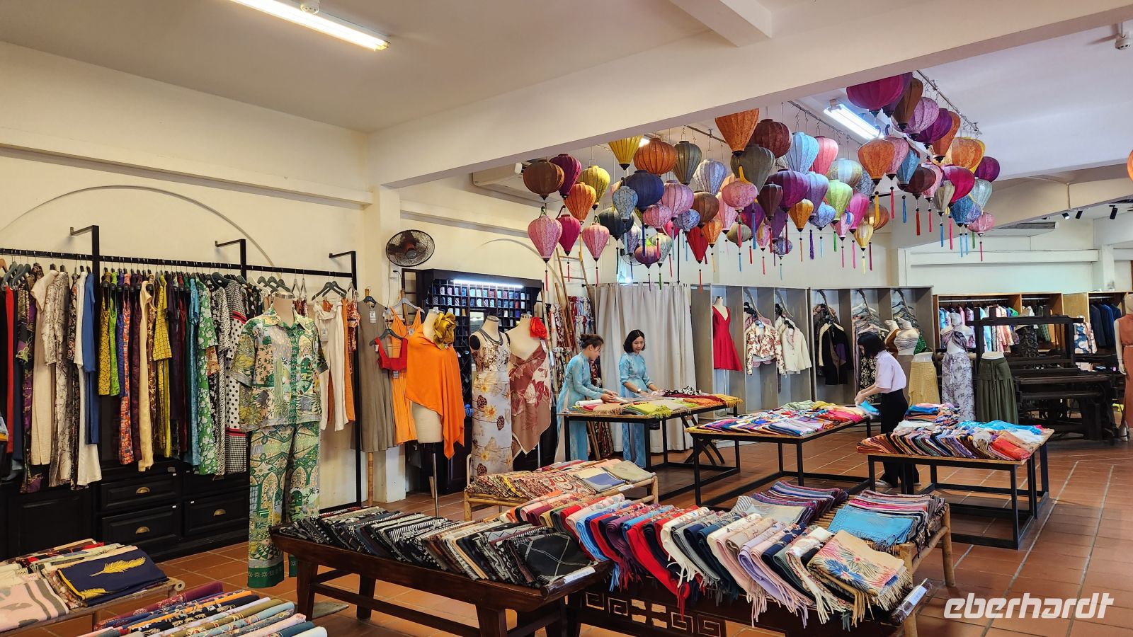 Am Morgen begrüßt uns Lam fröhlich vor unserem Hotel. Heute wird er uns durch das wunderschöne Hoi An führen. Unser erster Halt ist eine Seidenfabrik. Dort sehen wir, wie aus feinen Fäden edle Stoffe entstehen – von der Seidenraupe bis zum fertigen Kleidungsstück. Anschließend besuchen wir ein Ledergeschäft, in dem Maßanfertigungen möglich sind, und bewundern die handwerkliche Arbeit.