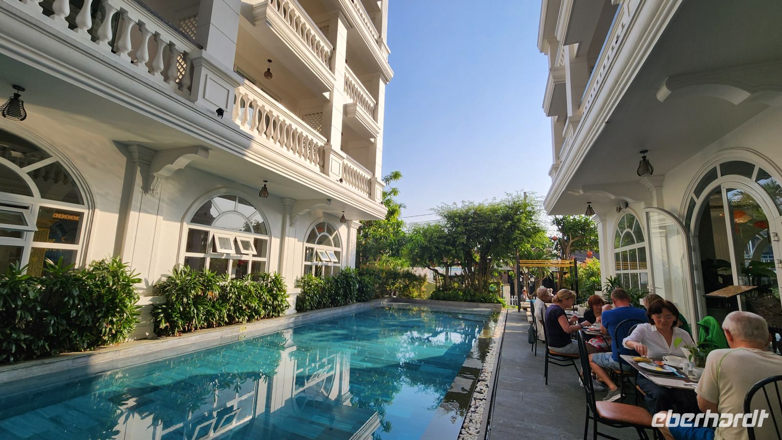 Die Hitze in Kambodscha ist sehr intensiv, und wir spüren, wie anstrengend dieser Tag ist. Am Nachmittag legen wir deshalb eine kurze Pause in unserem schönen Hotel ein. Die meisten von uns springen zur Abkühlung in den Swimmingpool und genießen einen Moment der Ruhe.