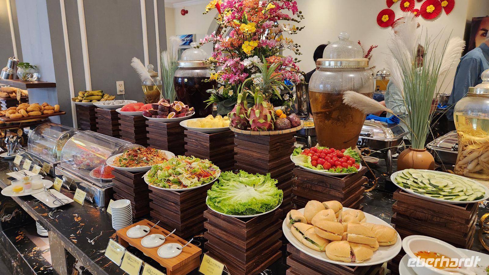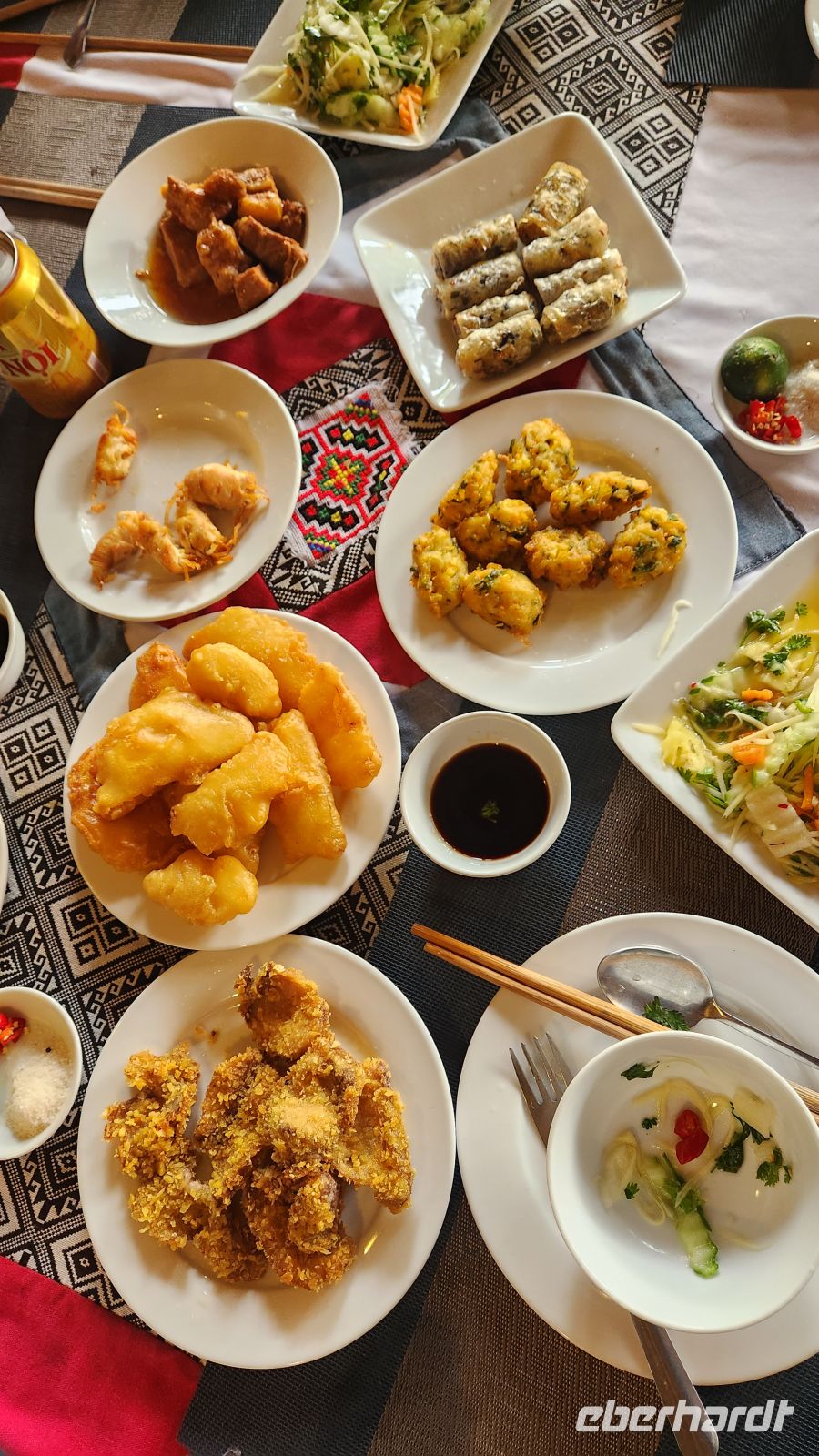 Am Ende unseres langen Spaziergangs erreichen wir unser Restaurant. Dort genießen wir unser erstes gemeinsames Abendessen. Typisch vietnamesisch werden alle Speisen in die Mitte des Tisches gestellt und geteilt. Es ist bunt, vielfältig und unglaublich lecker – und vor allem sehr gesellig.