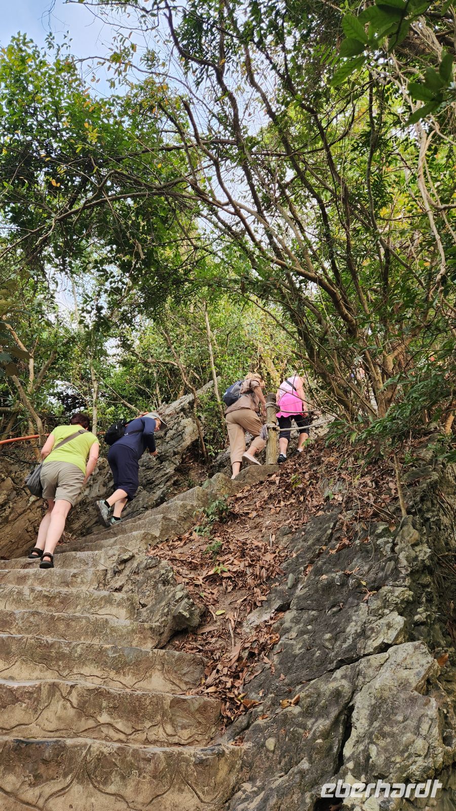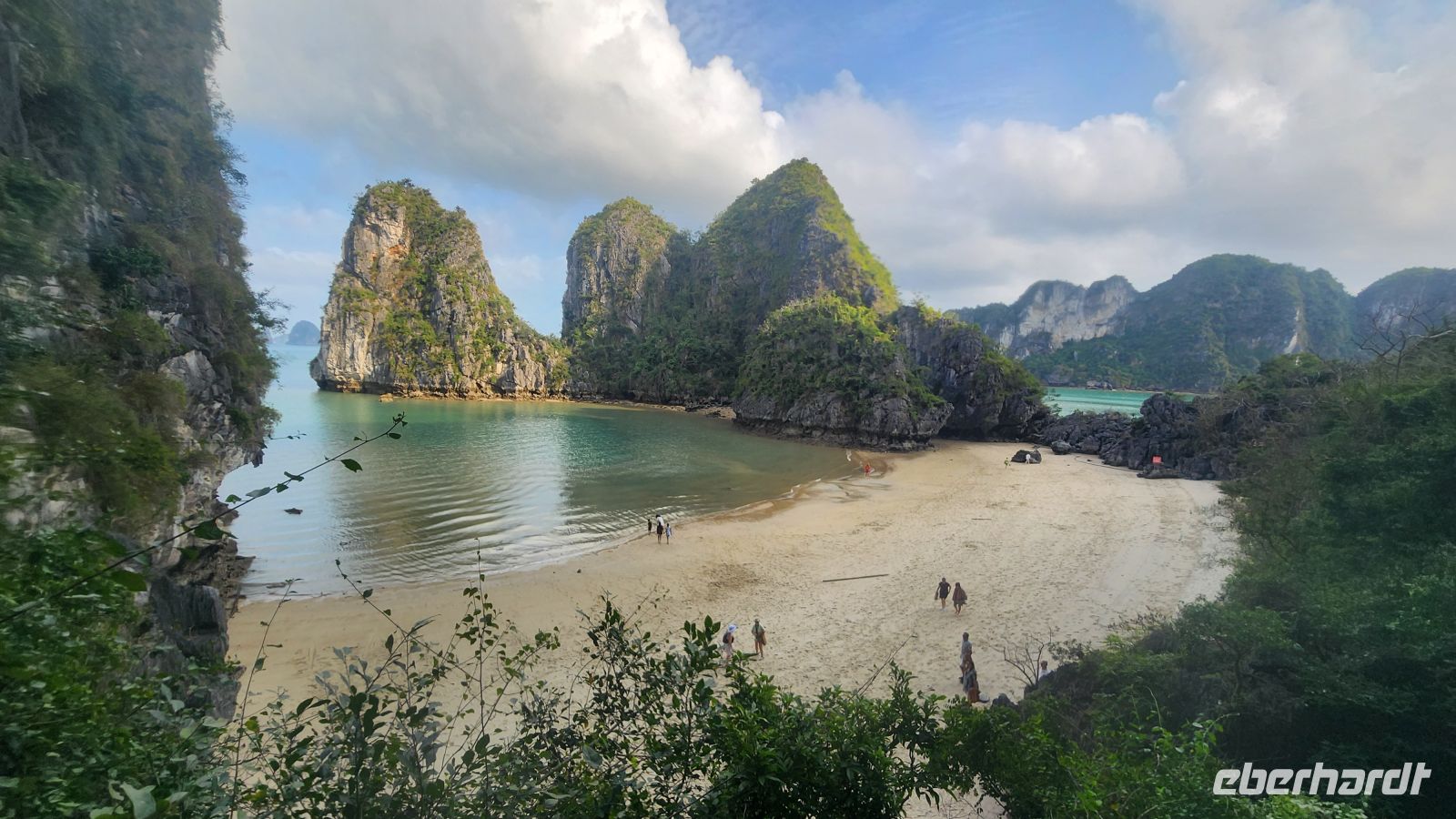 Zwei von uns entscheiden sich für die Höhle und sind absolut begeistert. Der Rest der Gruppe fährt zur Titov Island. Diese kleine Insel ist bekannt für ihren Aussichtspunkt. Gemeinsam steigen wir die vielen Stufen hinauf – und oben angekommen werden wir mehr als belohnt: Vor uns liegt die weltberühmte Halong-Bucht in ihrer ganzen Schönheit. Bei bestem Wetter genießen wir den atemberaubenden Blick aus etwa 100 Metern Höhe – ein unvergesslicher Moment.