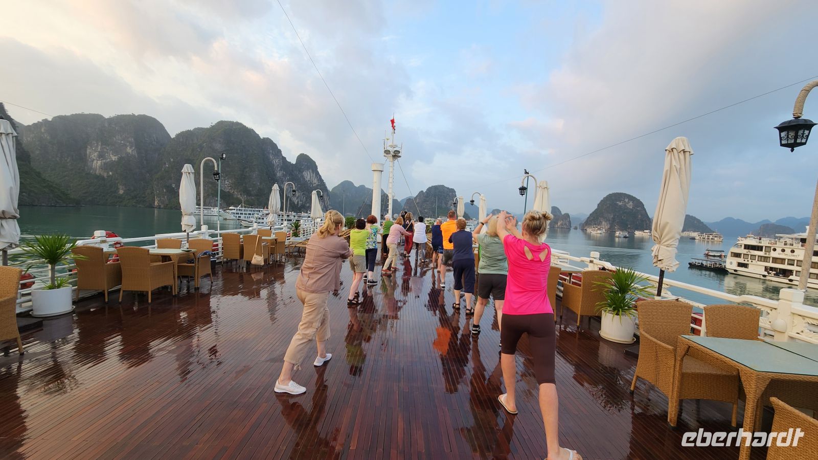 Wir haben auf dem Schiff ganz wunderbar geschlafen. Am frühen Morgen erwartet uns auf dem Sonnendeck ein besonderes Erlebnis: ein kleiner Einführungskurs in Tai Chi. Diese alte chinesische Bewegungsform besteht aus langsamen, fließenden Bewegungen und dient der Entspannung, der inneren Ruhe und der Balance. Inmitten der beeindruckenden Kulisse der Halong-Bucht, begleitet von sanfter Musik, wird dieser Kurs zu einem ganz besonderen Moment –noch viel schöner, als wir es erwartet hätten.