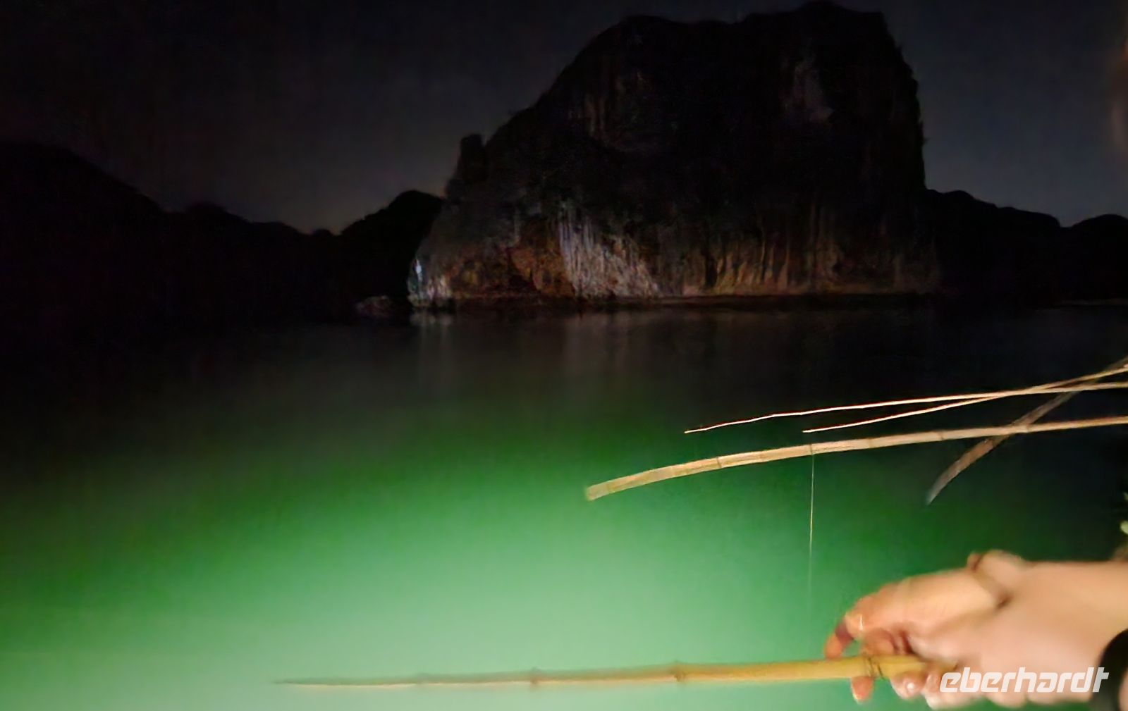 Später haben wir noch die Möglichkeit, Tintenfische zu angeln. Mit Hilfe eines großen Scheinwerfers werden sie angelockt. Zwei aus unserer Gruppe haben tatsächlich Erfolg und fangen einen kleinen und einen größeren Tintenfisch. Doch beide werden anschließend wieder vorsichtig ins Meer zurückgesetzt.