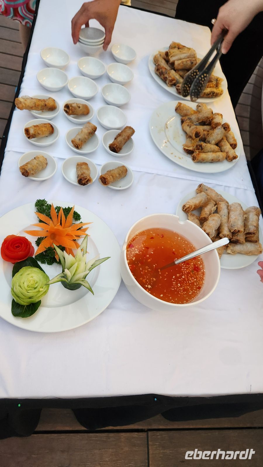 Nach einer entspannten Happy Hour an der Bar folgt eine Kochvorführung. Schritt für Schritt zeigt uns die Crew, wie man frische vietnamesische Frühlingsrollen selbst zubereitet. Danach dürfen wir es selbst ausprobieren – und am Ende gibt es sogar einen kleinen Wettbewerb. Natürlich gewinnt eine Dame aus unserer Gruppe, denn niemand jubelt so laut wie wir!