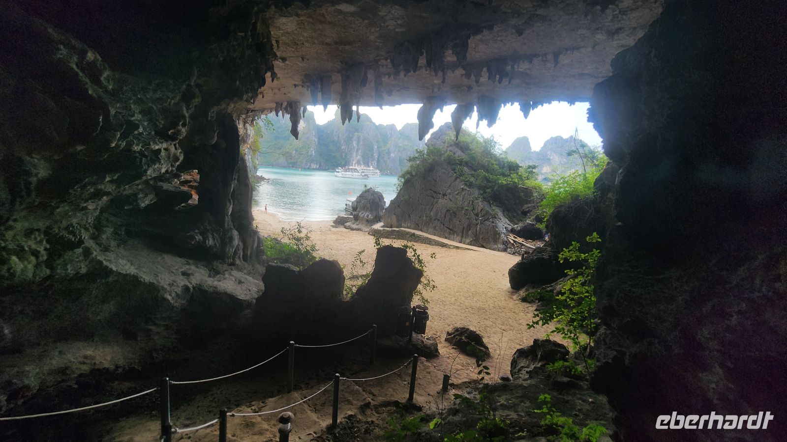 Danach stärken wir uns bei einem kleinen Frühstück, bevor wir uns entscheiden müssen: Entweder besuchen wir eine der größten Höhlen der Halong-Bucht, die Sung-Sot-Höhle, oder wir fahren zur Insel Titov Island. Die Sung-Sot-Höhle, auch „Überraschungshöhle“ genannt, ist eine der bekanntesten Höhlen der Region. Sie beeindruckt mit riesigen Hallen, bizarren Tropfsteinformationen und einer faszinierenden Beleuchtung.
