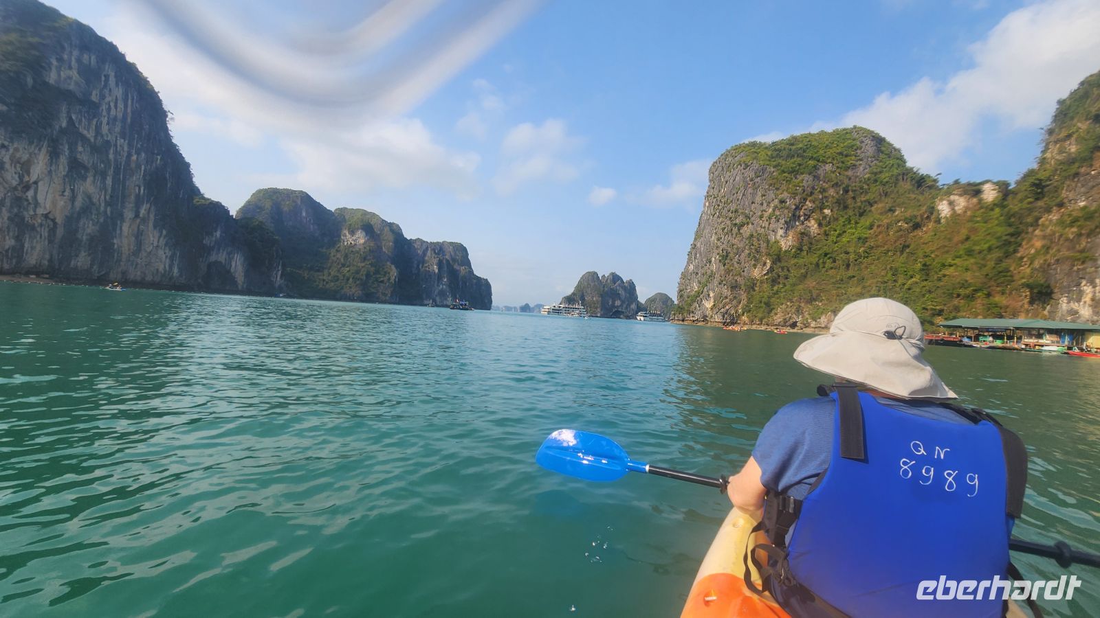 Ein erstes Höhepunkt ist die Kajaktour. Wir paddeln durch die beeindruckende Landschaft der Halong-Bucht. Überall ragen steile, grün bewachsene Felsen aus dem Wasser – und zu unserer Freude scheint sogar die Sonne.