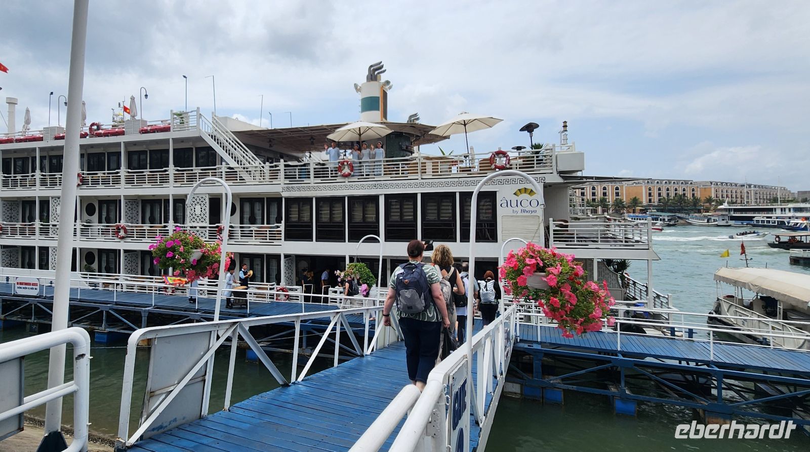 Am Mittag erreichen wir den Hafen. Nach dem Check-in betreten wir unser Schiff von Bhaya Cruises, die „Au Co 2“. Es ist ein elegantes, traditionell gestaltetes Kreuzfahrtschiff mit mehreren Decks, komfortablen Kabinen mit Balkon, Restaurant und Sonnendeck. Schon beim Betreten werden wir herzlich empfangen – die Crew steht an der Reling, winkt uns zu und heißt uns willkommen.