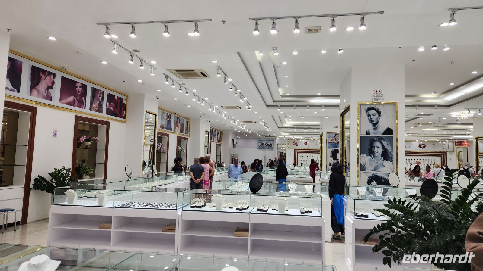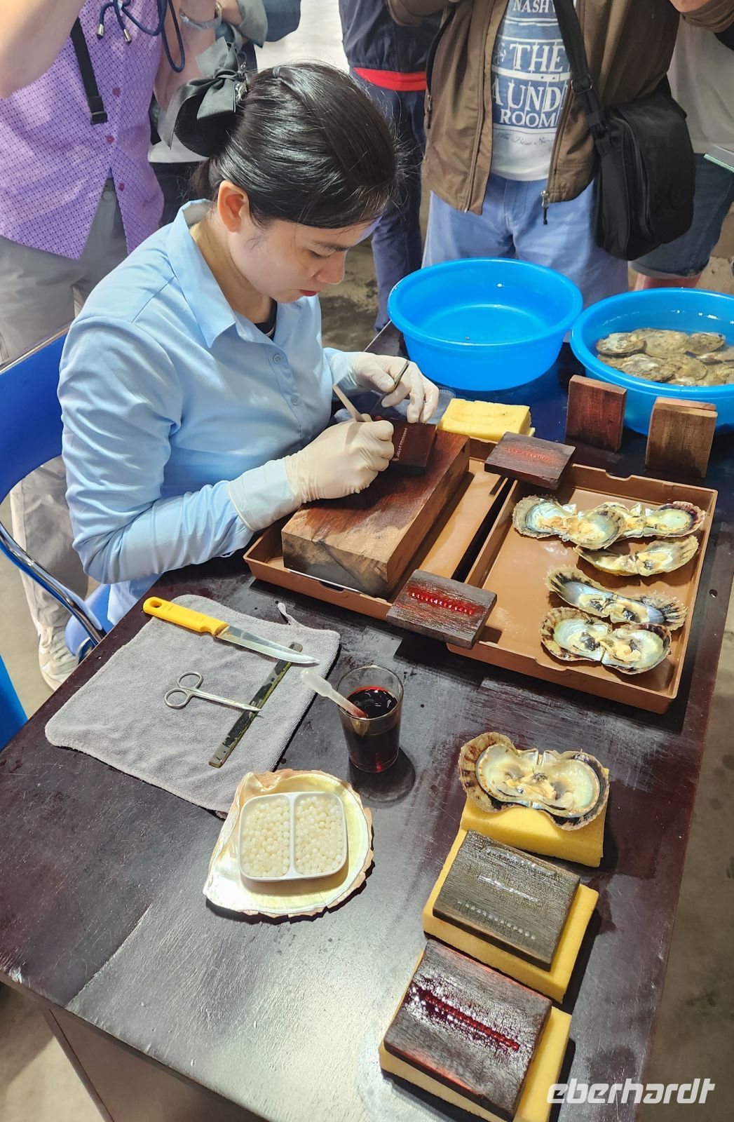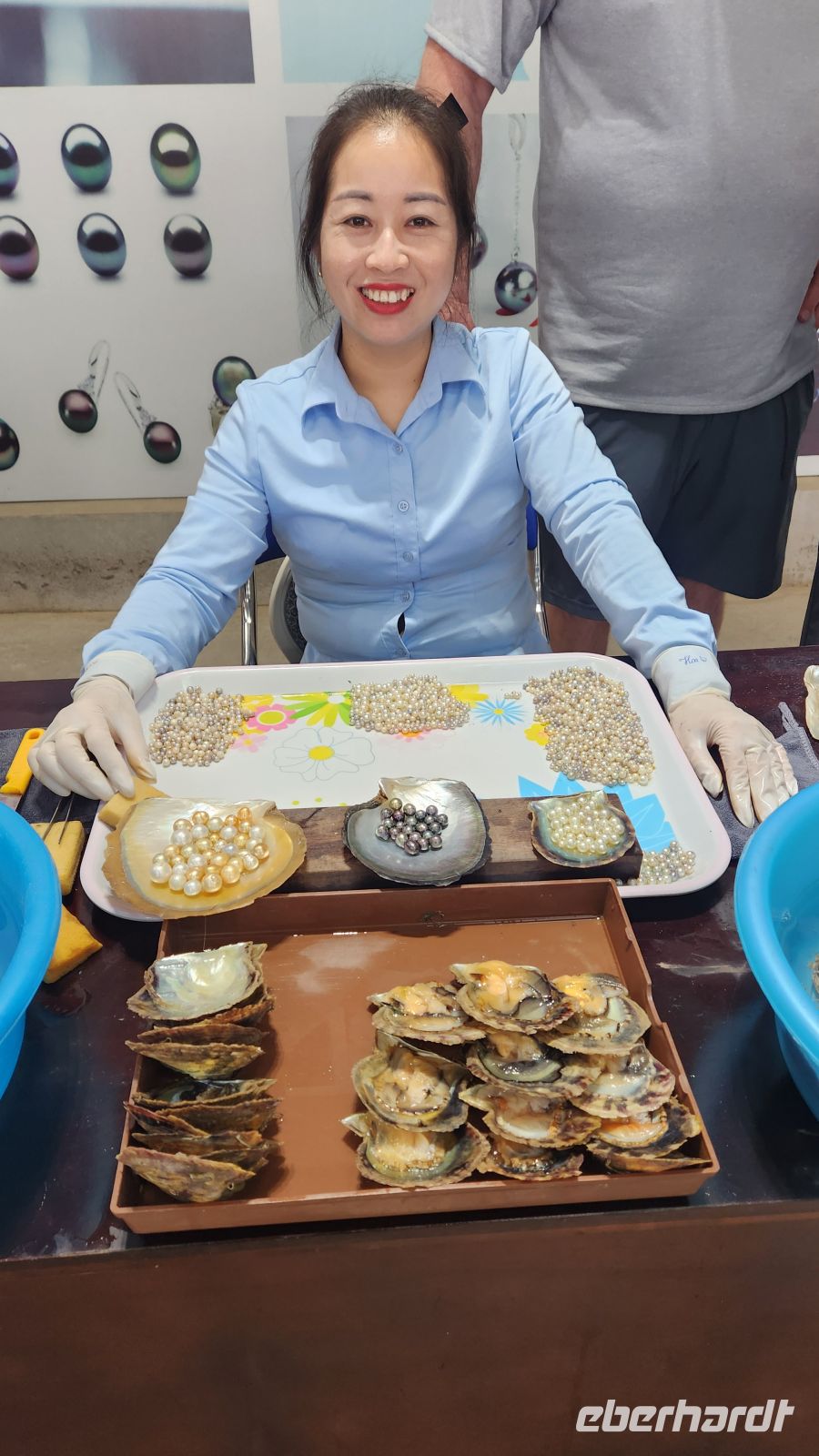 Auf dem Weg dorthin legen wir einen Zwischenstopp in einer Perlenfabrik ein. Dort erfahren wir auf einfache und anschauliche Weise, wie Perlen entstehen. Zunächst wird vorsichtig ein kleiner Kern in eine Muschel eingesetzt. Diese wird dann wieder ins Wasser zurückgebracht und gepflegt. Über mehrere Jahre bildet die Muschel Schicht für Schicht die Perle. Später werden die Perlen geerntet, gereinigt, sortiert und zu Schmuck verarbeitet. Es ist spannend zu sehen, wie viel Geduld und Handarbeit dahintersteckt. Einige Damen aus unserer Gruppe können nicht widerstehen – es gibt wirklich wunderschöne und auch außergewöhnliche Schmuckstücke. Manche kaufen sich eine Perle als Erinnerung und tragen sie sogar schon am Abend beim Dinner. Die ganze Gruppe freut sich mit ihnen – ein ganz besonderes Andenken an diese Reise.
