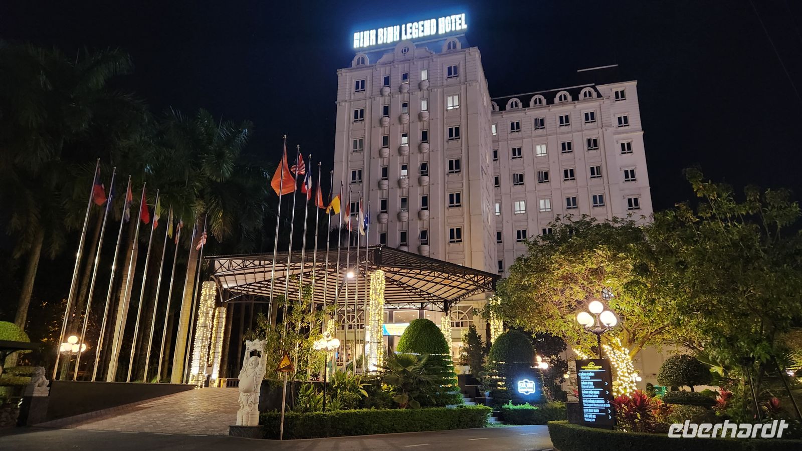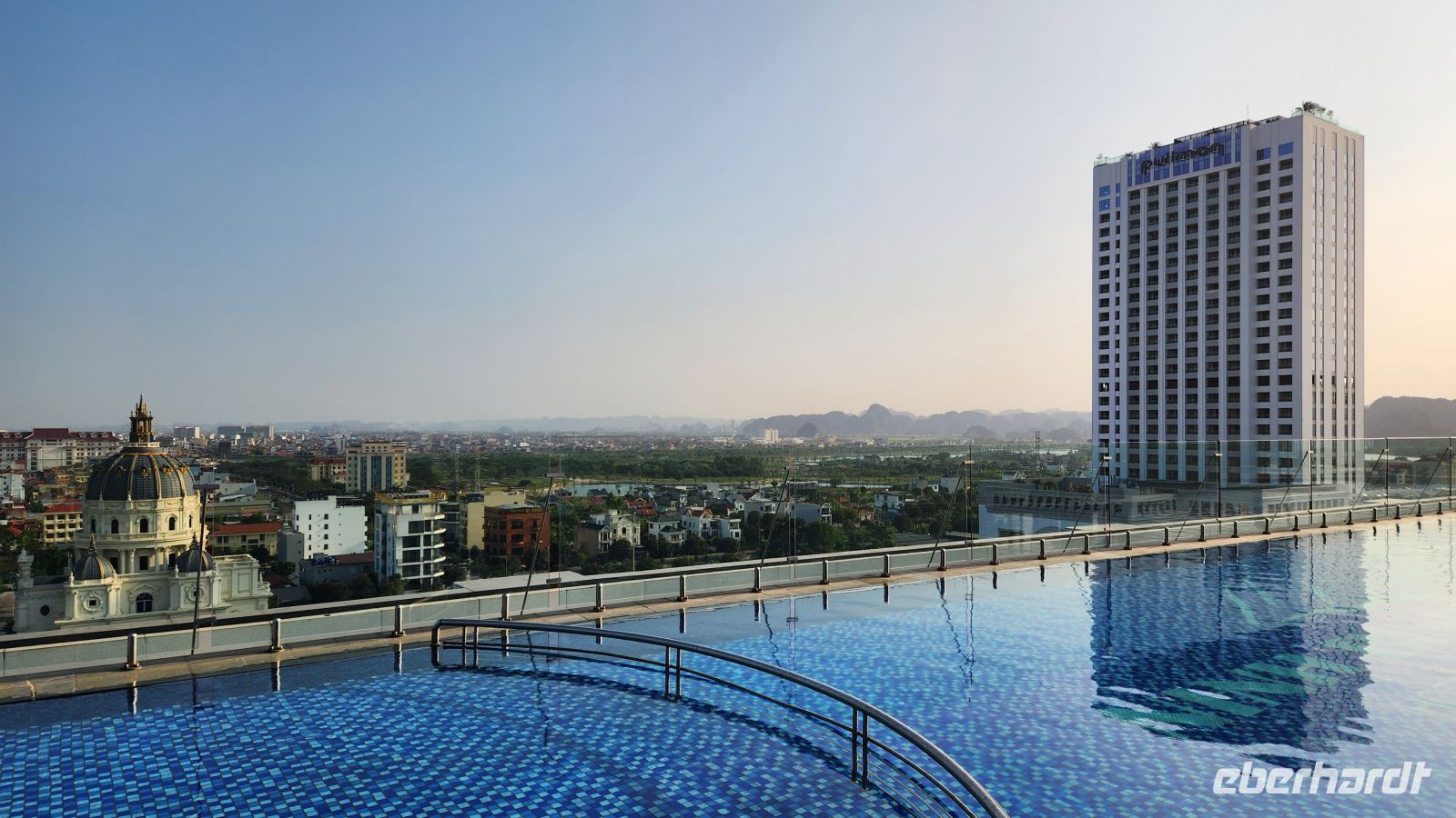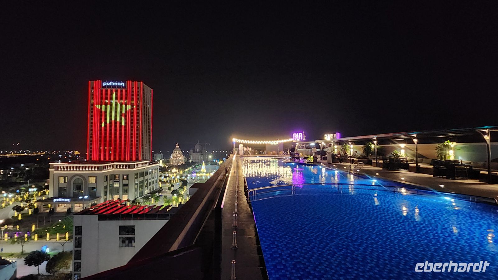 Am Nachmittag erreichen wir unser Hotel in Ninh Binh – und der Unterschied könnte kaum größer sein. Nach der ruhigen, naturnahen Unterkunft in Mai Chau erwartet uns nun ein modernes Luxushotel mitten in der Stadt. Es gibt einen Swimmingpool und sogar eine Rooftop-Bar auf dem Dach.