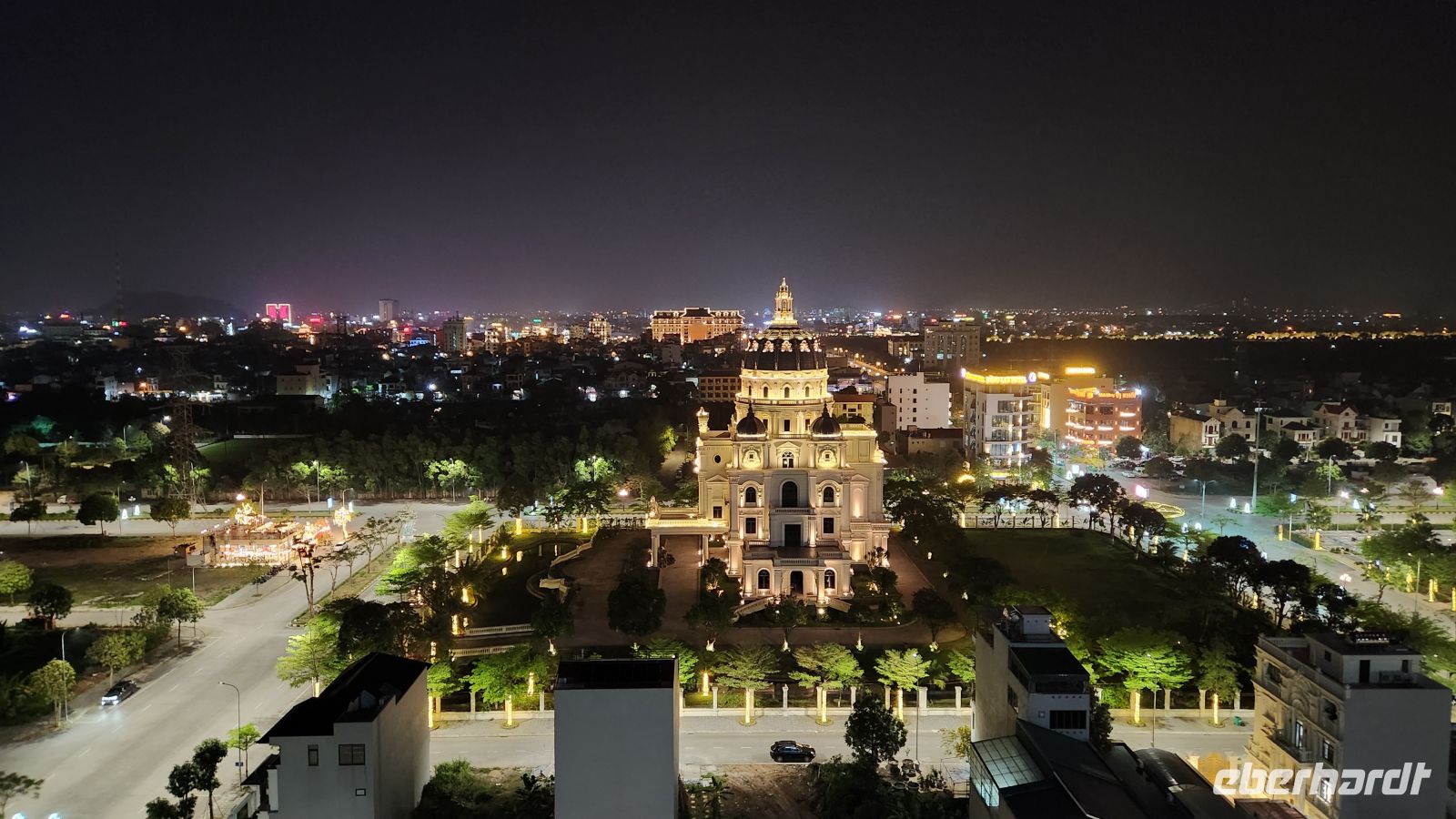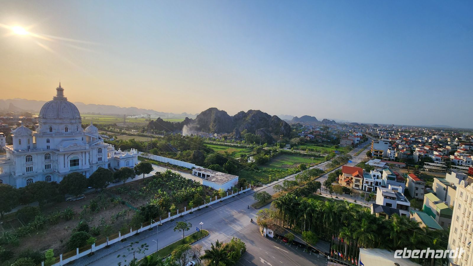 Natürlich lassen wir es uns nicht nehmen, direkt in den Pool zu springen und dabei den Blick über die Stadt zu genießen. Ninh Binh überrascht uns auch mit seiner besonderen Architektur: Es gibt viele Gebäude, die wie Kirchen aussehen. Das Kuriose daran ist, dass einige davon tatsächlich Wohnhäuser wohlhabender Vietnamesen sind – ein ungewöhnlicher, aber spannender Anblick.