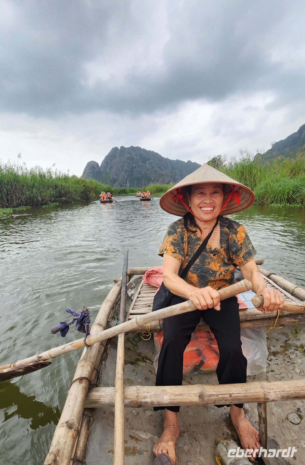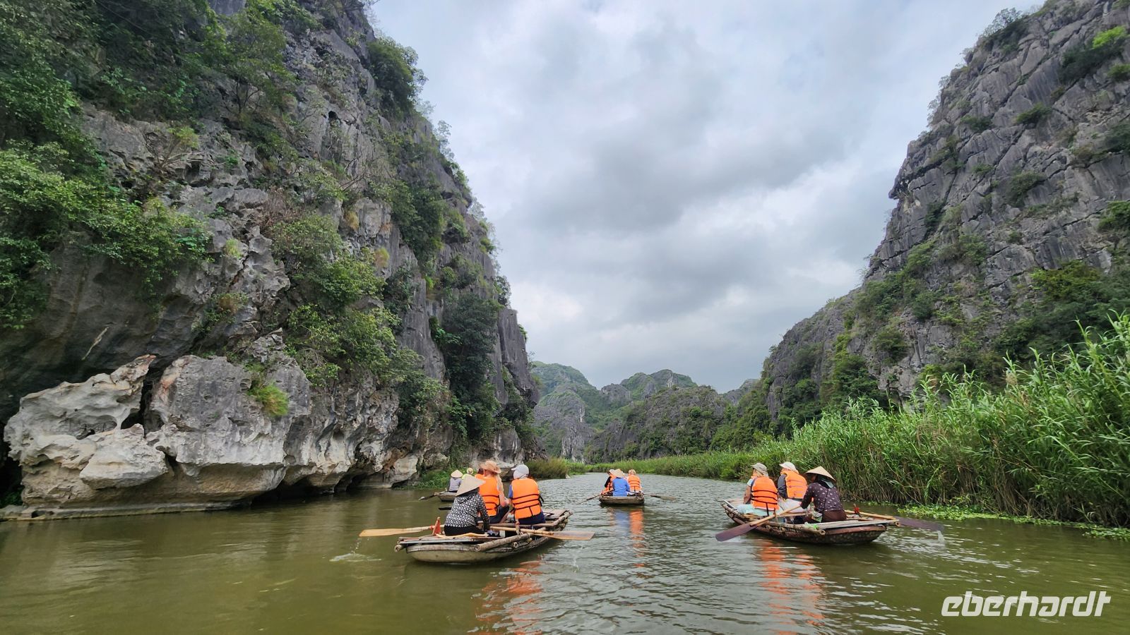Unser nächstes Ziel ist die sogenannte „trockene Halongbucht“ bei Ninh Binh. Diese Region ist bekannt für ihre beeindruckende Landschaft: Statt Wasser wie in der berühmten Halongbucht ragen hier die Karstfelsen mitten aus grünen Reisfeldern empor. Flüsse schlängeln sich durch die Landschaft, und alles wirkt ruhig, fast märchenhaft.