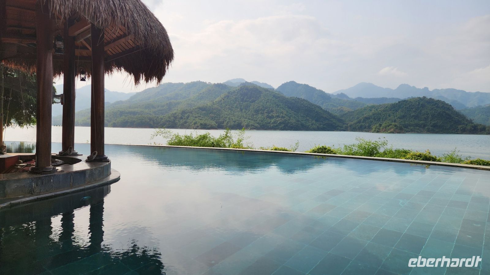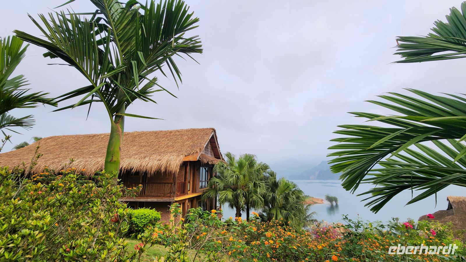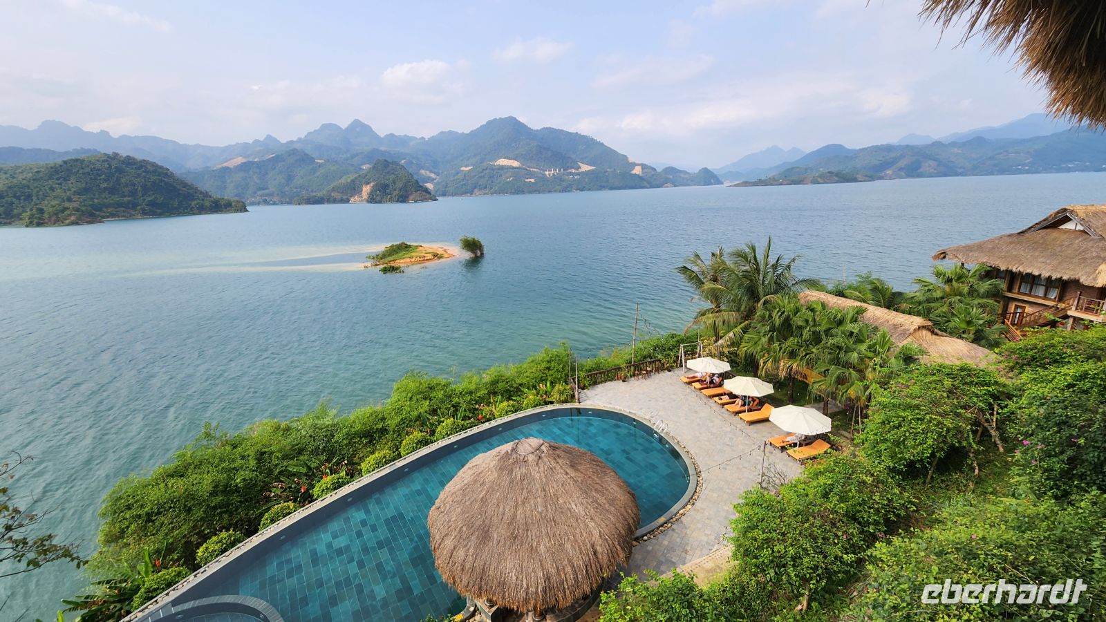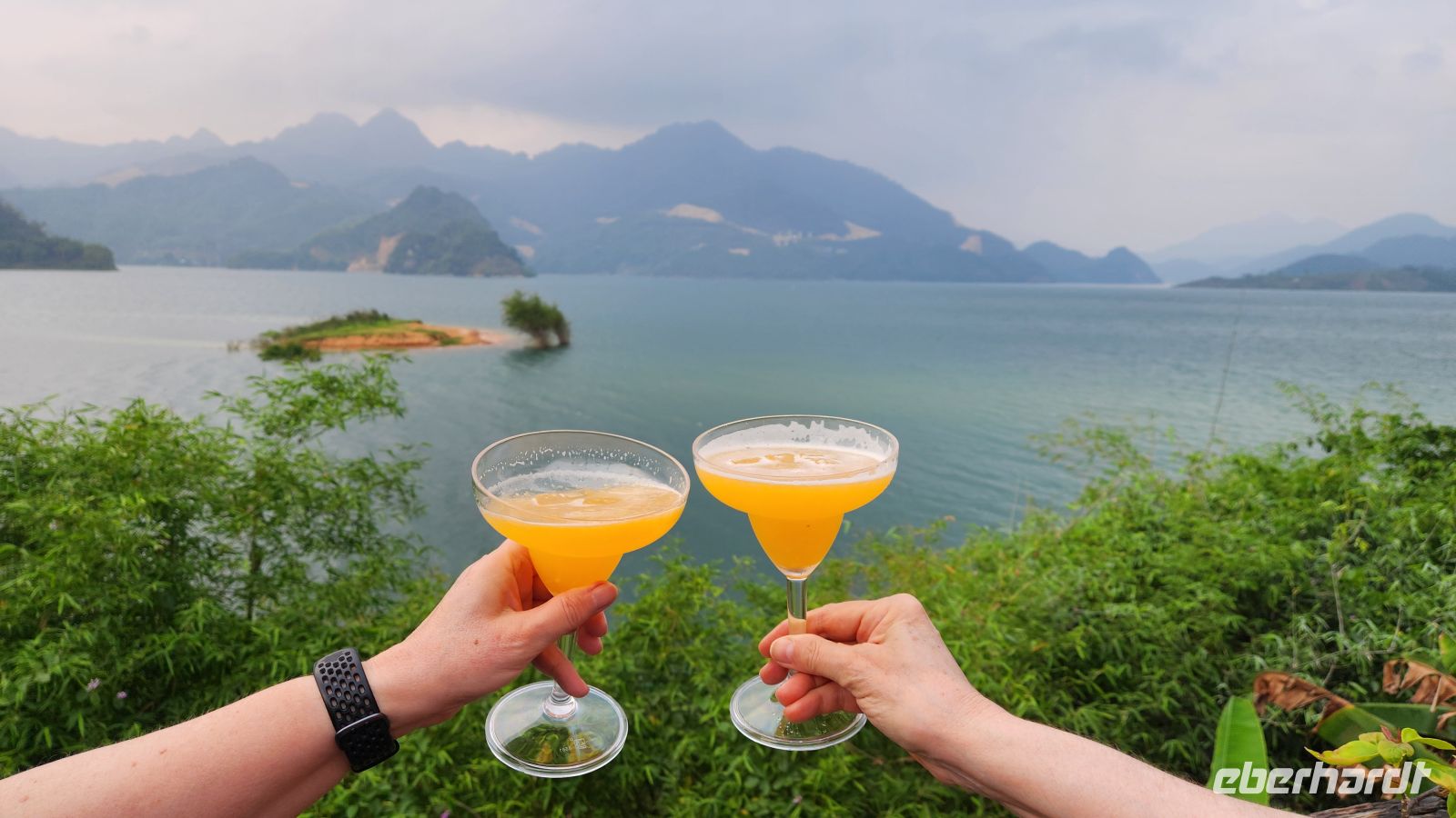 Am Nachmittag erreichen wir unser wunderschönes Hotel. Es besteht aus mehreren Gebäuden mit traditionellen Strohdächern und liegt direkt am See. Jeder von uns hat einen Balkon – und der Ausblick auf den Hoa-Binh-See ist einfach atemberaubend. Hier spüren wir sofort die Ruhe und Gelassenheit dieser Region.