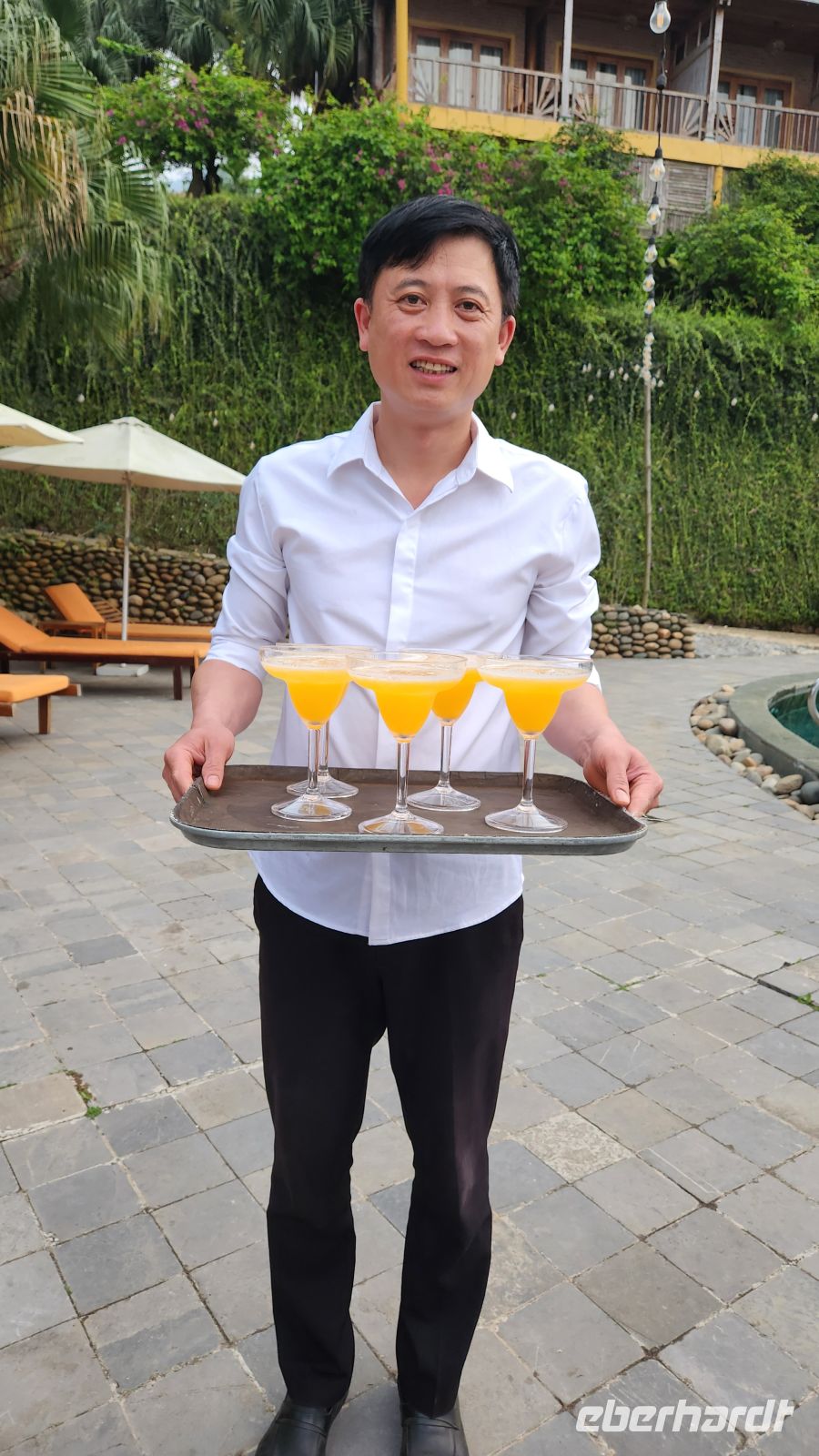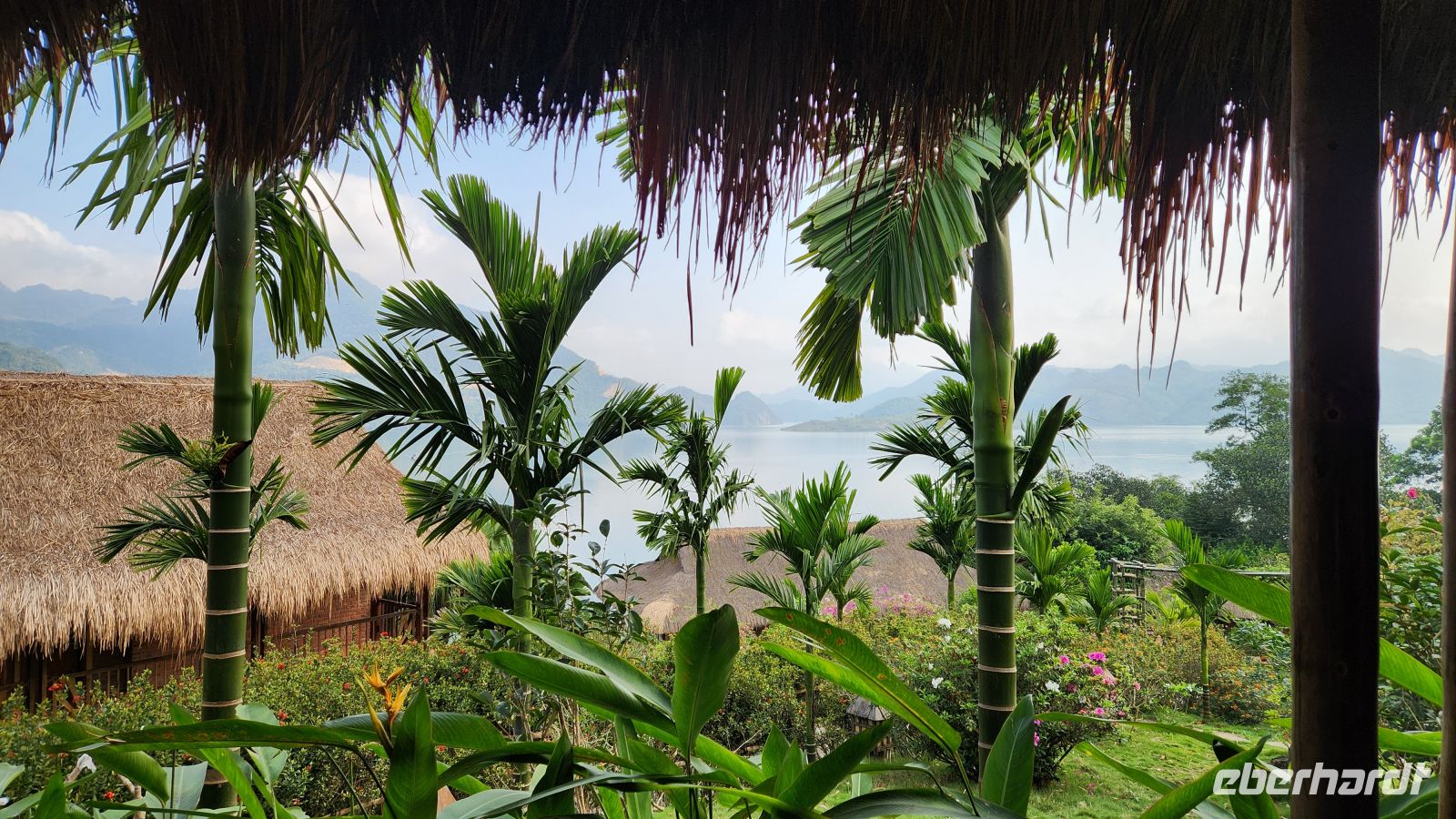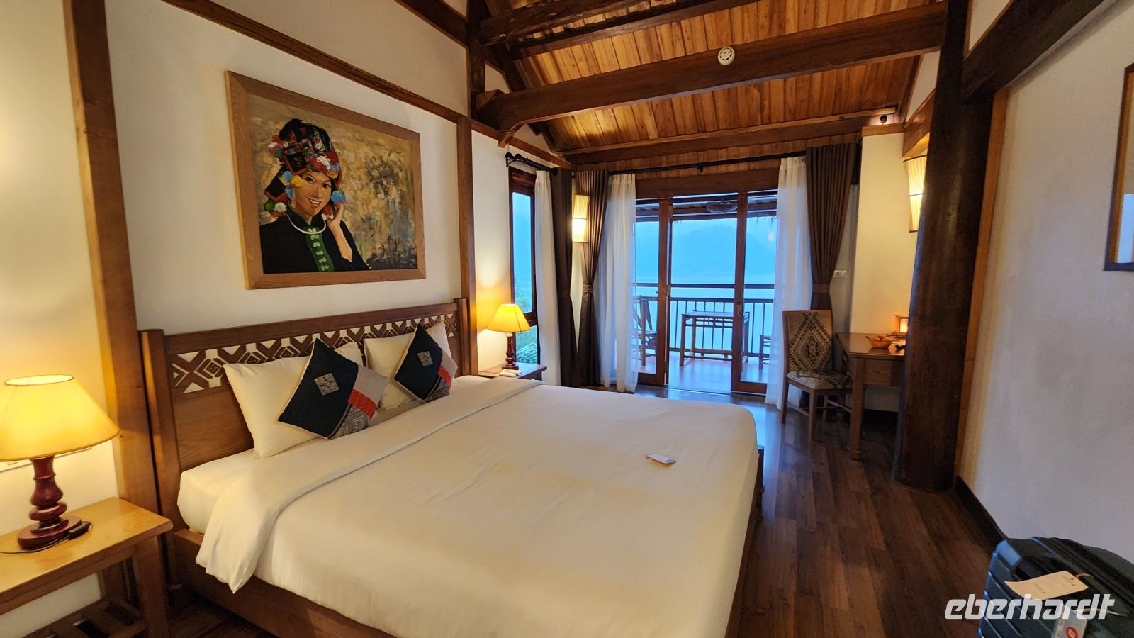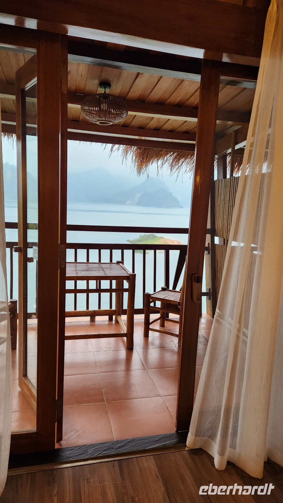 Am Nachmittag erreichen wir unser wunderschönes Hotel. Es besteht aus mehreren Gebäuden mit traditionellen Strohdächern und liegt direkt am See. Jeder von uns hat einen Balkon – und der Ausblick auf den Hoa-Binh-See ist einfach atemberaubend. Hier spüren wir sofort die Ruhe und Gelassenheit dieser Region.
