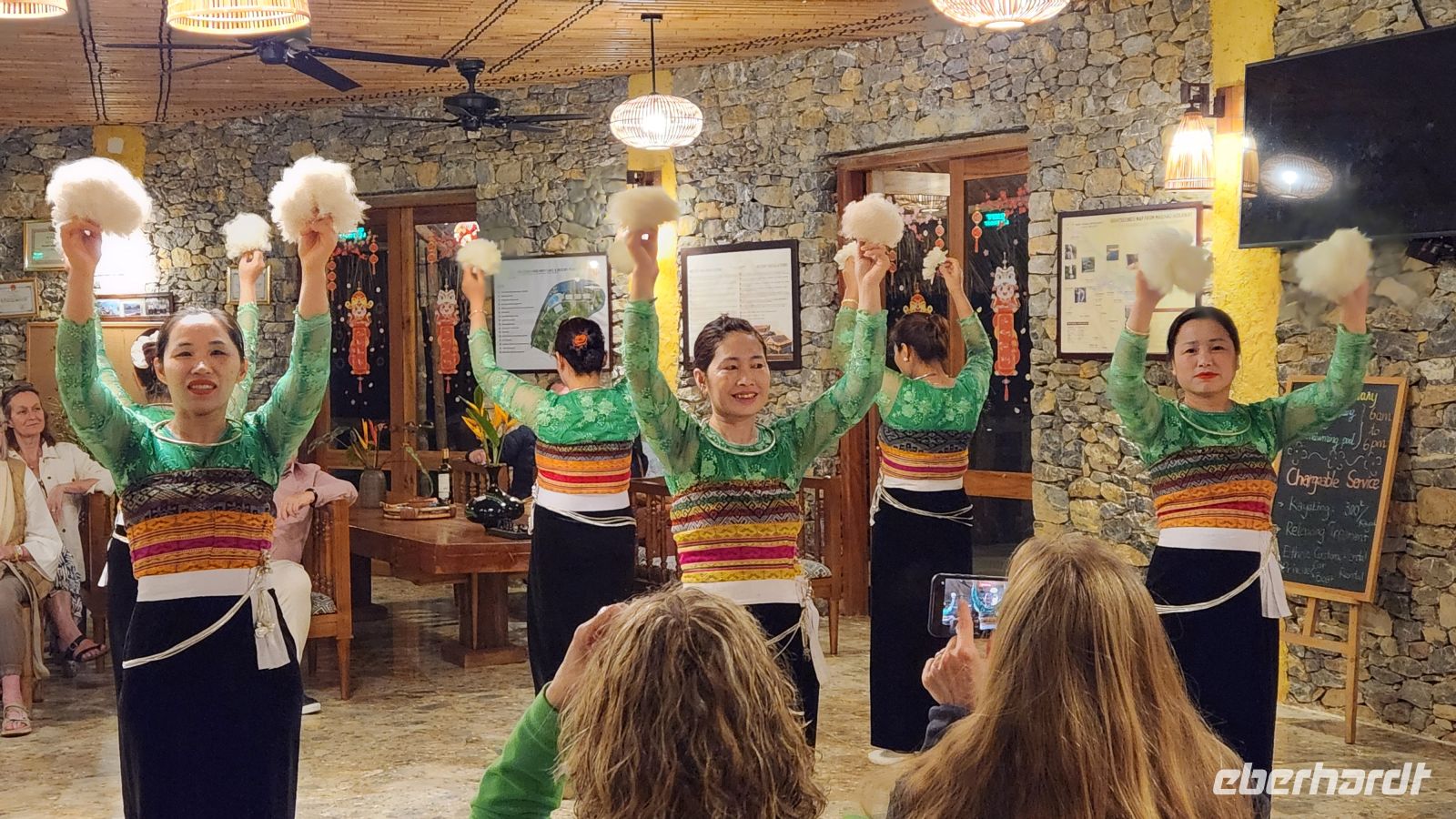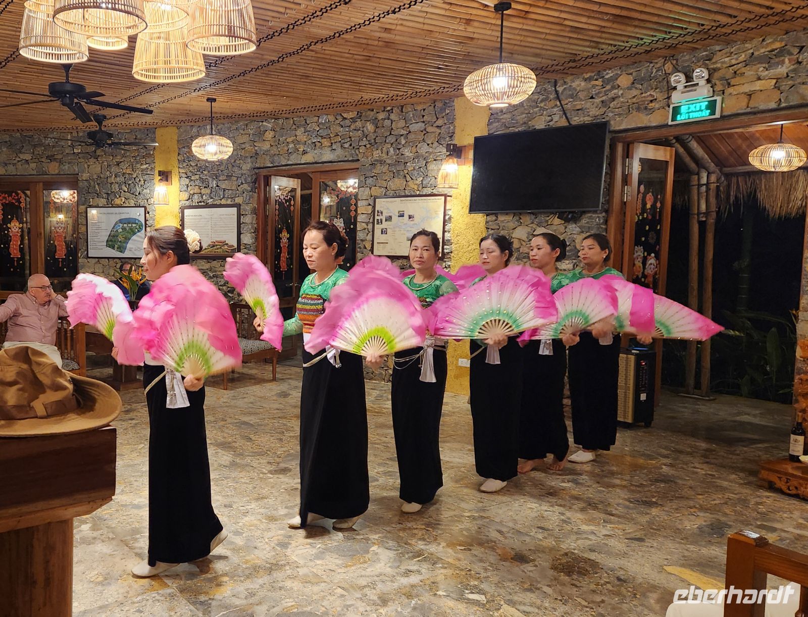 Am Abend genießen wir gemeinsam ein leckeres Essen im Hotel. Danach erwartet uns noch ein besonderes Erlebnis: eine Tanzvorführung mit traditionellen Tänzen aus den Bergregionen Vietnams. Die bunten Kostüme, die Musik und die Bewegungen erzählen Geschichten aus dem Leben der Menschen hier.