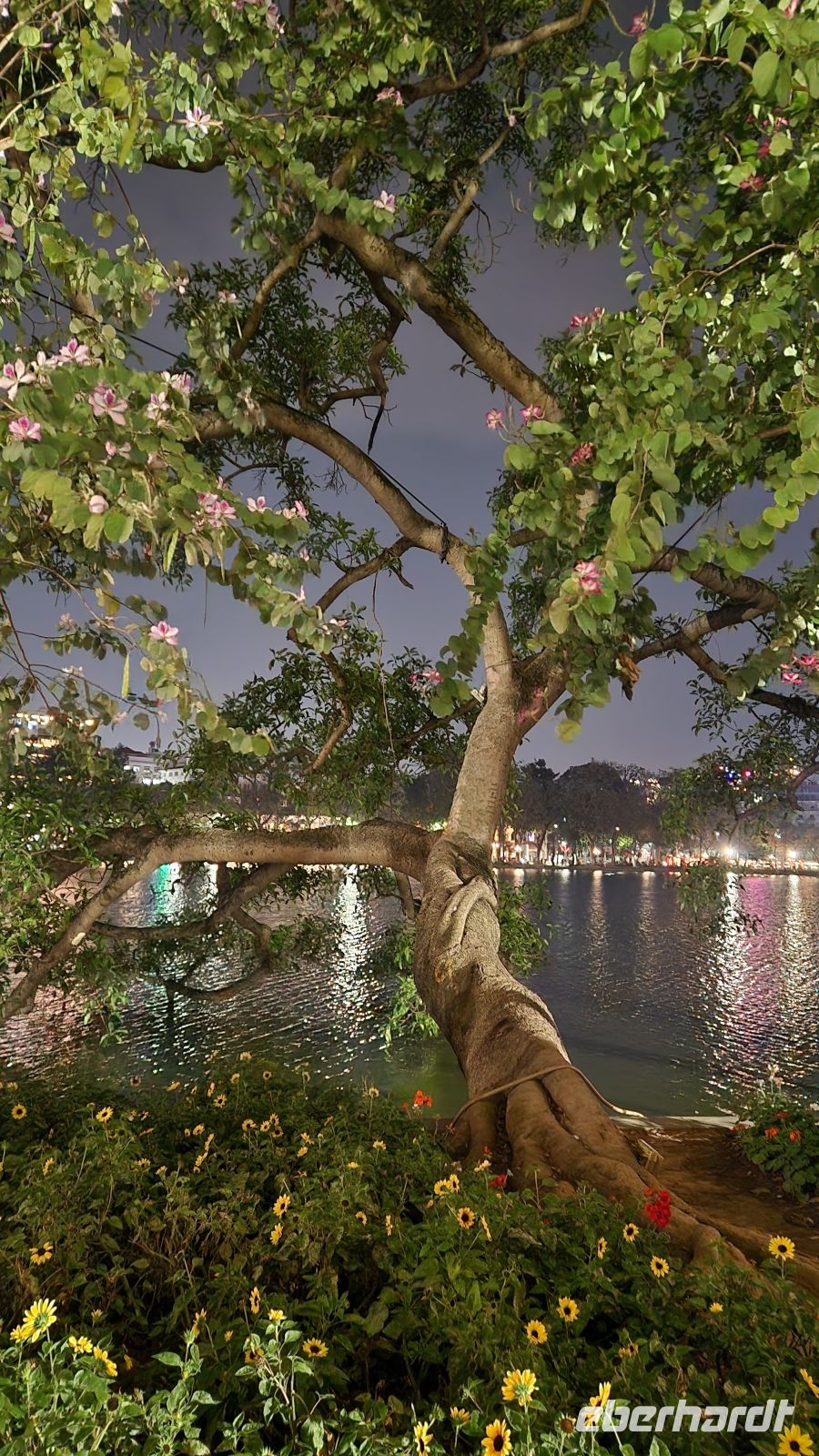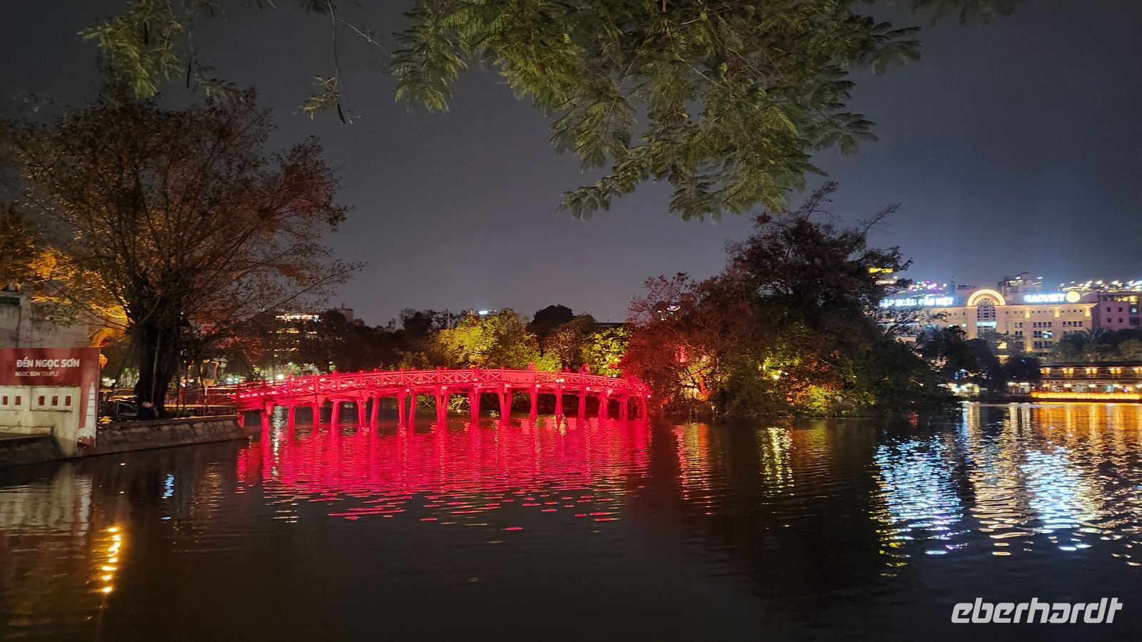 Auf dem Rückweg spazieren wir teilweise am Ufer des Hoan-Kiem-Sees entlang. Besonders beeindruckend ist die rot beleuchtete Brücke, die sich wunderschön im Wasser spiegelt.