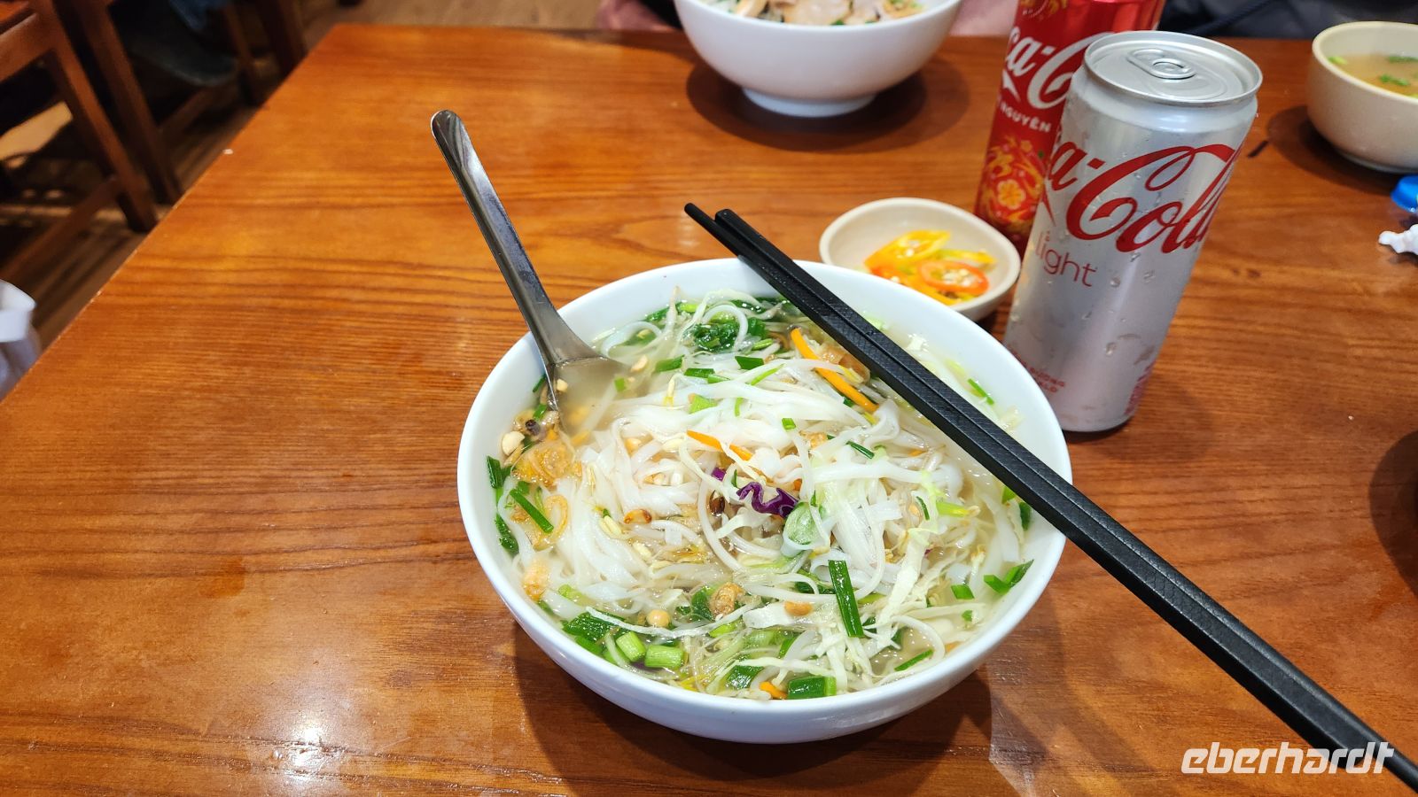 Nach so vielen Eindrücken freuen wir uns auf das Mittagessen. Wir alle entscheiden uns für eine der bekanntesten Spezialitäten Vietnams: Pho. Diese aromatische Nudelsuppe wird mit frischen Kräutern, Reisnudeln und Fleisch serviert – einfach, aber unglaublich lecker.