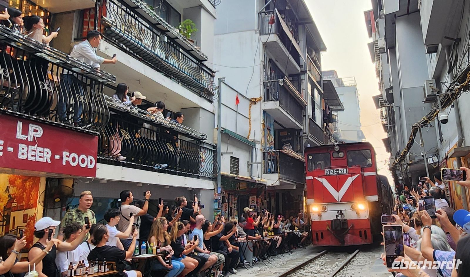 Anschließend geht es weiter zu den berühmten Eisenbahn-Cafés. Hier verläuft eine Bahnstrecke mitten durch eine schmale Gasse. Kurz bevor der Zug kommt, wird es plötzlich hektisch: Sonnenschirme werden zusammengeklappt, Tische zur Seite geschoben und Stühle schnell gestapelt oder eingeklappt. Alles muss weichen, damit der Zug überhaupt durchpasst. Dann rauscht er dicht an uns vorbei – ein aufregendes und zugleich faszinierendes Erlebnis. Danach kehrt sofort wieder Ruhe ein, und wir setzen uns gemütlich zusammen und genießen diese kleine Pause. Einige probieren den besonderen Eierkaffee, andere entscheiden sich für Kokoskaffee oder einen frischen Shake.