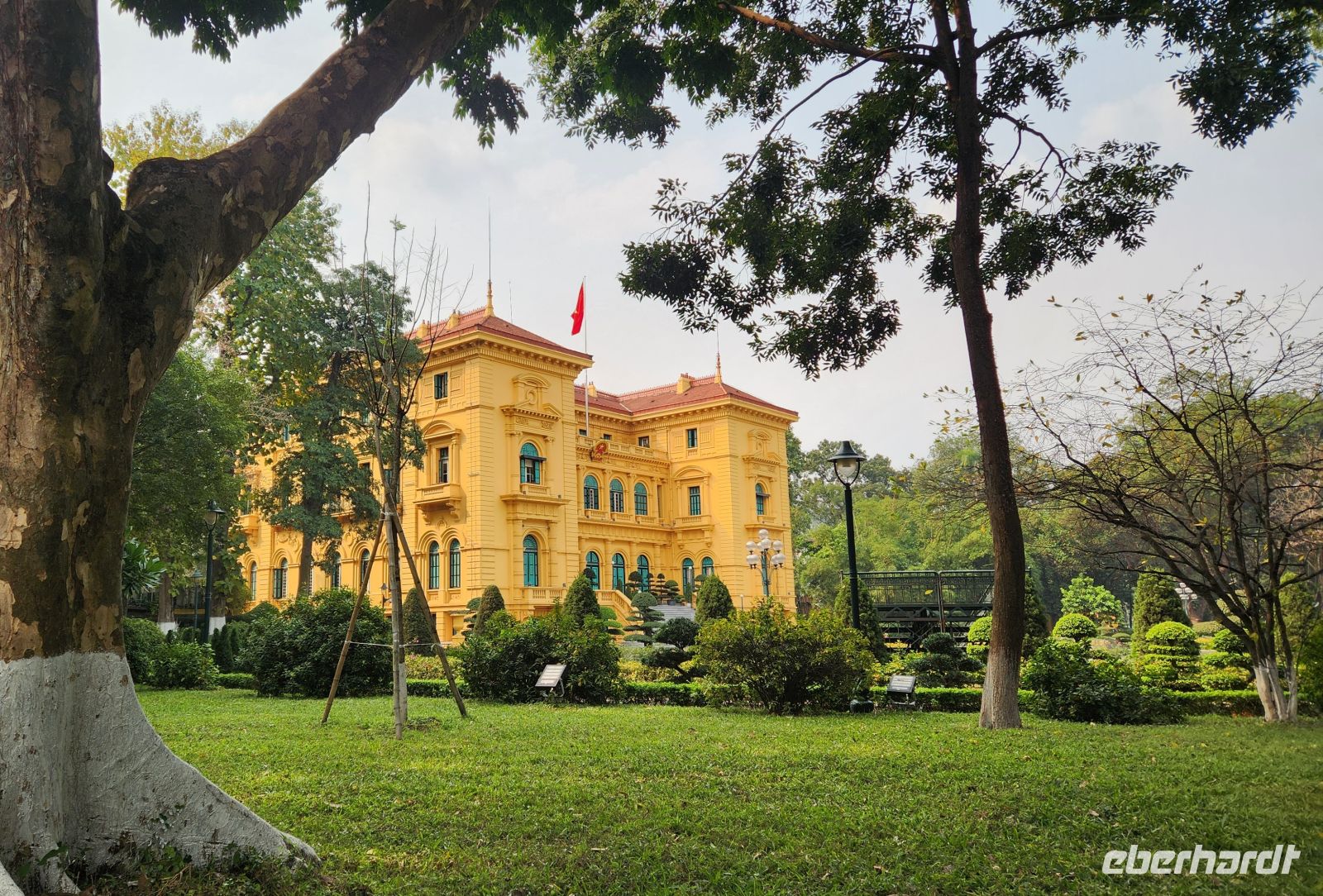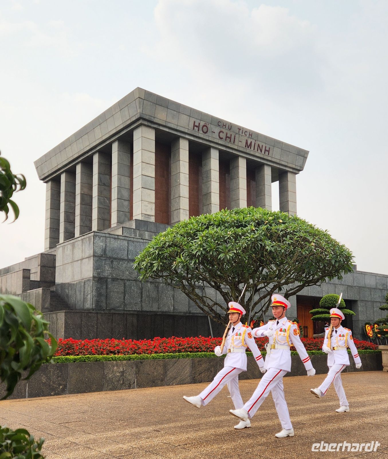 Am Mittag starten wir unser erstes Programm. Unser Weg führt uns zum Gelände rund um das Mausoleum von Ho Chi Minh, zu seinem ehemaligen Wohnhaus und dem Präsidentenpalast. Das Mausoleum selbst ist zwar geschlossen, doch wir haben Glück: Genau zur richtigen Zeit erleben wir die feierliche Wachablösung – ein beeindruckender Moment.
