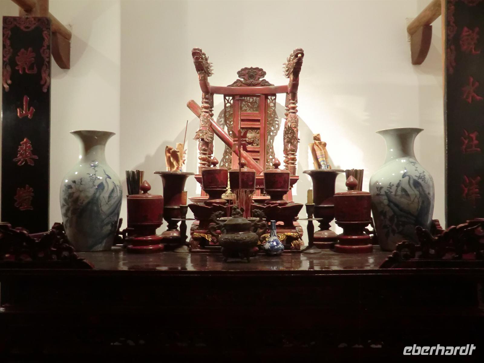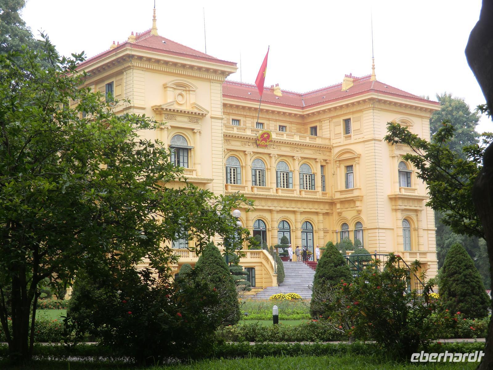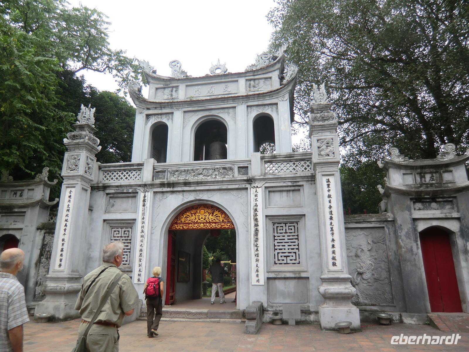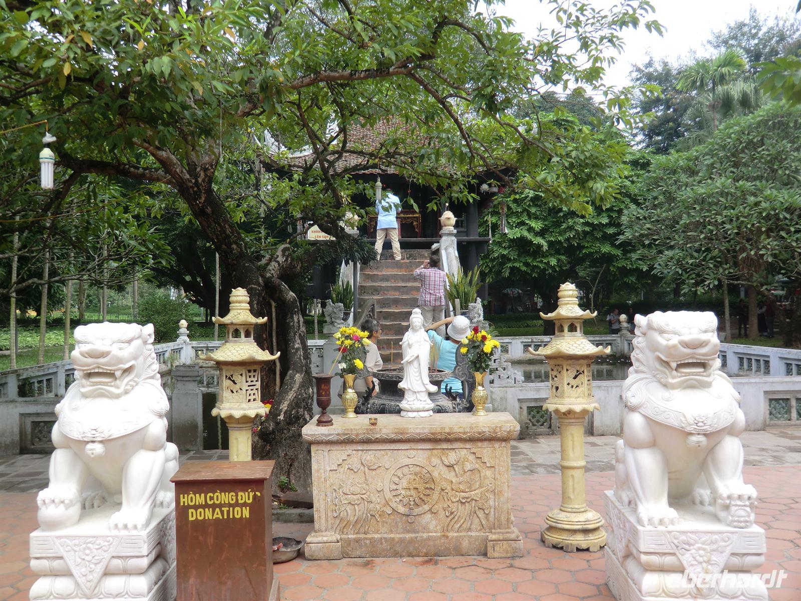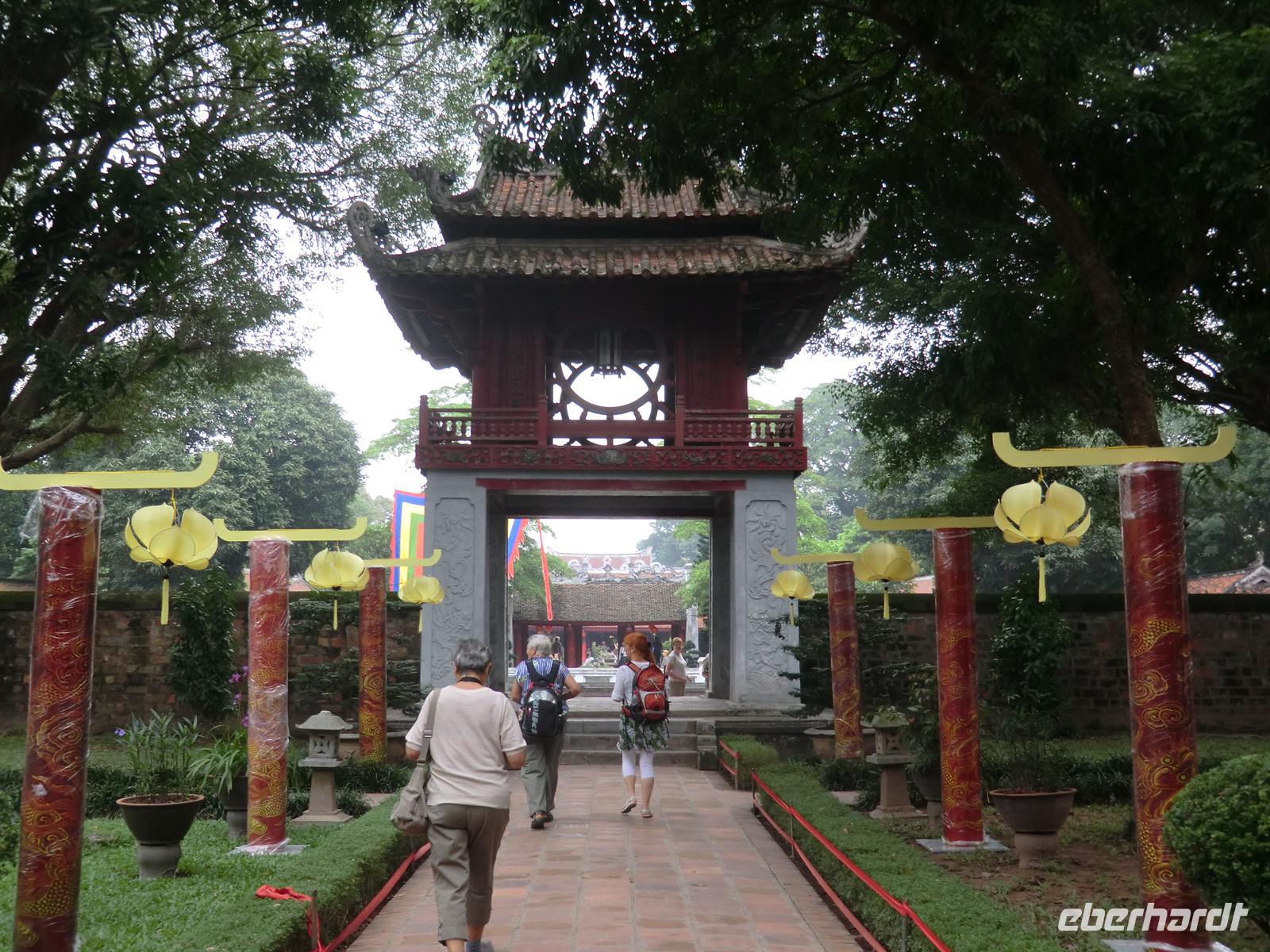 Good Morning Vietnam! Bereits 6:30 Uhr erwartete uns ein himmlisches Frühstücksbuffet mit frischem Omelette, Knoblauchkartoffeln, amerikanischen Pfannkuchen, Hähnchencurry und vielem mehr. Gut gestärkt starteten wir 8:30 Uhr unsere Stadtrundfahrt mit Son. Da die Mausoleumsanlage Ho Chi Minhs aufgrund einer Delegation aus Kasachstan gesperrt war, zogen wir die Besichtigung des Literaturtempels vor. Uns erwartete eine in Räucherkerzenduft eingetauchte und liebevoll geschmückte Anlage - eine grüne Oase im quirligen Hanoi. Nach dem Kauf erster Souvenirs und einem kurzen Treff mit Tuh fuhren wir zum innig verehrten Onkel der Nation - Ho Chi Minh. Aufgrund von Renovierungsarbeiten konnten wir das Mausoleum nur von außen bewundern, was aber nicht weniger beeindruckend war. In der weitläufigen Gartenanlage, neben der sich der Präsidentenpalast befindet, ist die Anwesenheit Ho Chi Minh anhand seiner dargestellten Wohn-, Arbeits- und Schlafräume sowie Garage samt genutzter Fahrzeuge nachempfunden.