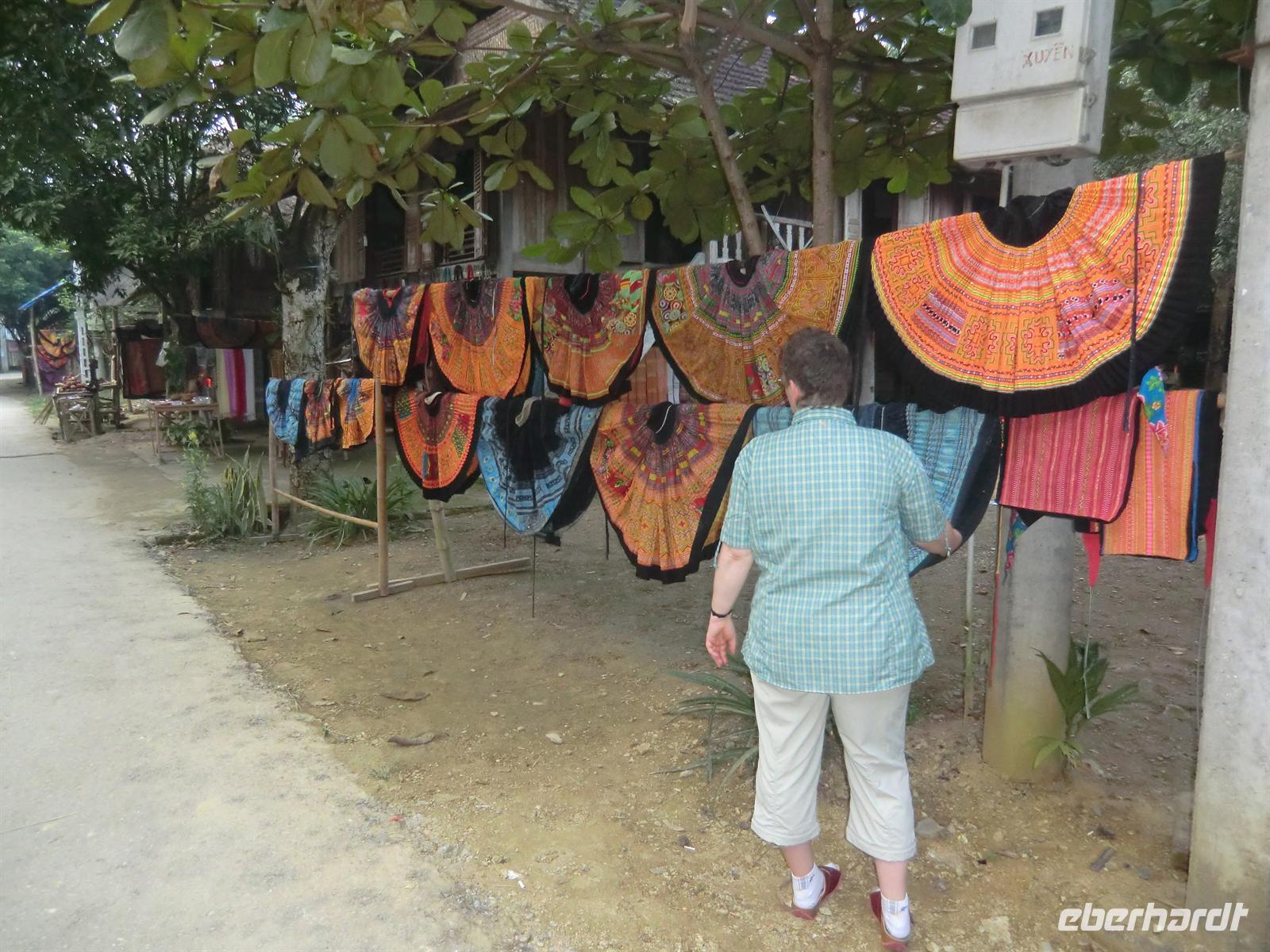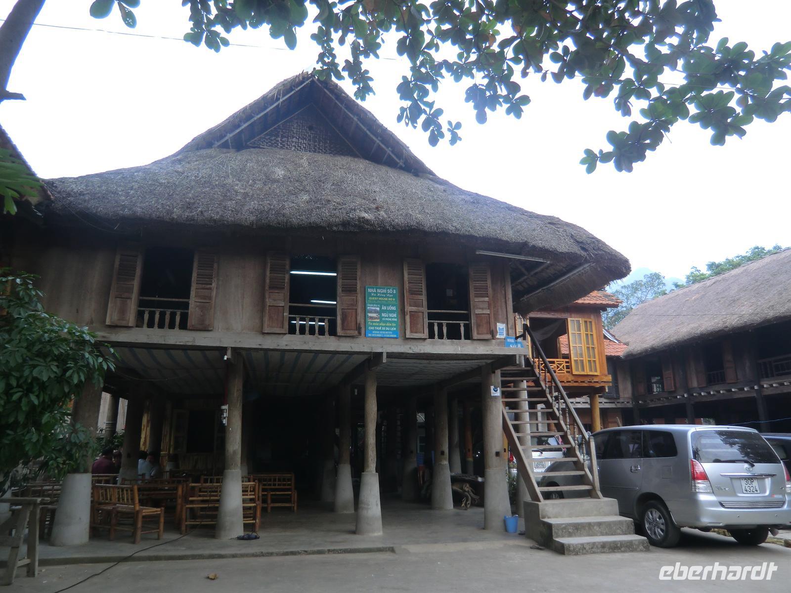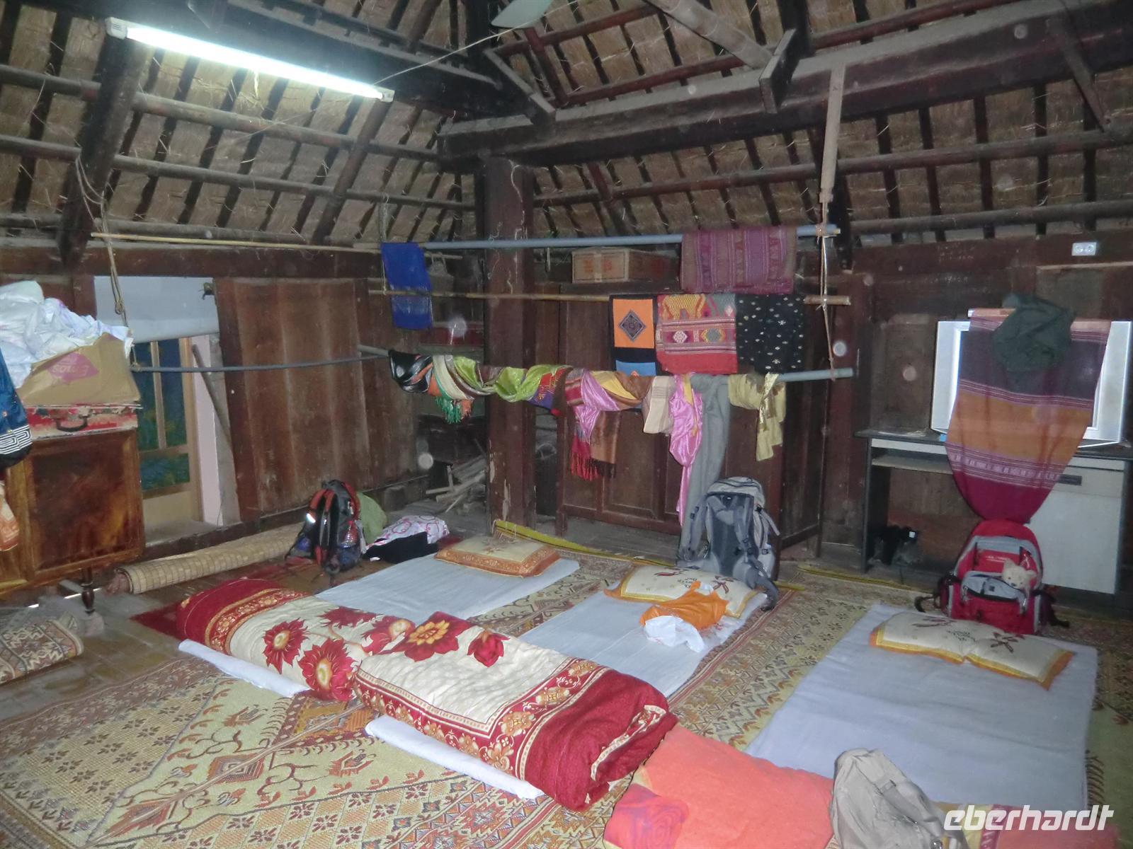 Gegen 15 Uhr erreichten wir erneut die Mai Chau Lodge, wo unser Bus parkte. Nachdem sich jeder seinen kleinen „Übernachtungsrucksack“ geschnappt hatte, machten wir uns auf den kurzen Fußmarsch durch die umliegenden Reisfelder hindurch bis zum Dorf Lac, wo die Minderheit der Thai ihr zuhause hat. Idyllisch anmutende Holzpfahlhäuser luden zum Verweilen ein. Das Haus mit der Nummer 8 sollte unser Quartier sein. Über zwei Holztreppen gelangte man von entgegengesetzten Seiten in den oberen Teil der Häuser, dessen Fußboden mit Bambusmatten ausgelegt war. In einer U-Form hatte man unsere Schaflager bereits liebevoll vorbereitet und mit bunten Matten arrangiert. Ehe wir uns zu einem Dorfbummel aufmachten, versammelten wir uns im Schneidersitz um den kleinen Teetisch in der Mitte des Raumes und genossen selbstgebrannten und in kleine Plastikflaschen abgefüllten Reisschnaps. Danach ging es auf zum Shopping. Einige Männer zogen nach einigen Metern doch eher ein kühles Bier vor, anstatt ihren Frauen zu folgen. Nach etwa zwei Stunden war das Dorf umrundet und die Taschen voller und Portemonnaies etwas erleichtert.