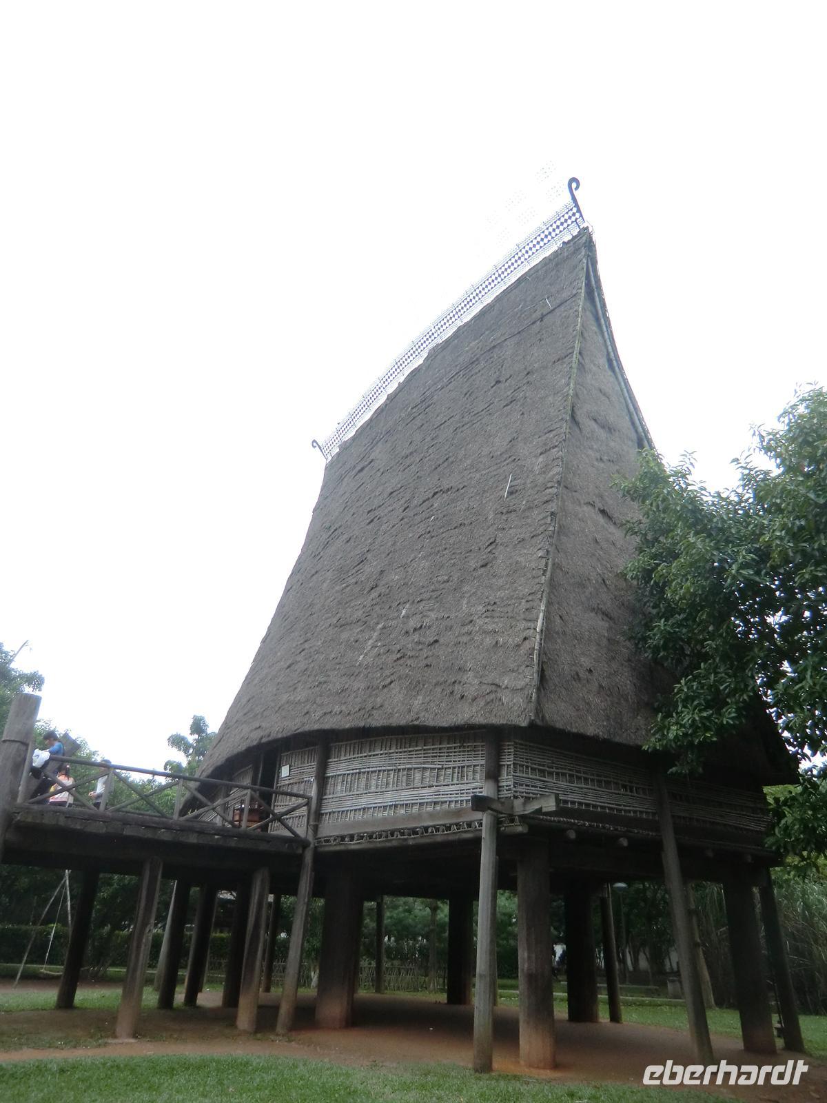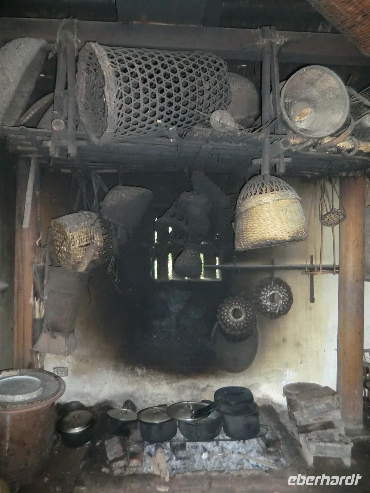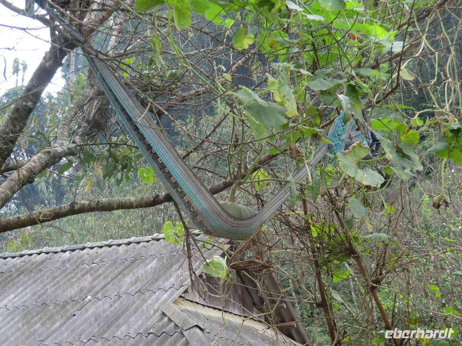 Gegen 15 Uhr erreichten wir erneut die Mai Chau Lodge, wo unser Bus parkte. Nachdem sich jeder seinen kleinen „Übernachtungsrucksack“ geschnappt hatte, machten wir uns auf den kurzen Fußmarsch durch die umliegenden Reisfelder hindurch bis zum Dorf Lac, wo die Minderheit der Thai ihr zuhause hat. Idyllisch anmutende Holzpfahlhäuser luden zum Verweilen ein. Das Haus mit der Nummer 8 sollte unser Quartier sein. Über zwei Holztreppen gelangte man von entgegengesetzten Seiten in den oberen Teil der Häuser, dessen Fußboden mit Bambusmatten ausgelegt war. In einer U-Form hatte man unsere Schaflager bereits liebevoll vorbereitet und mit bunten Matten arrangiert. Ehe wir uns zu einem Dorfbummel aufmachten, versammelten wir uns im Schneidersitz um den kleinen Teetisch in der Mitte des Raumes und genossen selbstgebrannten und in kleine Plastikflaschen abgefüllten Reisschnaps. Danach ging es auf zum Shopping. Einige Männer zogen nach einigen Metern doch eher ein kühles Bier vor, anstatt ihren Frauen zu folgen. Nach etwa zwei Stunden war das Dorf umrundet und die Taschen voller und Portemonnaies etwas erleichtert.