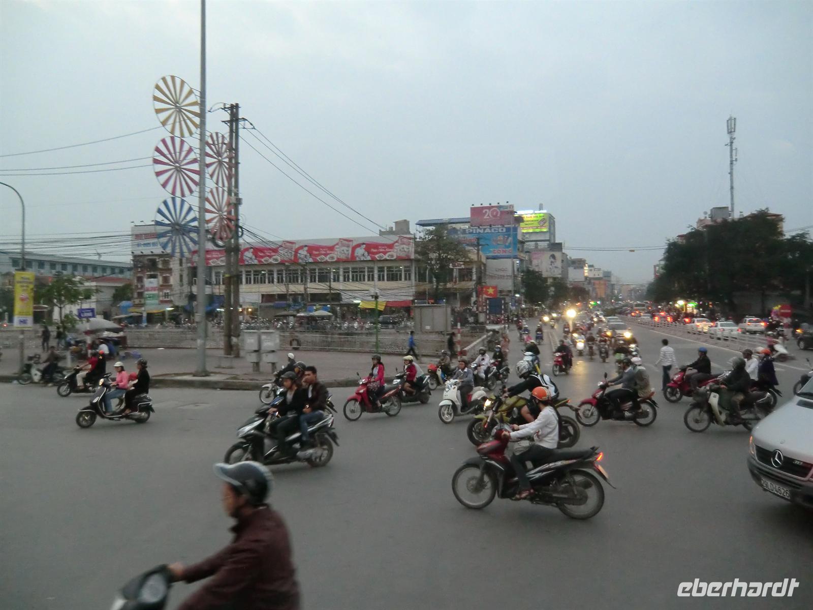 Nach einer kleinen Erfrischungspause im Hotel hieß es "Eintauchen" in das bunte und vor allem hupende Getümmel der Großstadt. Und wir staunten nicht schlecht, als wir dutzende Mopeds mit allerhand Personen und Gepäck an Bord durch die Straßen brausen sahen. Tuh lehrte uns zu allererst das Überqueren der Straße: einfach loslaufen ohne stehen zu bleiben - und siehe da, der Verkehr teilt sich recht und links und umfließt einen förmlich.