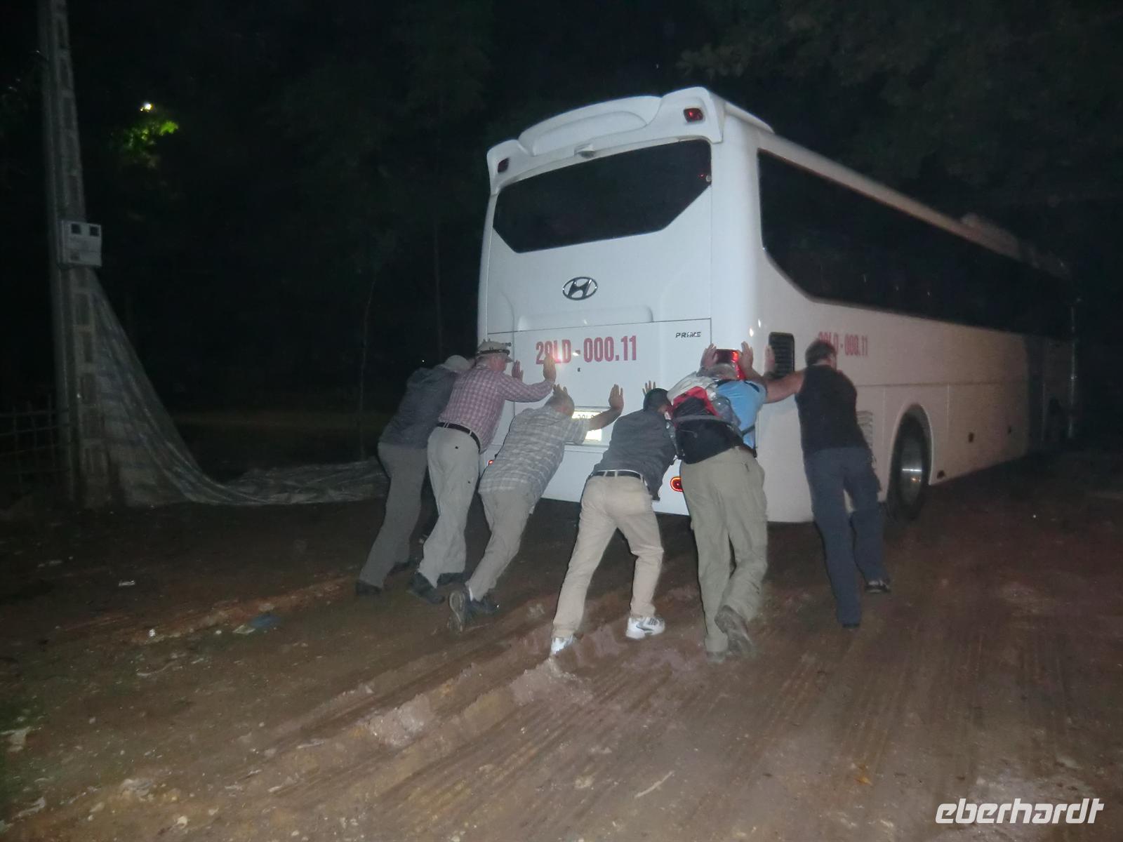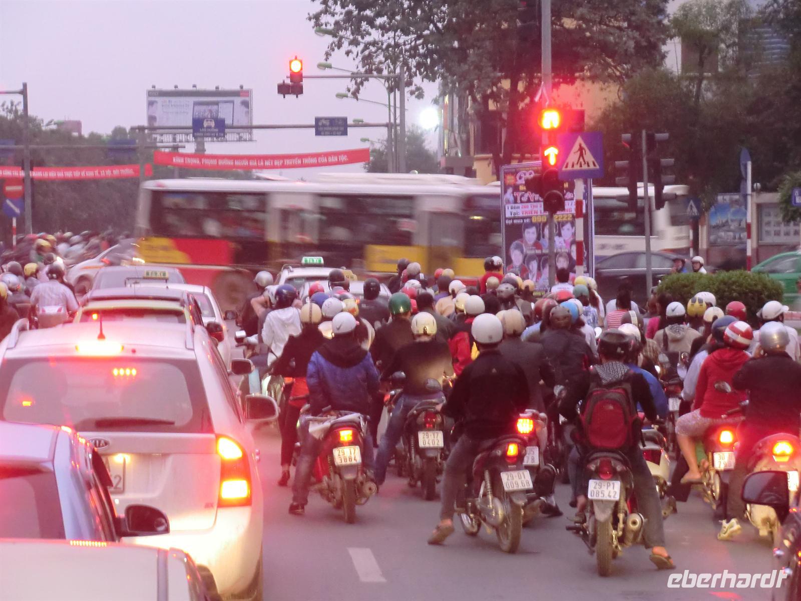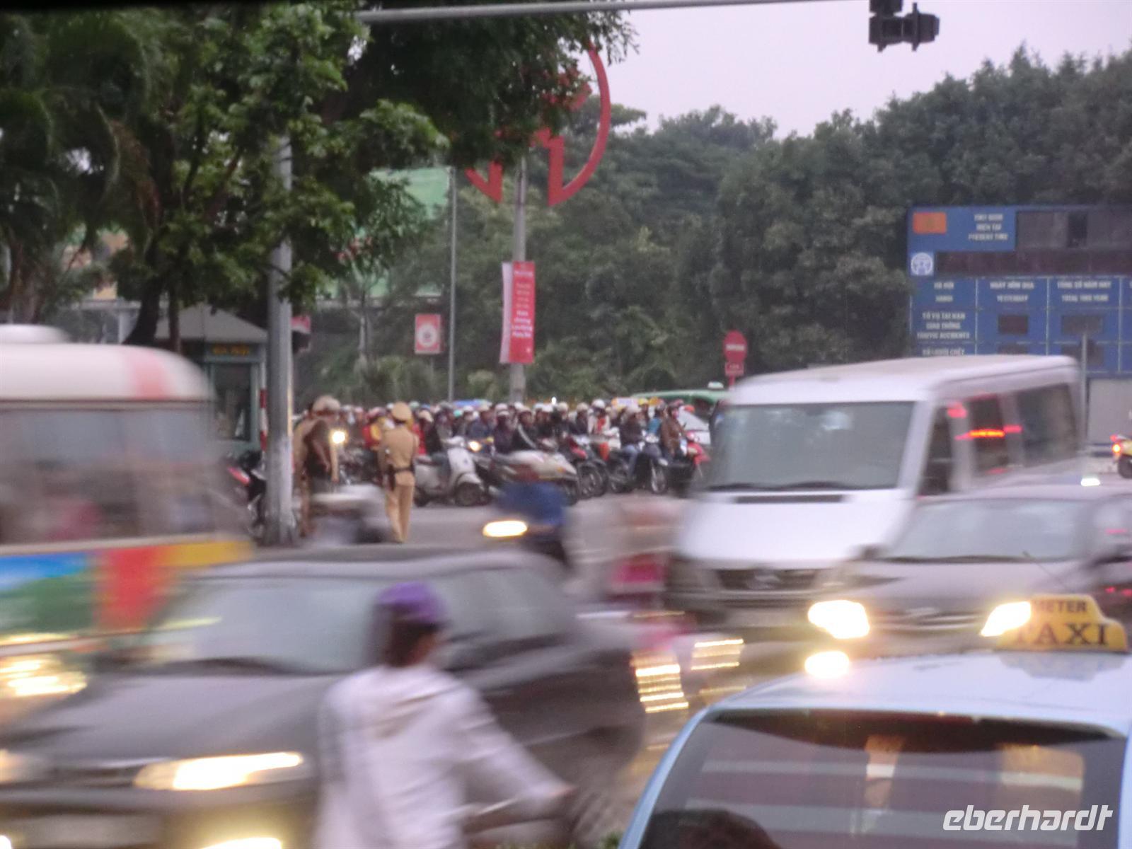 3:30 klingelte der Wecker. Nach einer kleinen Morgentoilette schnappte sich jeder sein Frühstücksbeutelchen und dann marschierten wir los, mit Taschenlampen bewaffnet, durch die Dunkelheit in Richtung Bus. Als wir diesen um 4 Uhr erreichten, teilte uns Lam mit, dass der Akku leer sei und ein Anschieben nötig sei. Und tatsächlich hatten wir dank unserer kräftigen Männer, die auch nach nur drei Stunden Schlaf voller Tatkraft steckten, Glück und konnten das Starten des Motors vernehmen. Und auf ging es zurück in Richtung Osten nach Hanoi. Aufgrund einer Konferenz von Interpol sollten die Hauptverkehrsstraßen an diesem Tag zwischen 7 und 10 Uhr gesperrt werden. Aus diesem Grund mussten wir vor dieser Sperrung durch die Hauptstadt hindurch sein. Dieses Vorhaben haben wir dank unseres Busfahrers und unseres zeitigen Aufstehens auch geschafft. 8:30 Uhr machten wir dann außerhalb der Tore Hanois eine