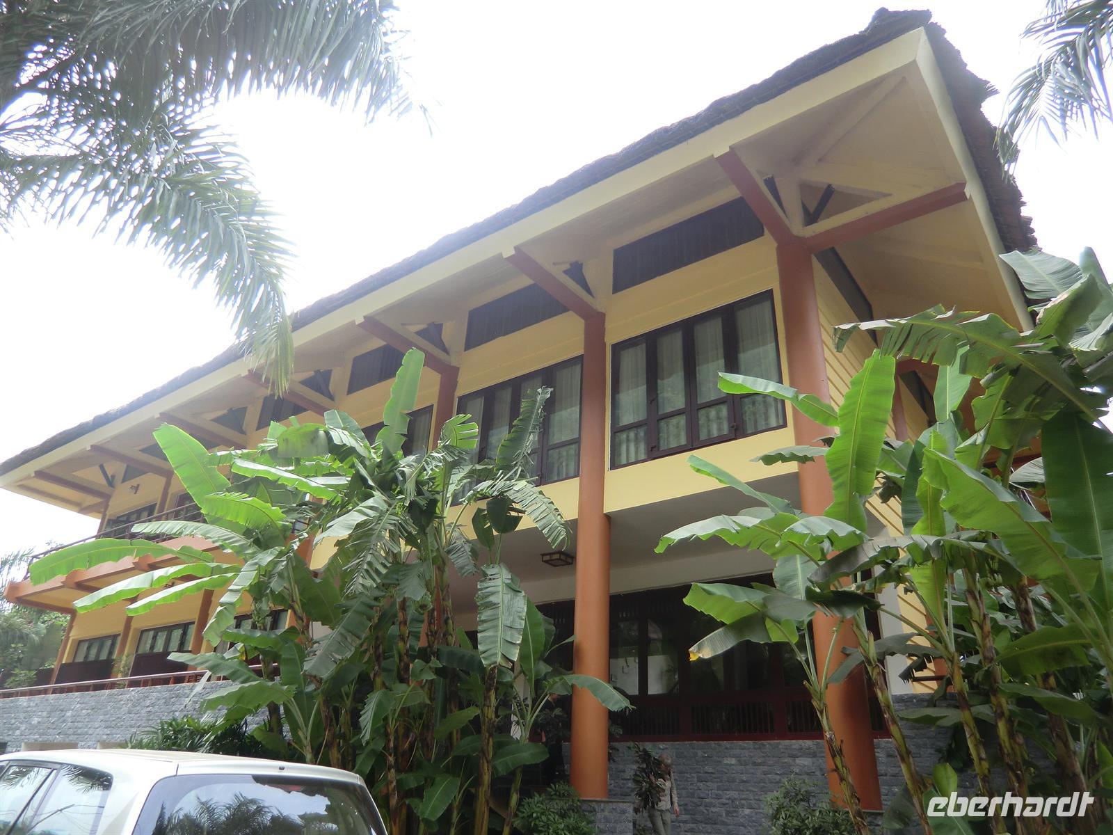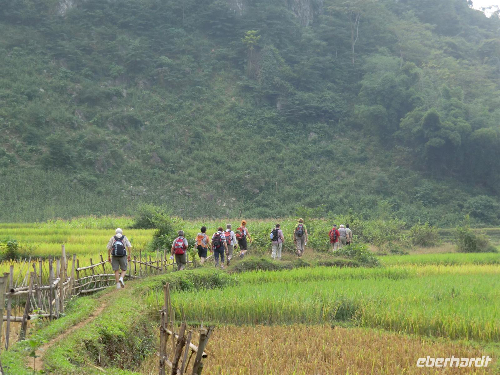 12:30 Uhr erreichten wir unser heutiges Übernachtungsziel: die Mai Chau Lodge, ein idyllisch am See gelegenes Hotel mit Bambusblättern gedecktem Dach. Nach einem 15minütigem Fußweg durch die Reisefelder erreichten wir das Dorf Pong Coong, wo wir ein schmackhaftes Mal in traumhafter Kulisse einnahmen - abgerundet von einer Tasse grünen Tee. Nach einer kleinen Erfrischungspause im Hotel machten wir uns auf zur ersten Wandertour. Startpunkt war das Örtchen Xam Khoe. Romantisch anmutende Pfade führten uns durch Reisefelder und kleine Dörfchen. Überall begegneten uns fleißige Erntearbeiter, winkende Kinder und Reisballen transportierende Frauen.