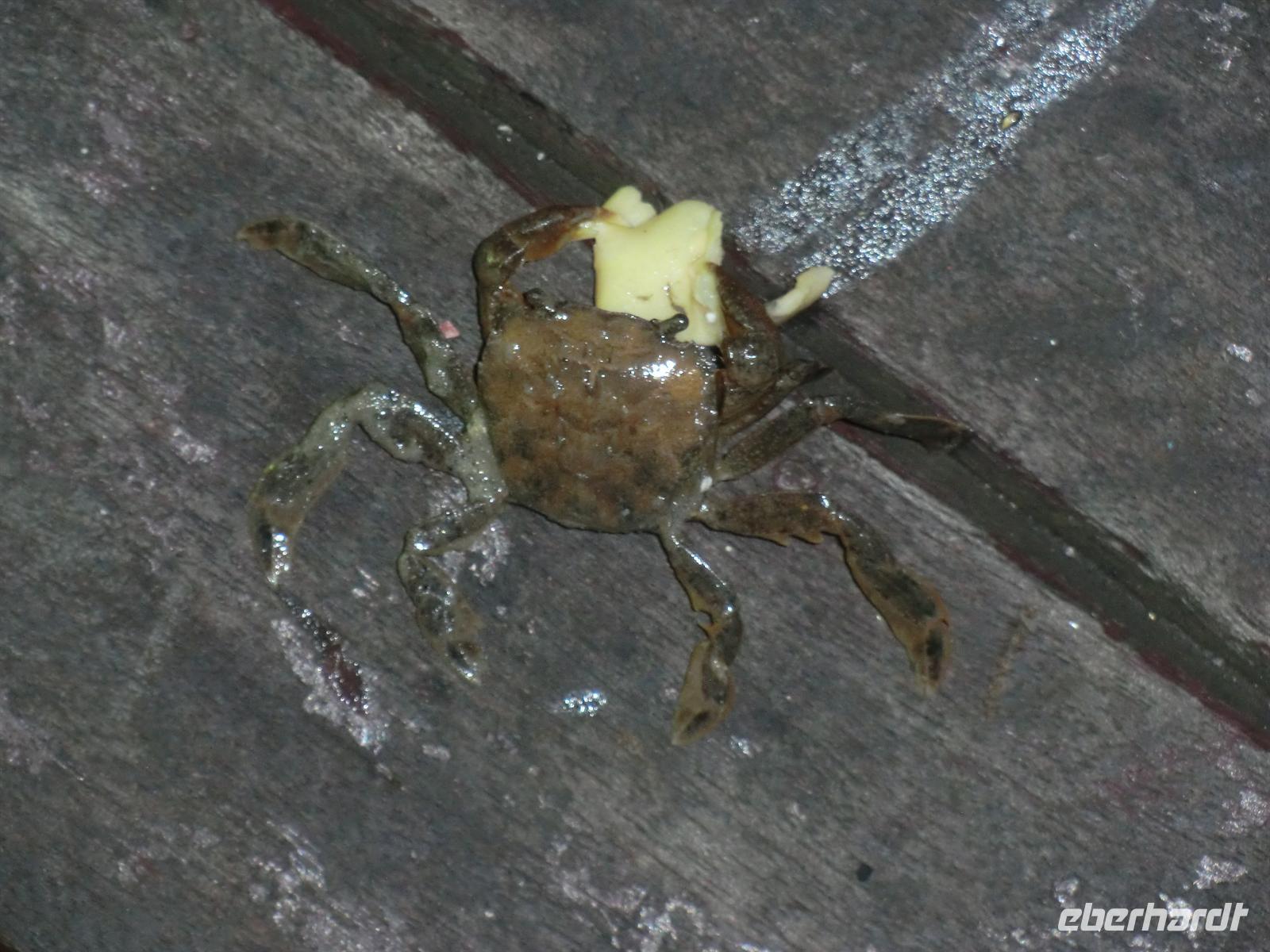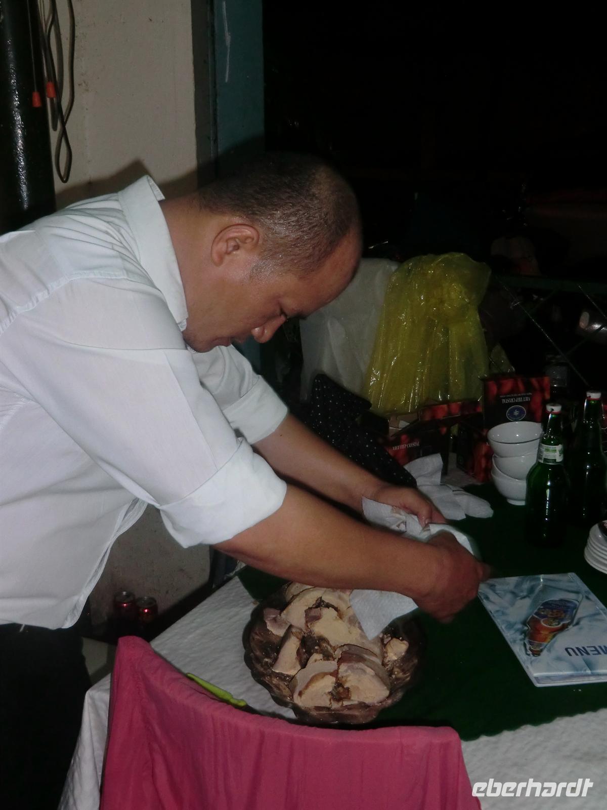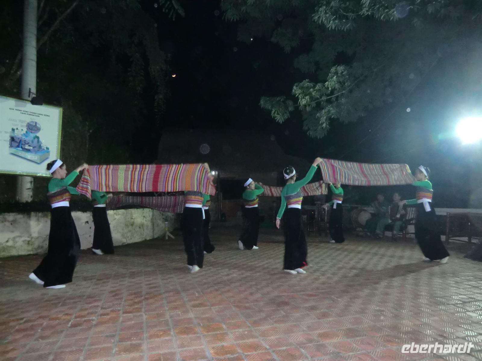 18:30 Uhr wurden wir im Freien unter unserem Schlaflager zu Tisch gebeten und als Vorspeise folgte eine wahre Spezialität: Hund und Heuschrecken. Die Überraschung war perfekt und einige Gesichter blickten ungläubig drein. Trotzdem waren fast alle tapfer und probierten von diesem Schmaus. Gefolgt von einigen Fläschchen Reisschnaps kündigte sich ein feuchtfröhlicher Abend an. Wir hatten das Glück, einer durch eine vietnamesische Familie gebuchten Tanzveranstaltung beizuwohnen, die in der Nachbarhütte stattfand. Diesmal konnten wir die traditionellen Lieder und Tänze schon mit trällern, da sie jenen vom Vortag stark ähnelten. Höhepunkt war auch hier ein Stück, das Onkel Ho zu Ehren getanzt und gesungen wird, abgerundet von einem Tonkrug mit Reisschnaps.