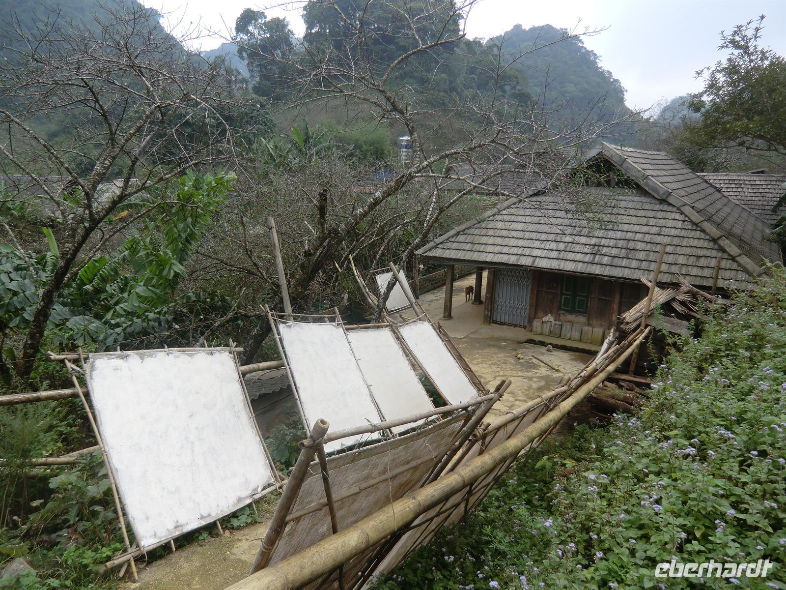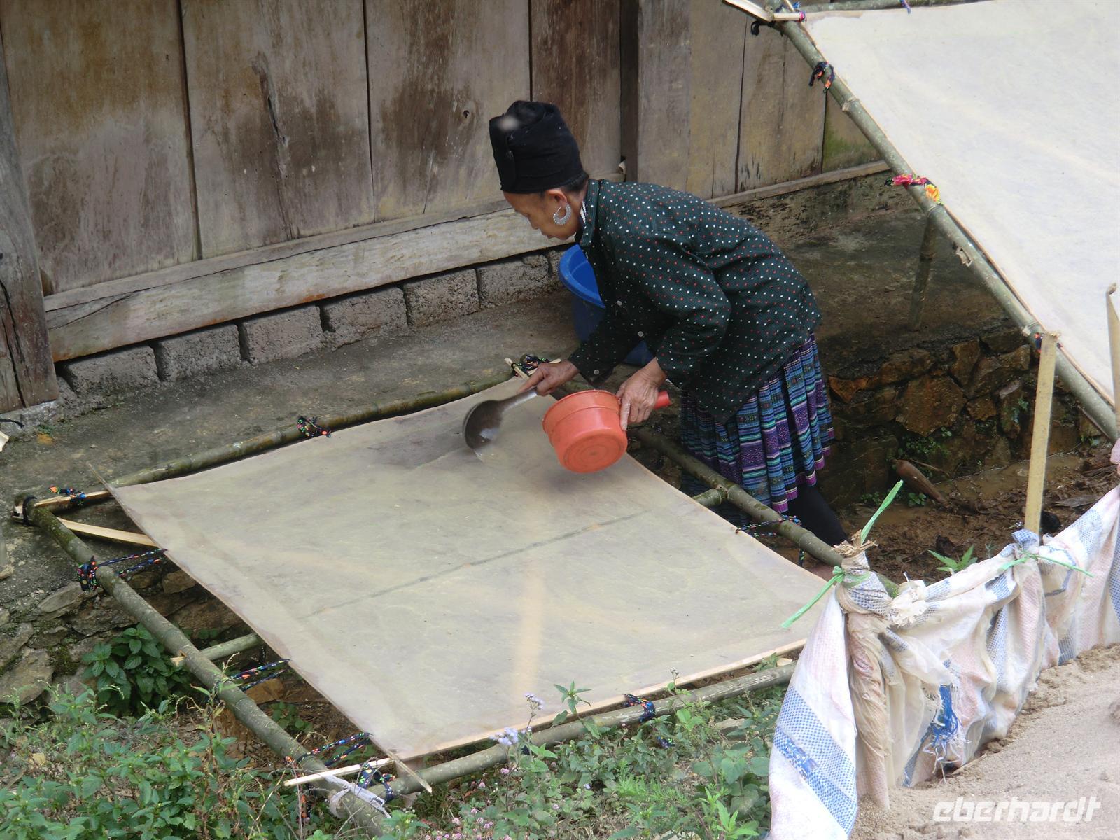 Heute starteten wir gemütlich in den Tag. Nach einem erneut sehr köstlichen und reichhaltigen Frühstück holte uns unser Bus 9:00 Uhr vom Hotel ab, um uns ins Dorf Sa Linh zu bringen - Ausgangspunkt unserer heutigen Wanderung. Insgesamt zehn Kilometer führte uns der Weg in ca. 1.200 Metern Höhe entlang einiger Hmong-Dörfer, in denen wir die traditionelle Art der Papierherstellung dieser Region bewundern konnten.