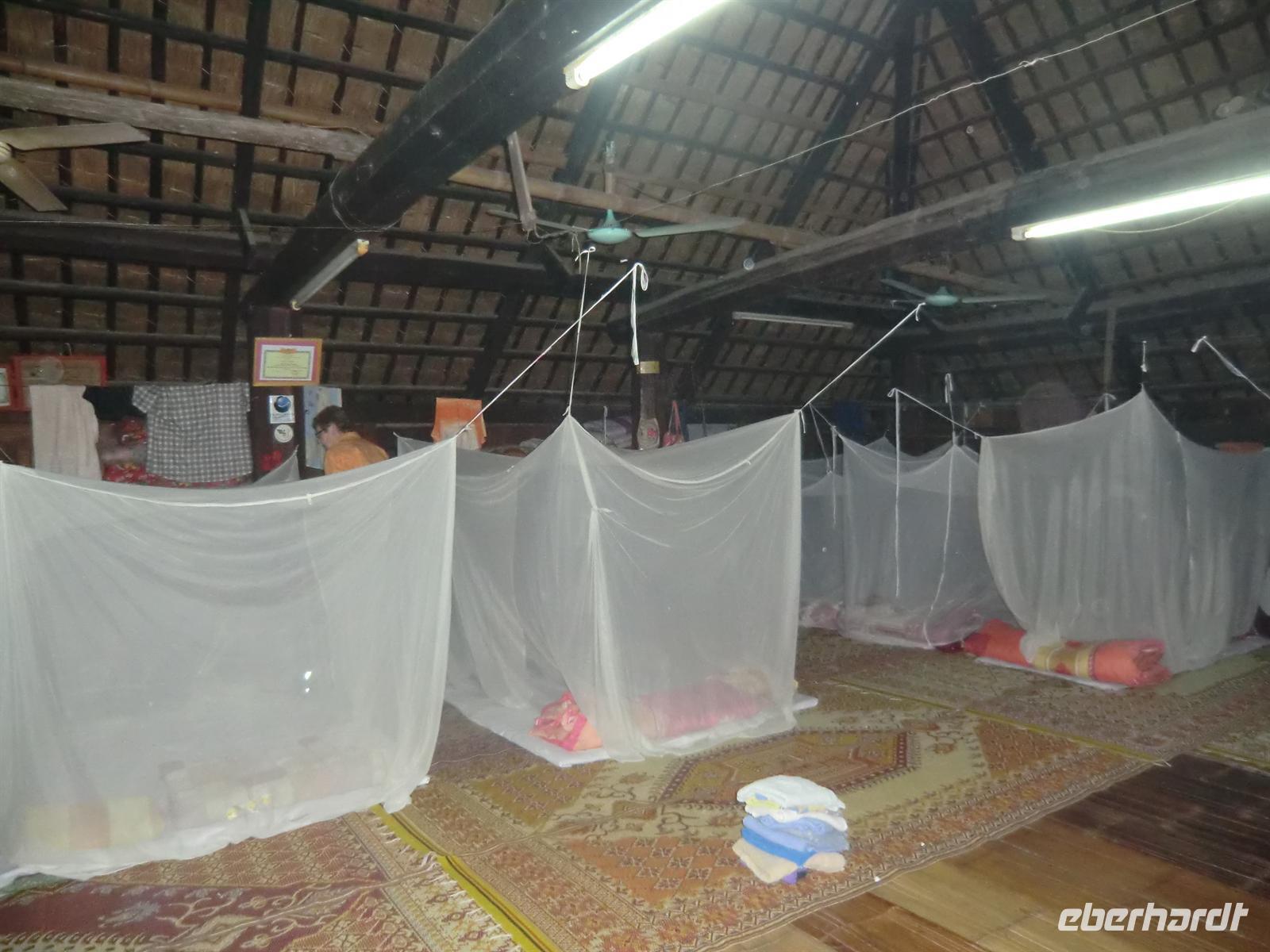 23:00 Uhr suchten wir dann schließlich unsere Matten auf, die inzwischen mit Moskitonetzen behangen wurden. Die ungewöhnliche Geräuschkulisse von lautem Zirpen, vietnamesischer Schlafmusik sowie durcheinander geratener Hähne und gelegentlicher Schnarcheinlagen ließ diese Nacht nicht sehr ergiebig werden.
