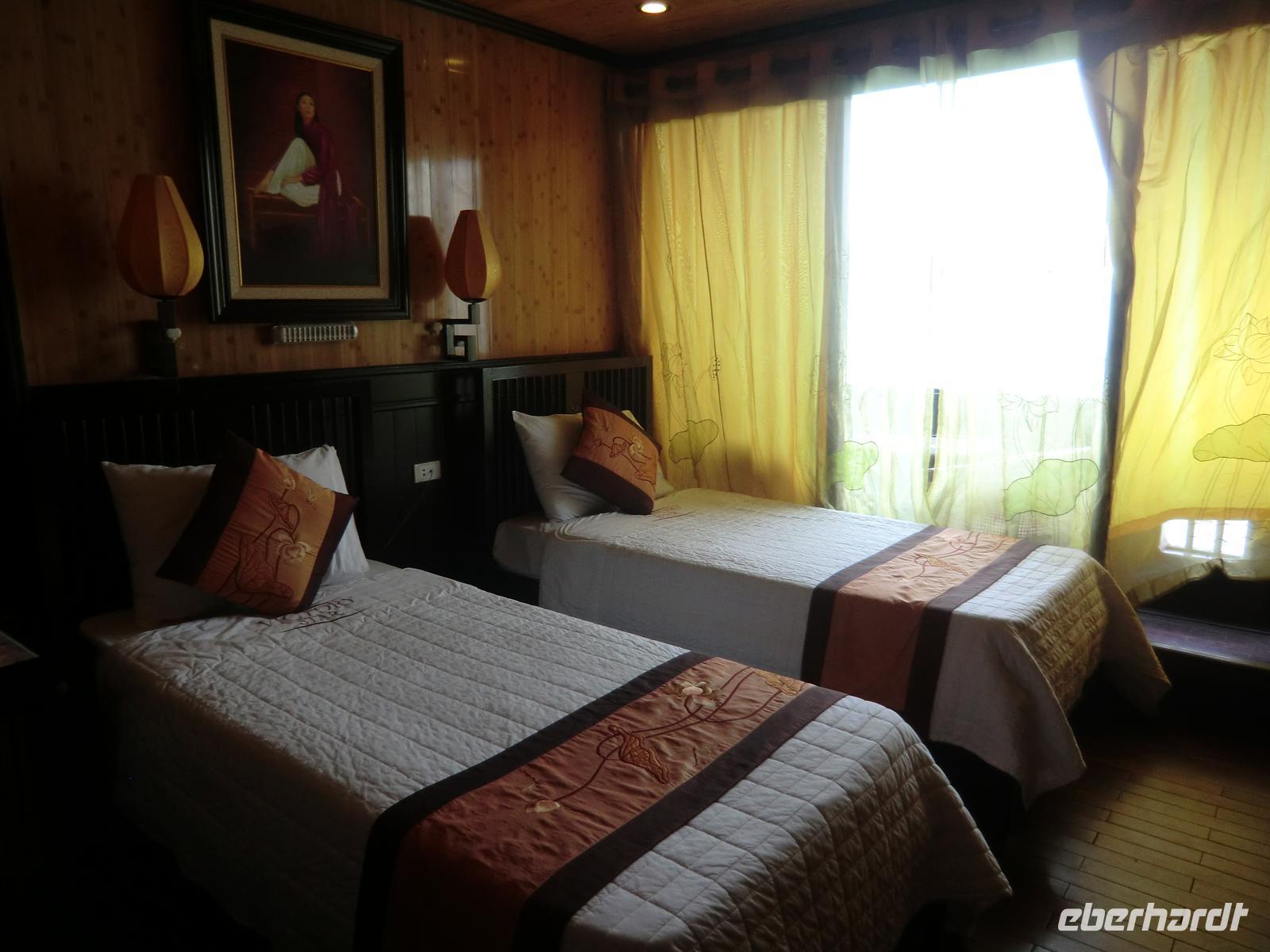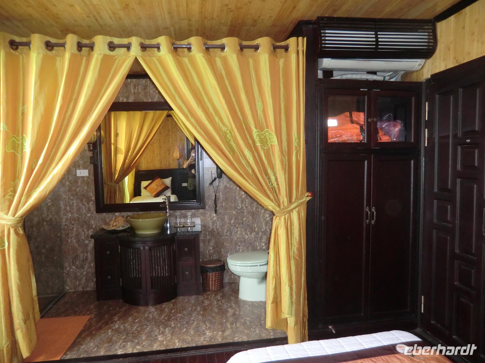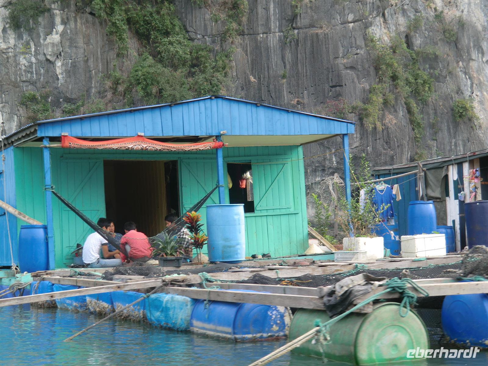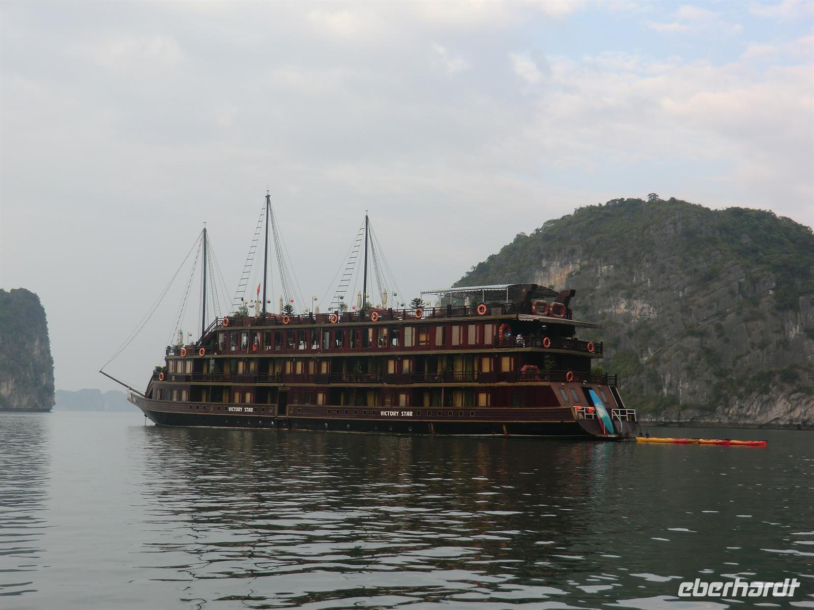 Frühstückspause in einem Handwerkszentrum für Lack-, Stick- und Seidenarbeiten. Dank des leckeren grünen Tees und Kaffees setzten wir die Fahrt zur Ha Long Bucht frisch und munter fort und erreichten diese 11:30 Uhr. Nach einem kleinen Teeempfang am Hafen von Hon Gai wurden wir 45 Minuten später vom Chef der Reederei „Victoria“ persönlich in Empfang genommen und zum Pier geführt. Ein kleines Beiboot transferierte uns zur Dschunke „Victoria Star“, wo wir mit herrlich kühlem Fencheltee und Erfrischungstüchern begrüßt wurden. Am obersten Deck erfolgte eine offizielle Begrüßung durch den Chef, der die insgesamt 43 Gäste aus 5 verschiedenen Nationen an Bord willkommen hieß. Im Anschluss erfolgte ein köstliches Meeresfrüchte-Mittagessen in äußerst stilvollem und gediegenem Ambiente. Mit Sonnencreme bewaffnet ging es am frühen Nachmittag per Beiboot zu einem kleinen Anlegesteg, von dem wiederum kleine Boote a 4 Personen für eine 40minütige Rundfahrt um die schwimmenden Dörfer starteten. So konnten wir die traumhaften Felsformationen von der Nähe aus betrachten und die Lebensweise der Bewohner auf ihren Hütten bewundern. Zurück an Bord schmissen wir uns sofort in unsere Badesachen, um uns im herrlich seichten Wasser der Bucht, in der wir vor Anker lagen, zu erfrischen. Es war herrlich uns absolut einmalig, in solch einer Kulisse zu schwimmen und zu plantschen.