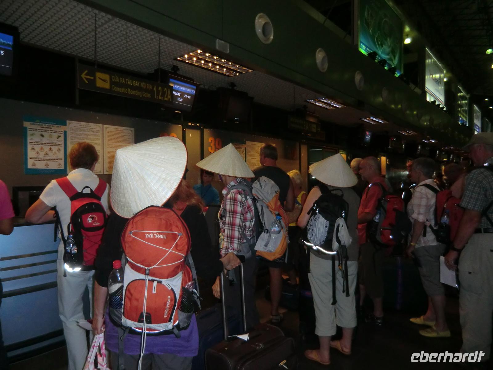 Pünktlich 9:30 Uhr trafen sich die Dresdner Reisegäste am Dresdner Flughafen bei guter Laune, um das Abenteuer Vietnam zu beginnen. Nach einem gemütlichen Frühstück landeten wir pünktlich in Frankfurt, um auf den Irrwegen des Flughafens bereits die erste Wanderetappe hinter und zu bringen. Zur Mittagszeit komplettierte sich unsere Gruppe durch die Gäste aus Leipzig und Berlin und so setzten wir 14:45 Uhr unsere Reise mit der Thai Airways fort. An Bord wurden wir von einem herrlich duftenden nach bunten Orchideen begrüßt. Der Flug wurde durch köstliche thailändische Kost und puppenhaft lächelnde Stewardessen versüßt.