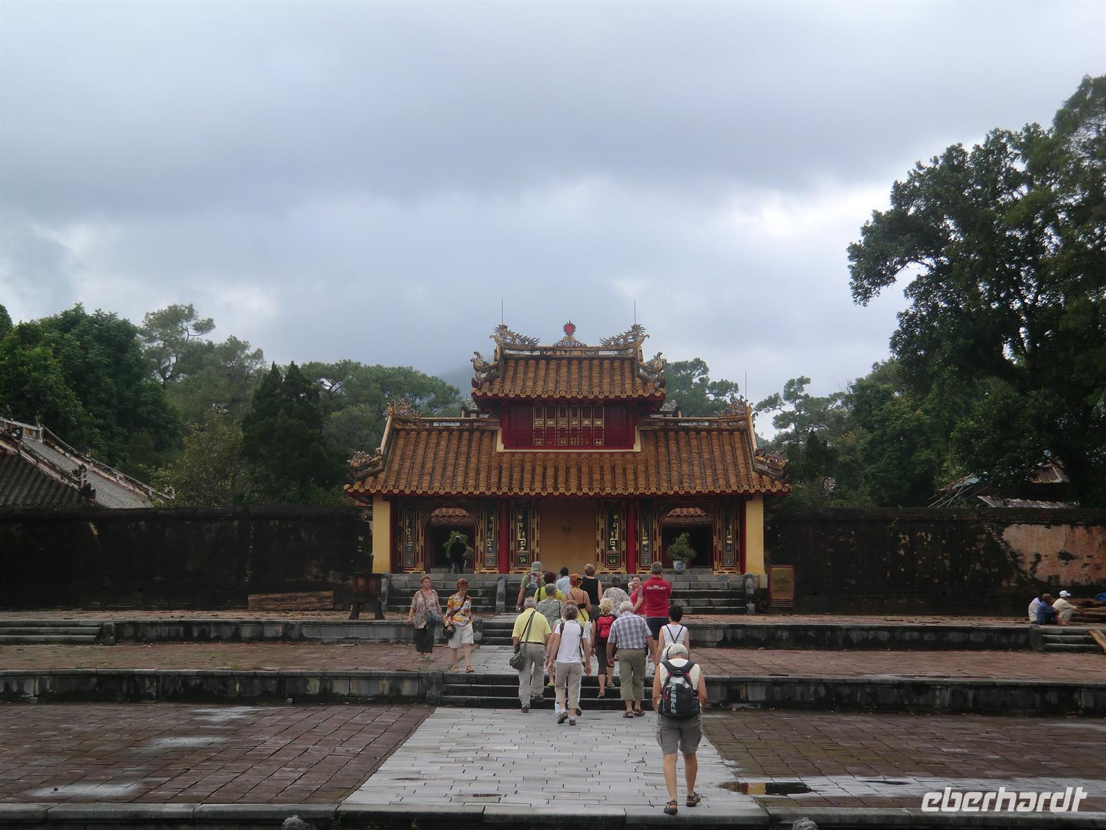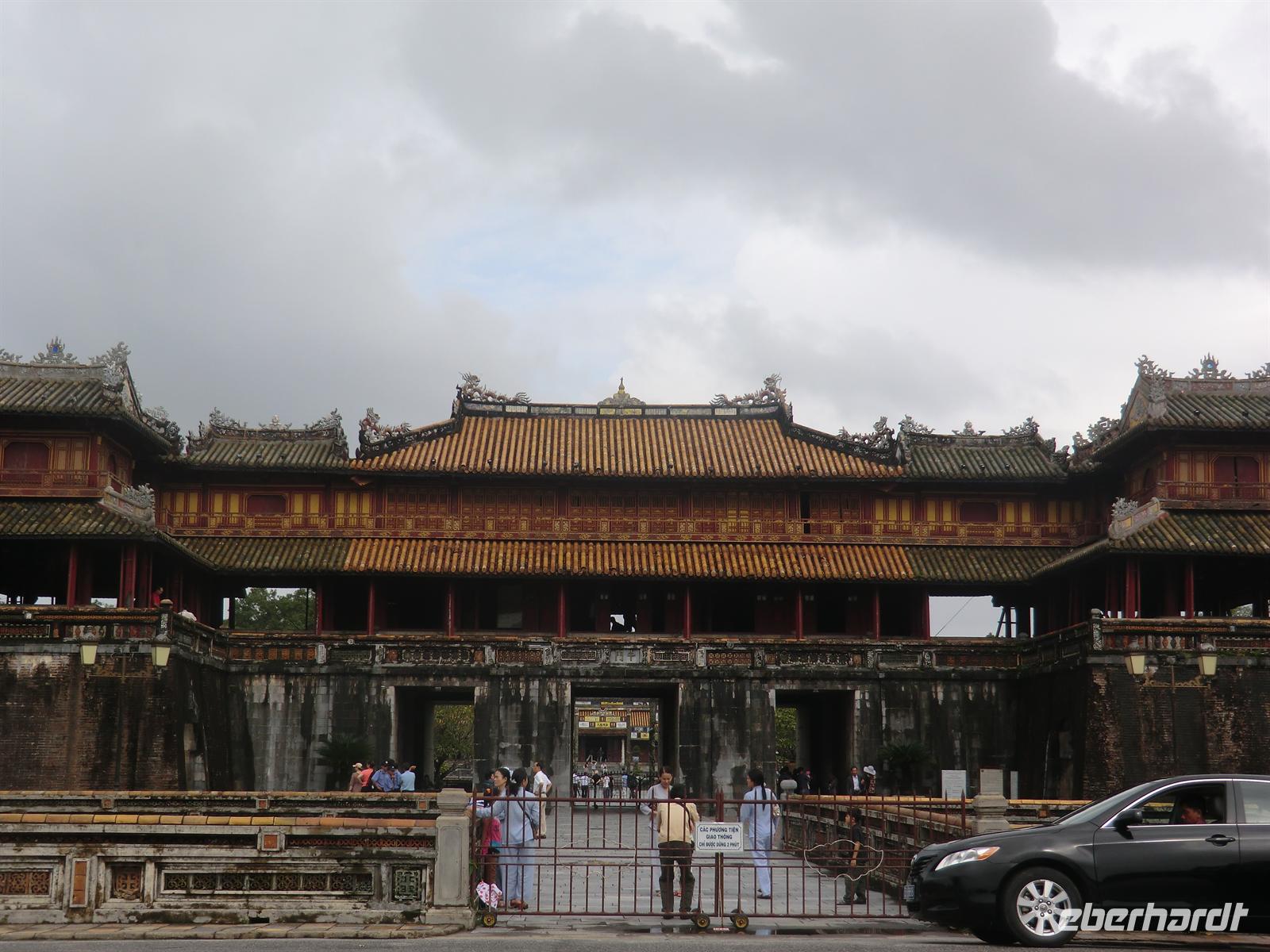 Um 7:00 Uhr erwartete uns erneut ein Frühstück der Extraklasse: ultrascharfe Nudelsuppe, Mango und Papaya zum Verlieben sowie allerlei süße Köstlichkeiten am Kuchenbuffet. 8:30 Uhr holte uns Binh zur Besichtigungstour ab und so ging es geradewegs in die alte Kaiserstadt. Unsere Eindrücke können schlichtweg mit dem Wort „phänomenal“ beschrieben werden. Eine wahnsinnig weiträumige Anlage, deren Restauration zwar geplant ist, aber wohl Jahrzehnte, wenn nicht Jahrhunderte, dauern wird.