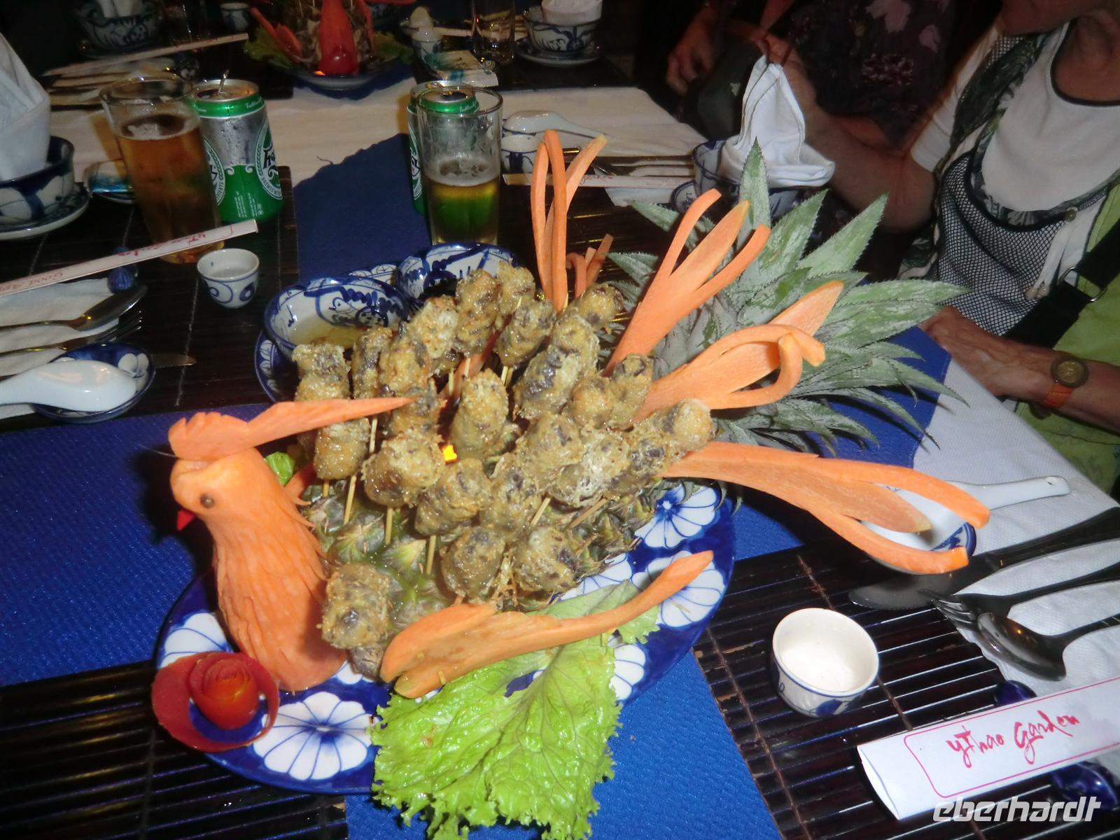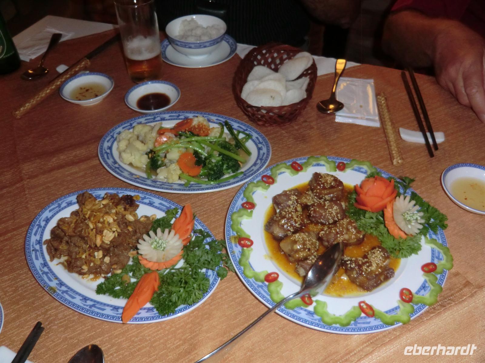 Frisch geschniegelt und gestriegelt trafen wir uns 19:30 an der Rezeption, um zum abendlichen Restaurant zu fahren, wo uns ein köstliches 8-Gänge Menü erwartete: Frühlingsrollen, Lotusreis, Shrimps und Küchlein aus grünen Bohnen. Ein Genuss, der uns perfekt träumen ließ.