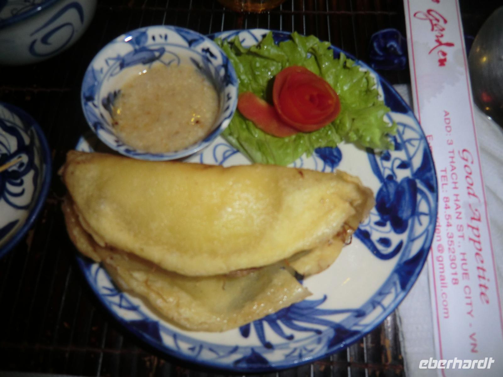 Auf der Brücke zwischen Haupteingang und Audienzsaal begrüßte uns eine gewaltige laut plantschende Versammlung von Koi-Karpfen und wünschte uns einen schönen Tag. Mit sehr viel Ruhe uns Zeit durchstreiften wir die "verbotene Stadt", den Ahnentempel und das Mutter-Haus. Nach etwa drei Stunden waren wir mit unserem Rundweg am Ende angelangt und steuerten ein typisches Straßenlokal im alten Kaiserviertel an. Eine wahre Spezialität waren frittierte Pfannkuchen gefüllt mit Meeresfrüchten und Schweinefleisch, die vor unsere Augen gebruzelt wurden. Kredenzt wurden ebenfalls köstliche Bratnudeln, Nudelsuppe und Eierkuchen. An Getränken gab es leckeren Ingwertee, Huda-Bier und frisch gepressten Orangensaft. Gegen 13:30 Uhr saßen wir wieder im Bus und fuhren ins ländliche Umland zu den Gräbern der Minh-Dynastie. Sensationeller Auftakt waren die ungewöhnlichen Toiletten, die äußerst traditionell anmuteten und unsere Lachmuskeln strapazierten. Nach einem kleinen Exkurs über chinesische Schriftzeichen und eindrucksvolle Grabmale erwischte uns am Ende der Besichtigungstour ein herrlich tropischer Regenguss. Doch ohne zu zetern strampelten wir die 15 km lange Radtour vom Busparkplatz bis zur alten Pagode vor den Stadttoren von Hue. Über holprige Straßen und idyllische Pfade bahnten wir uns den Weg durch das Umland. Wir konnten einen interessanten Einblick in das Leben der Dorfbewohner gewinnen, die an diesem Samstagabend im Familienkreis bei geöffneten Türen und Fenstern ihrer Fernsehserie lauschten und zu Abend aßen. Der Gegensatz zwischen faszinierender Natur, pulsierenden Städten und ärmlichen Vorstadtdörfchen ist enorm. Zur Dämmerung erreichten wir die Pagode und wurden 17:45 Uhr von unserem Busfahrer abgeholt und ins Hotel gebracht, wo eine heiße Dusche auf uns wartete.