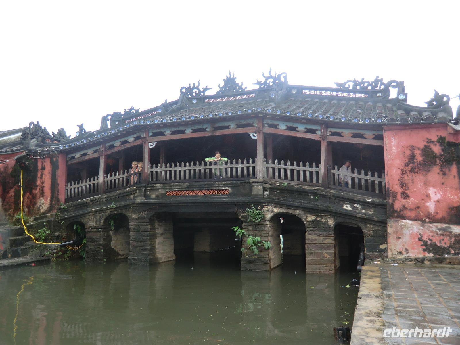 Natürlich haben wir den heutigen Tag aber auch kulturell begonnen, indem wir uns einen wunderschönen chinesischen Tempel, die "japanische Brücke" und ein traditionelles Wohnhaus angesehen haben. Begleitet war der Stadtrundgang von allerlei Wasser: von oben und auch von unten. Die Straßen waren teilweise unbefahrbar und lediglich barfuß zu durchwaten. Uwe erprobte sich im Kanufahren, als er sich aufs Boot einer Händlerin schwang, die nur auf diese Weise ihren nahe am Fluss gelegenen Laden erreichen konnte. Es war tatsächlich unglaublich, welche Wassermassen bereits seit dem gestrigen Abend runter prasselten. Zum Glück hatte uns das Hotel sowohl mit Schirmen als auch Badelatschen ausgestattet, so dass man dem Wasserguss entgegentreten konnte.