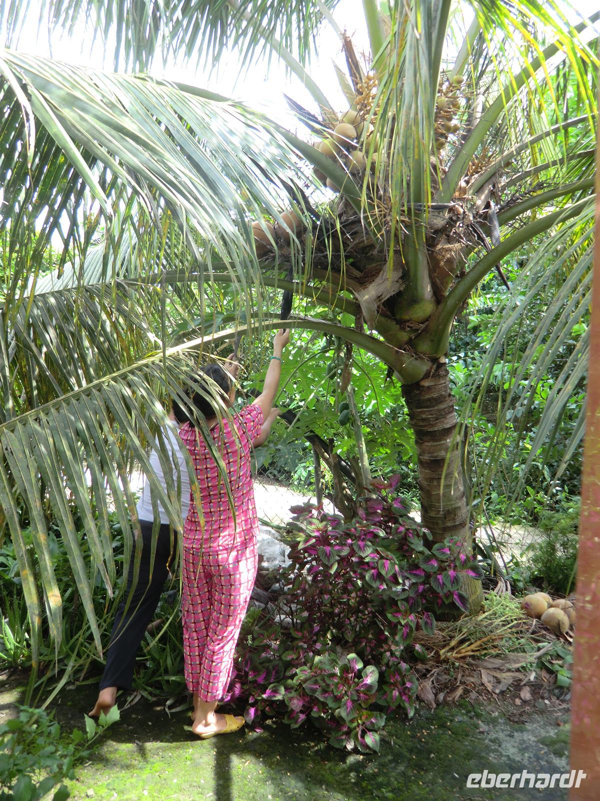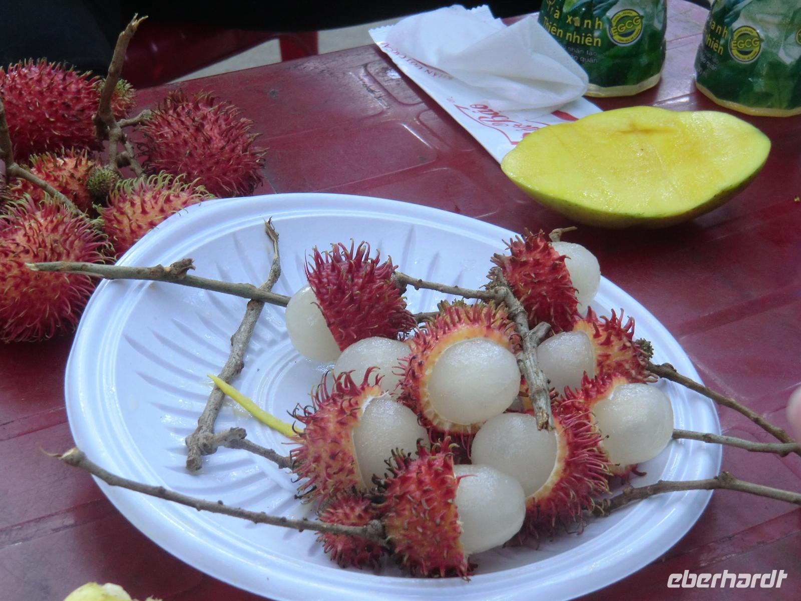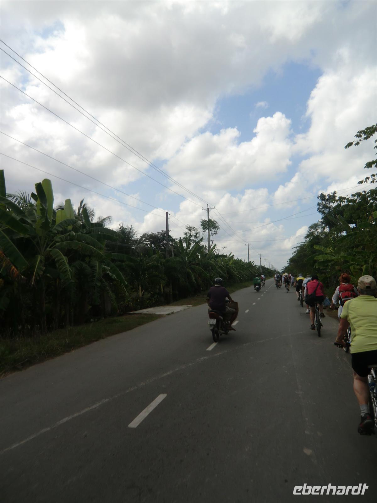 n schwimmenden Inseln arrangierte. Per Motorboot ging es zunächst los bis zu einem Obstcafé, wo und frische Mango, Papaya, Lichee und Ananas serviert wurde. Begleitet wurde das Ganze von köstlichem Jasmintee und einem Schälchen Chillisalz. Vietnamesen genießen frisches Obst oft zusammen mit diesem Salz, um den besonderen Geschmack zu unterstreichen. Mit einem kleinen Ruderboot durchkreuzten wir dann die von Bananenstauden und Papayasträuchern umgebenen kleinen Kanäle bis wir erneut die Motorboote erreichten, die auch unsere Räder an Bord transportierten. Mit dem Rad ging es auf eine 25km lange Tour hindurch das unglaubliche Grün kleiner Dörfer und den umgebenden Obstplantagen.