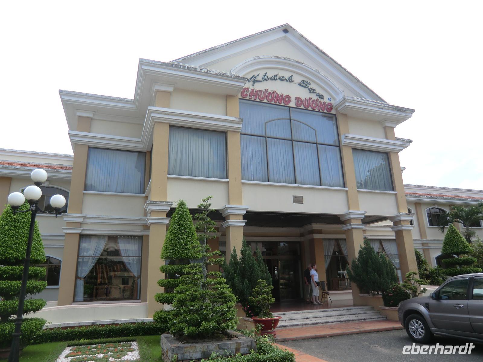 Erfrischt schwangen wir uns erneut auf die Räder - für die zweite Etappe, die gegen 16:30 Uhr an den schwimmenden Märkten von Cai Be endete. Ringsum wurde der Markttag beendet, die Kinder fuhren per Rad von der Schule heim und die nicht verkauften Waren wurden per Moped nach Hause gebracht bzw. zum Abendessen zubereitet. Dies alles erlebten wir hautnah, denn alle hatten wir ein und denselben schmalen Weg zu passieren - ein unfassbares Gewusel in allen Richtungen. Per Fähre erreichten wir dann unseren Bus auf der anderen Kanalseite. Auf vier Rädern ging es dann weiter Richtung Süden bis nach Tra Vinh. Nach über zwei Stunden Fahrt erreichten wir das Hotel Cuu Long, wo wir nach einer kurzen Erfrischungspause auch zu Abend aßen. Zum Essen stießen wir mit wohl temperiertem Rotwein an, den uns Christian von der Agentur Inbound Asia - verantwortlich für unser Reiseprogramm - gesponsert hatte.