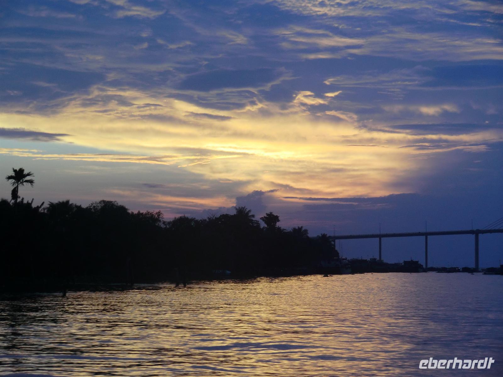 Zum Sonnenuntergang bestiegen wir erneut die Fähre und fuhren in romantischem Licht der über dem Mekong untergehenden Sonne zu unserem Hotel zurück. Nach einer erfrischenden Dusche genossen wir am Abend unser wohl verdientes Abendessen im Freien vor dem Hotel. Köstlicher Fisch, zu einem großen Ballon geformter süßer Klebereis und Shrimps begleitet von herrlich kühlem vietnamesischem Bier - ohne Eis ;-)