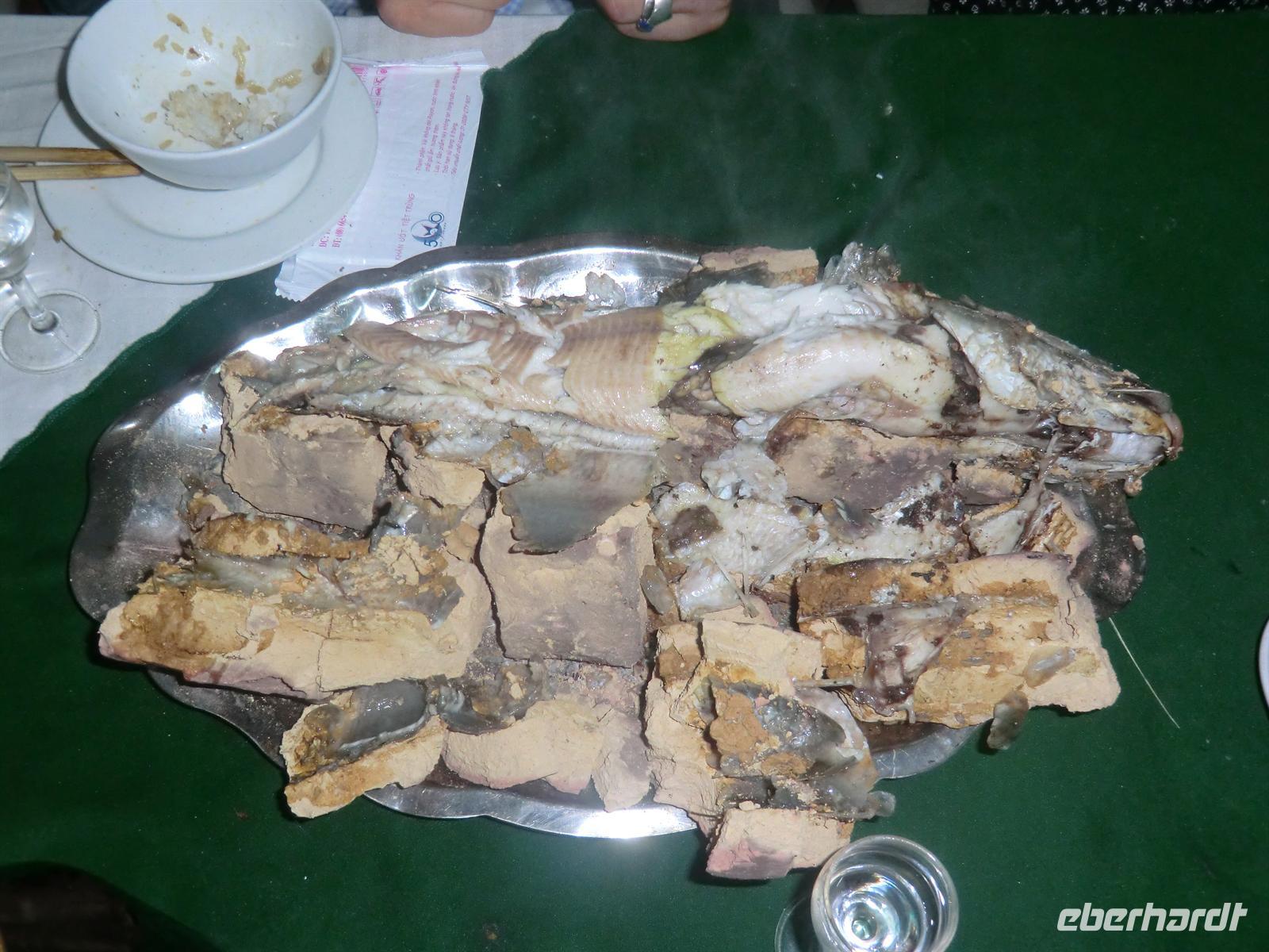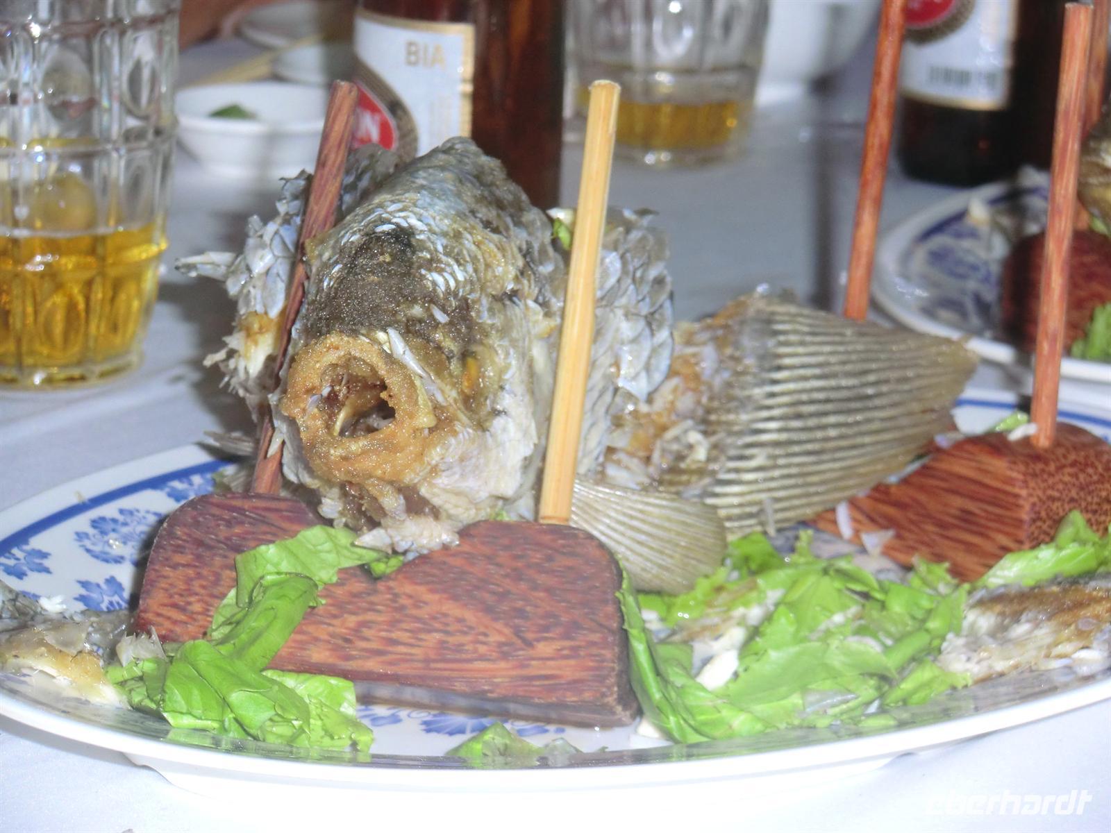 abschließenden Grillabend aufzubrechen. Nach einem 5minütigen Fußweg fanden wir uns im bunten und lauten Treiben eines Grillrestaurants wieder, vor dessen Eingang uns bereits der emsig arbeitende Chef begrüßte und zu unserer bestellten Tafel führte. Zunächst gab es Bier und Reisschnaps für alle, bevor wir uns über das köstlich in Zimt, Sojasauce und Knoblauch eingelegte Rindfleisch hermachten, dass wir selbst auf unserem Tisch grillten. Wie immer gab es dazu Reis und leckeren Wasserspinat. Eine weitere Delikatesse waren vier in Schlamm gebackene Hammerkopffische, deren Fleisch förmlich auf der Zunge zerging. Das Ambiente und der angeregte Trubel machten unser letztes gemeinsames Essen zu einem wahren Highlight! Um uns jedoch außerdem in Ruhe voneinander verabschieden zu können, nahmen wir zurück im Hotel noch einen kühlen Drink in der Hotelbar ein, wo wir in geselliger Runde nochmals unsere abenteuerliche und lustige Reise Revue passieren ließen.