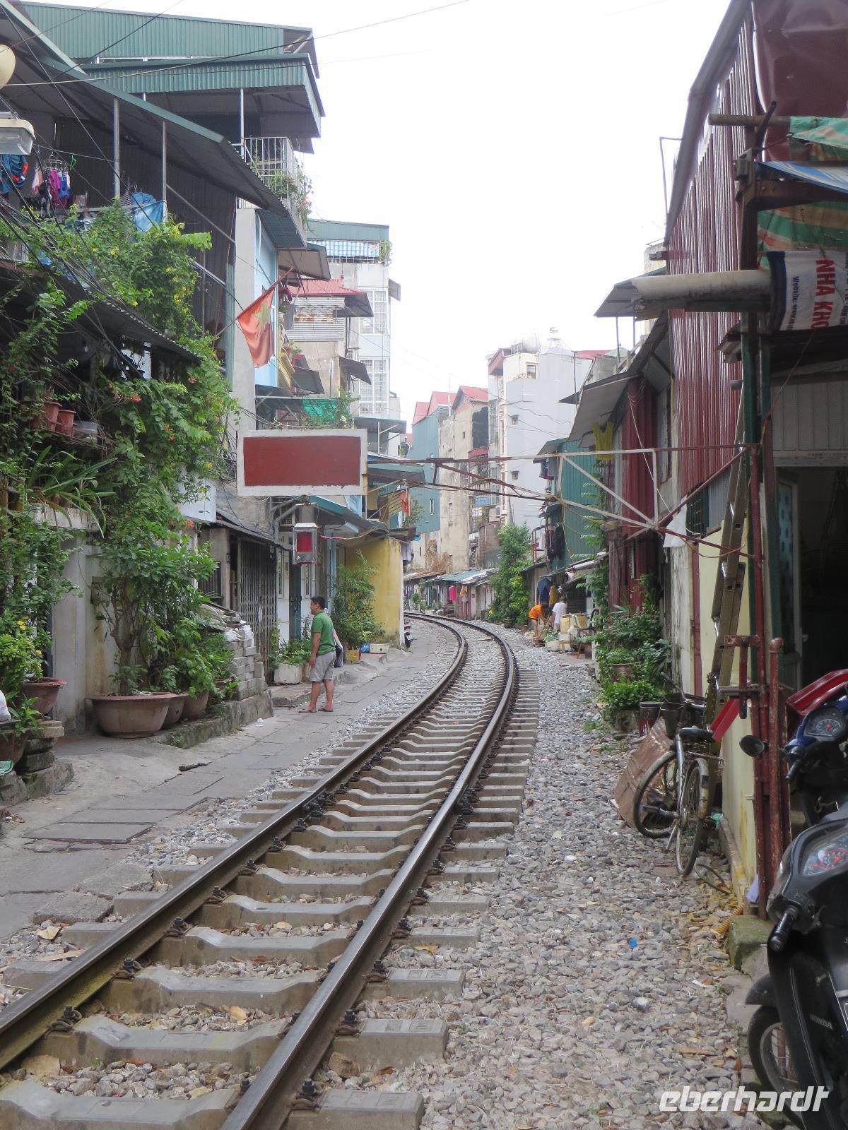 Nach der Stärkung geht es weiter zu der Herstellung der traditionellen Bilder für das Tet-Fest. Han muss auch als Übersetzer herhalten, und wir sind begeistert. Im Anschluss gehen wir zur deutschen Botschaft und kommen auf dem Weg an der Strecke des Wiedervereinigungszugs längs. Unglaublich, dass er durch diese engen Gassen fahren kann.