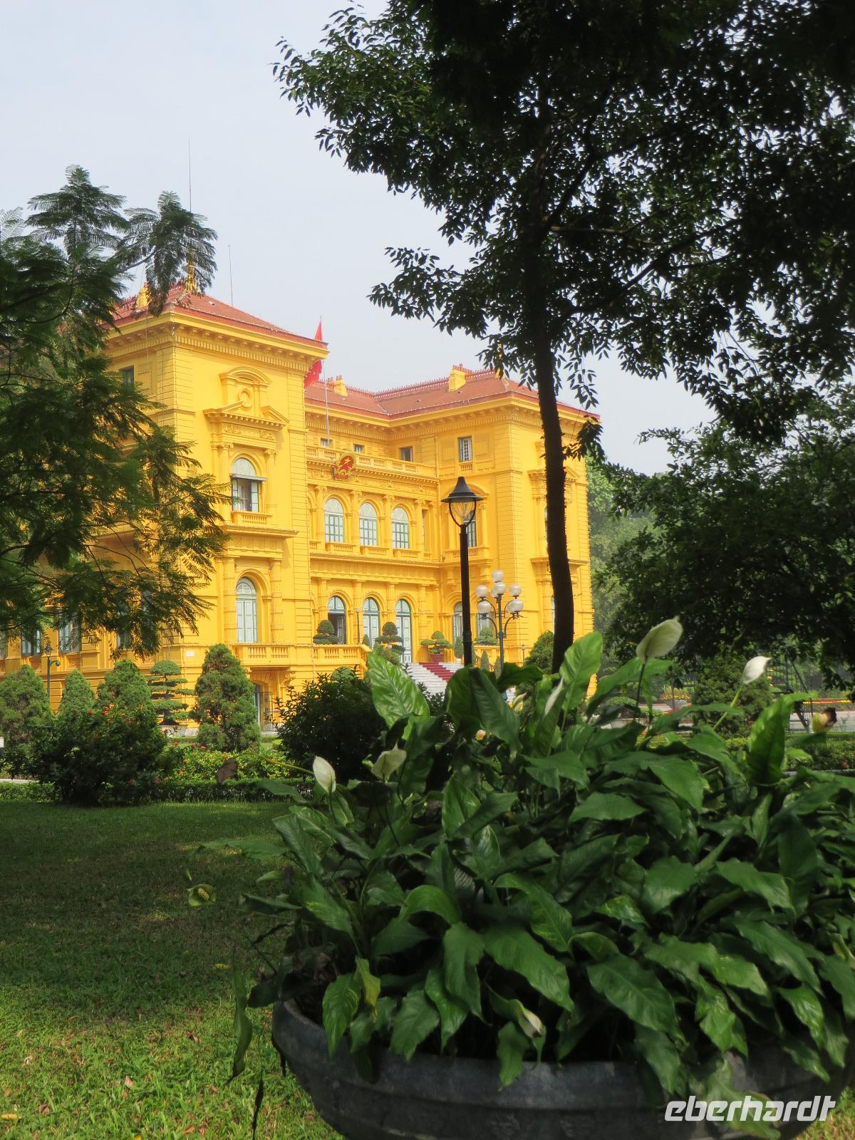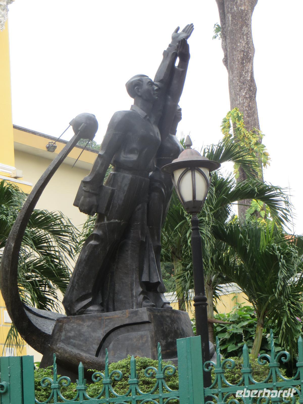 Der nächste Tag startet mit einem leckeren Frühstück und dem bereits kennen- und liebengelernten vietnamesischen Kaffee. So gestärkt starten wir mit Han zu unserer Stadtrundfahrt, vorbei an den Straßen, auf denen sich das ganze Leben abspielt. Die Bürgersteige wirken oft wie das "verlängerte Wohnzimmer" - hier wird gekocht, gegessen, der Friseur arbeitet hier, es ist alles direkt hier zu finden. Unser erster Stopp heute morgen ist das Mausoleum von "Onkel Ho", Ho Chi Minh. Er ist selber zur Zeit nicht da (er wird wohl "restauriert" ) und so schauen wir uns das Mausoleum von außen an, und beobachten die Wachablöse. Han erzählt uns Vieles aus dem Leben des Ho Chi Minh, der nach wie vor einen sehr prägenden Einfluß auf Vietnam hat. Anschließend besichtigen wir seine ehemaligen Wohnhäuser. Er lebte auch kurzzeitig im ehemaligen Gouvaneurspalast, dieser war ihm jedoch zu groß und der Palast wird seither hauptsächlich für repräsentative Zwecke genutzt.