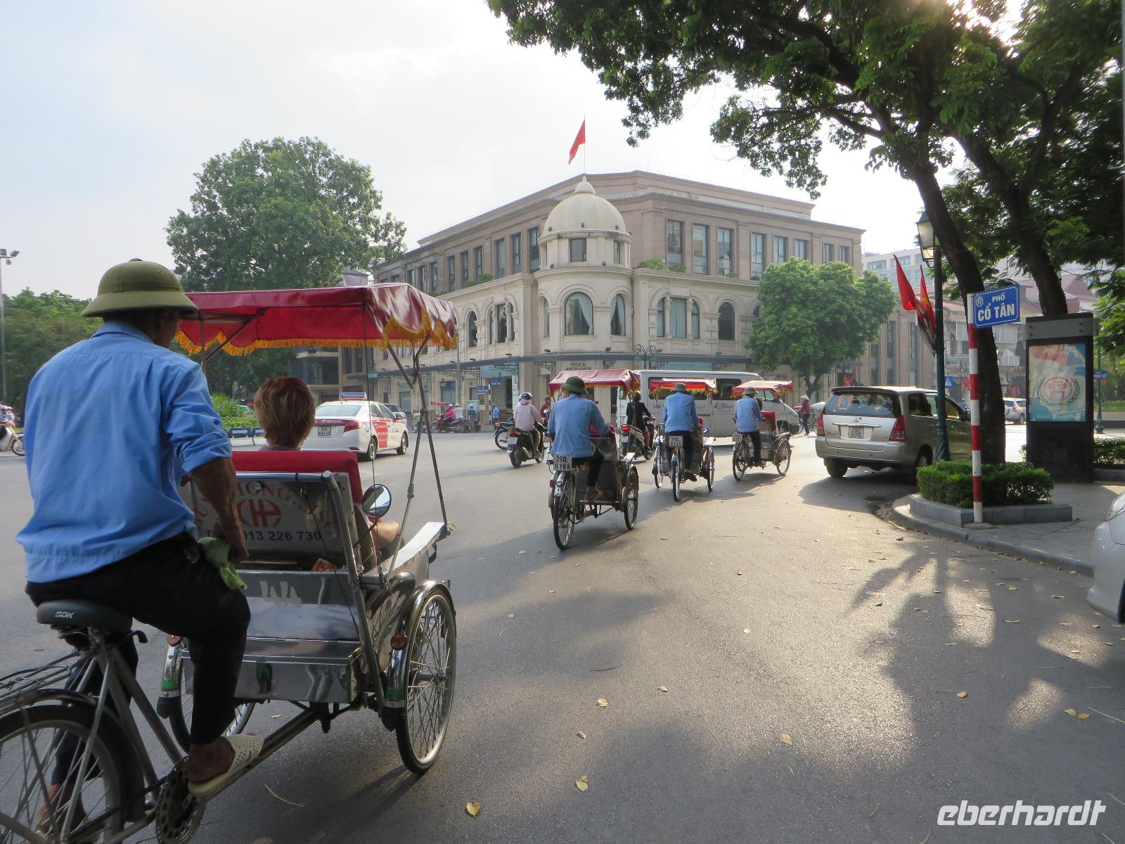 Weiter geht es mit dem Bus zurück gen Innenstadt. Wir besichtigen die Kathedrale und die Oper, wo wir auch auf unsere Rikschafahrer treffen. Ein absolutes Foto-Muss!!! Eine Stunde lang genießen wir die Fahrt durch die quirligen und engen Straßen der Altstadt, bevor wir pünktlich am Wasserpuppentheater abgesetzt werden. Viele von uns nutzen die Chance bei der Rikschafahrt, den überquellenden Verkehr der Stadt festzuhalten! Das Wasserpuppentheater ist der krönende Abschluß des Tages. Uns werden diverese Szenen aus dem Alltagsleben der nördlichen Vietnamesen gezeigt.